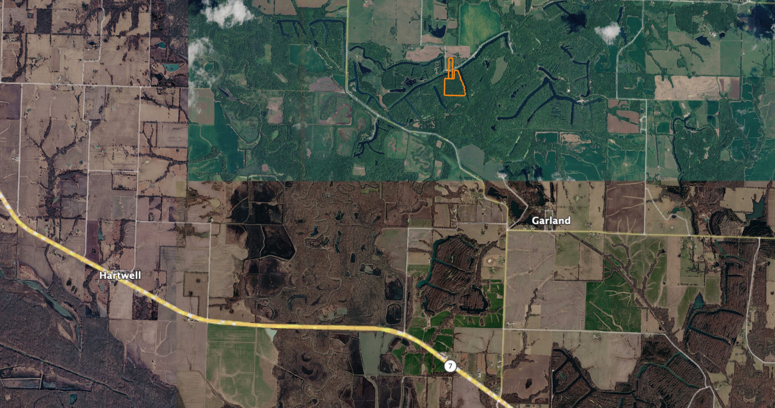 A 3-acre open area provides an excellent location for a cabin or campsite, already equipped with power and water in place, along with fiber internet available—a rare convenience for a property that feels this secluded. A 40’ shipping container is also included, offering secure storage for equipment, fishing gear, or recreational vehicles.