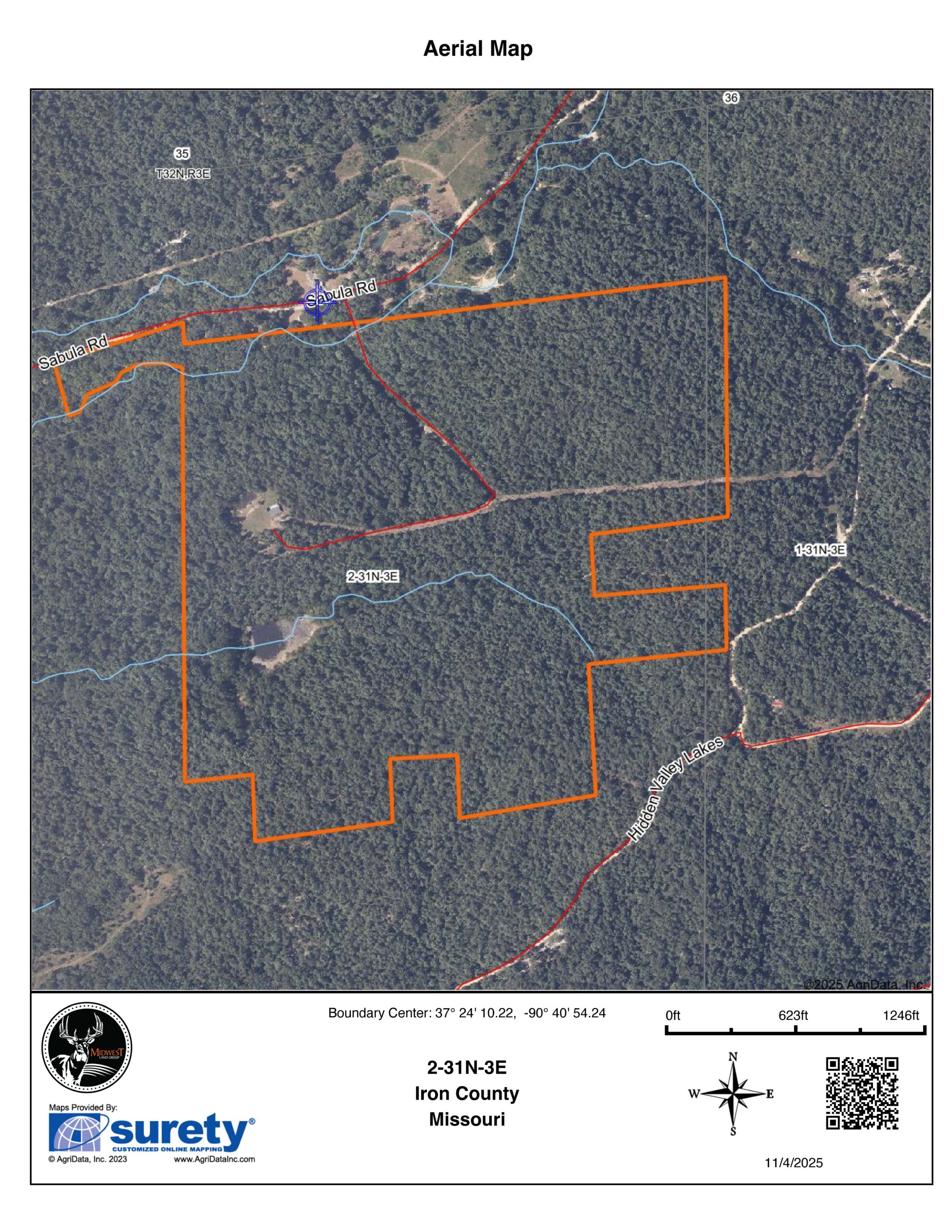 Located just north of Annapolis in Iron County, Missouri, this 131 +/- acre property offers a nice blend of natural beauty, recreational opportunity, and a mix of marketable timber. A well-maintained interior trail system makes exploring the land both easy and enjoyable. A cozy 2-bedroom, 1-bath log-sided cabin sits perched on a ridgetop overlooking a pond, complete with inviting covered porches perfect for relaxing and taking in the surroundings. Hunters will appreciate the abundant deer and turkey that frequent the area, making it a prime location for a hunting camp. The property is equipped with essential utilities, including a well, electricity, and a septic system. Tucked away in the timber, a hidden 1.5-acre lake adds to the allure, offering a secluded spot for fishing. Rounding out the features on the property is a beautiful year-round creek. If having your own private playground isn't enough, this property is in close proximity to thousands of acres of Mark Twain National Forest, as well as the renowned Black River for fishing and floating opportunities.Property Features