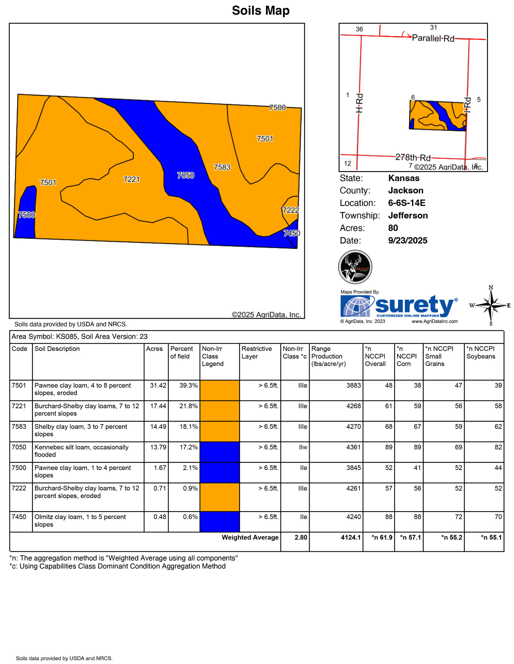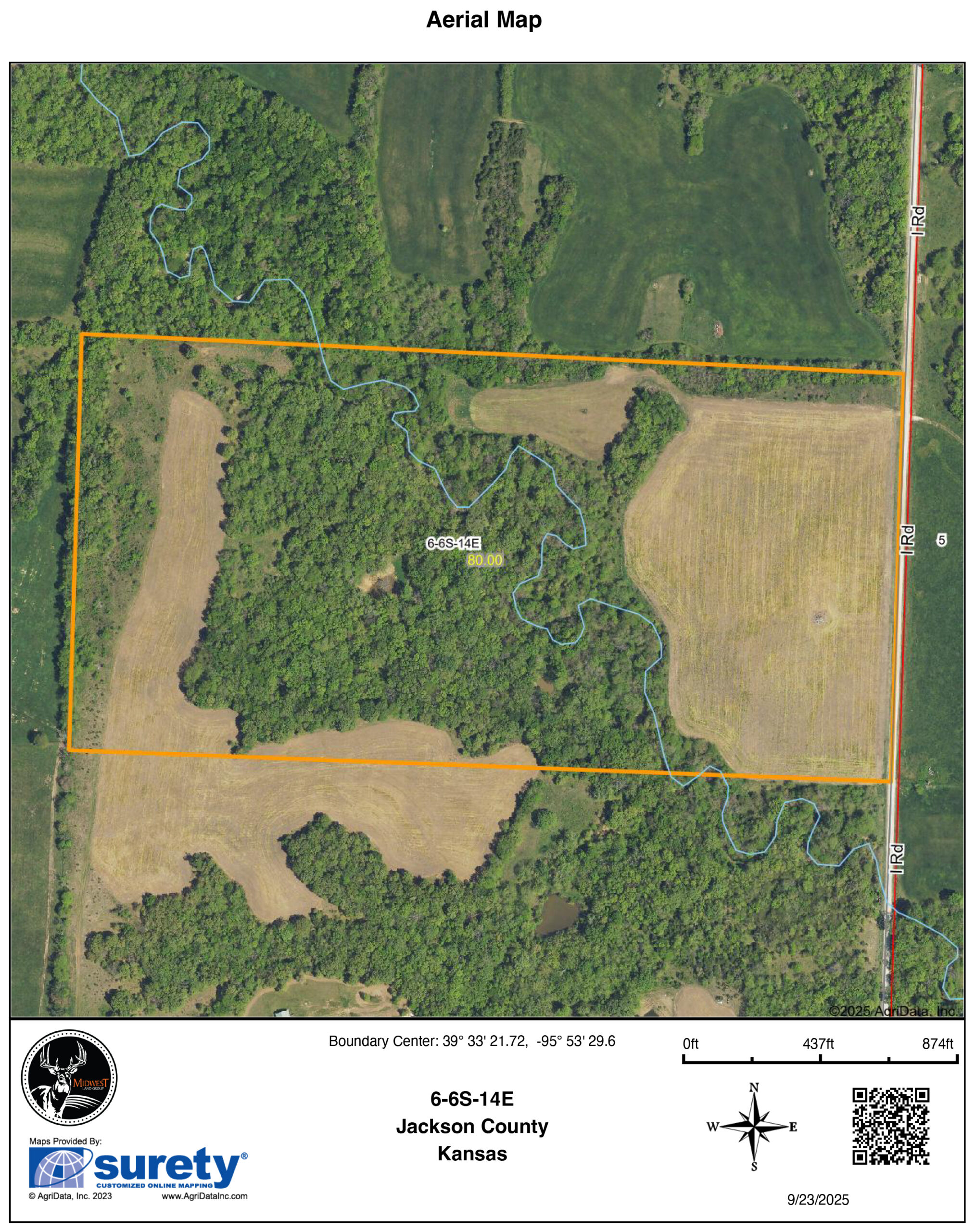This 80 +/- acre property is located in Jackson County, just northwest of Circleville, Kansas. The property is full of diversity with creek-bottom tillable fields, warm-season native grass edges, and hardwood timber ridges! It has 30 +/- tillable acres actively in production, primarily made of Class III clay loam soils with well-kept fields. The remaining 50 +/- acres consist of warm-season native grass edges, a large creek, and giant mature hardwood timber ridges. The native grass has a great mix of little bluestem, big bluestem, and Indiangrass. The timber is mixed with oak, hedge, and eastern red cedar trees. A large creek winds throughout the property, providing year-round water and a natural travel corridor for wildlife. There are also multiple watering ponds on the property.The diverse habitat with abundant food and water creates some of the best whitetail deer, turkey, and upland bird hunting that Kansas has to offer! The property is located in Kansas Deer Management Unit 9 and has excellent whitetail deer numbers. The property would also make a great building site as it is located on a well-maintained, year-round gravel road with electricity and rural water nearby. A recorded easement also provides access from 278th Road to the southwest boundary of the property. Seller-owned mineral rights will transfer to the buyer at closing. There is an oral year-to-year cash rent lease agreement in place on the tillable acres. This premier hunting property has a little bit of everything, from tillable income, native grass, mature timber, a large creek, and great hunting! Showings are by appointment only, and an agent must be present to enter the property. For additional information, disclosures, or to schedule a showing, contact Trent Siegle at (620) 767-2926.