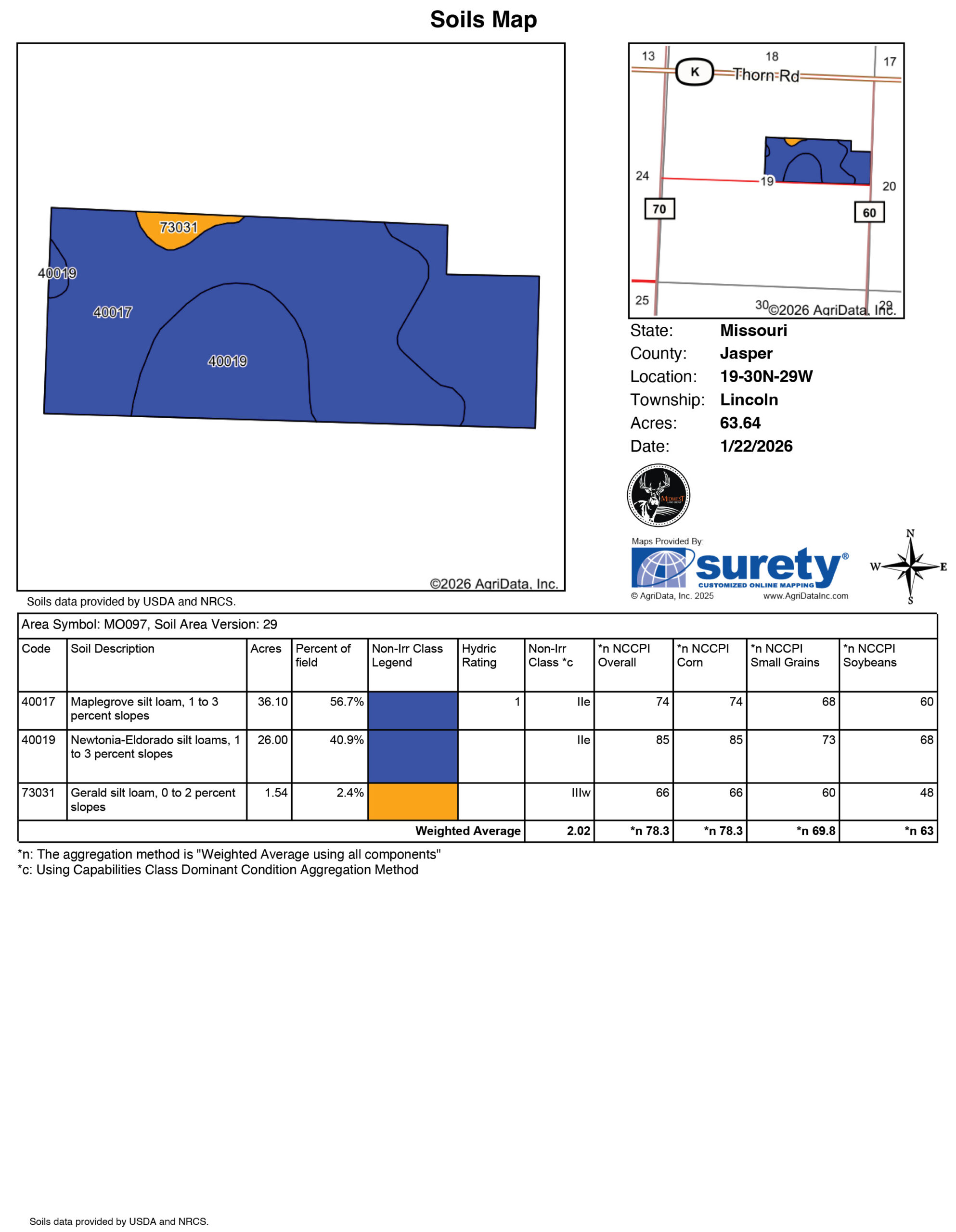What an opportunity to own a highly productive tillable farm in Jasper County, Missouri! This 61.8 +/- acre tract is 100% tillable and boasts almost exclusively Class II soils. A mix of Maplegrove and Newtonia silt loams make this farm great for row crop production. Spring planting is right around the corner, and this farm is ready to go.If you are looking for acreage to develop, build that dream home, and also farm, this property is a great fit. Electric is at the road and two sides of blacktop road frontage back this tract, highly developable. Less than 20 minute drive to Carthage, Golden City, and Jasper, this farm is in a great location with easy access to amenities. Call land agent Kellen Bounous today to schedule a showing!