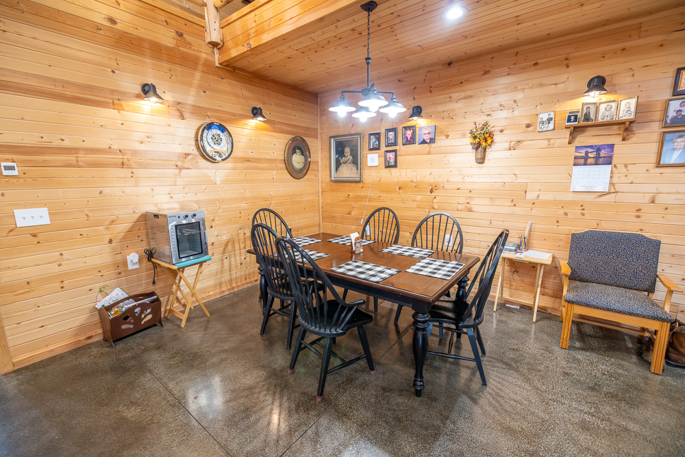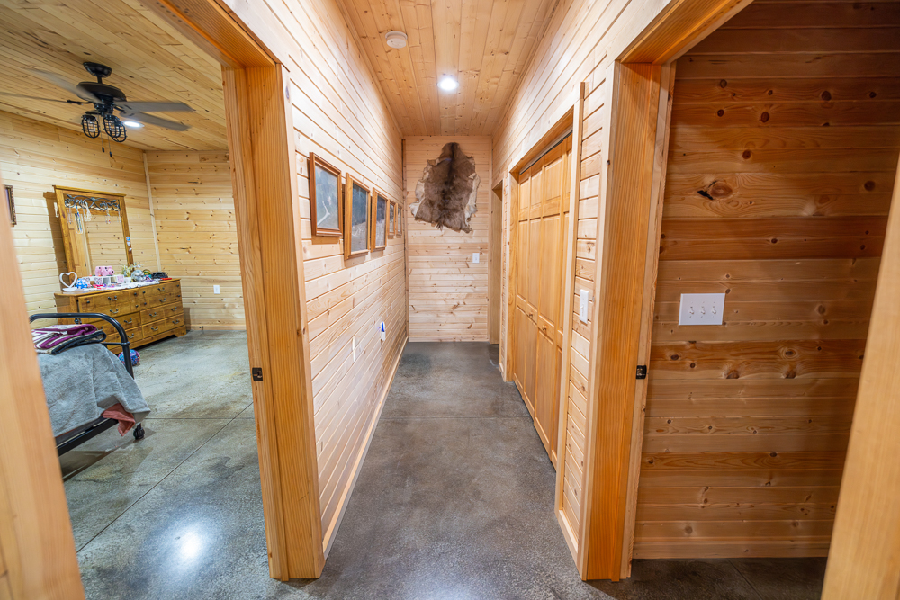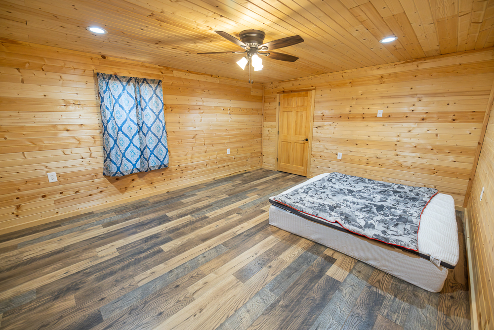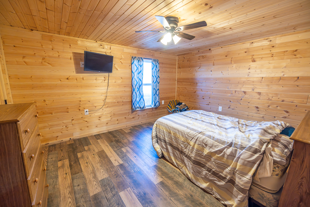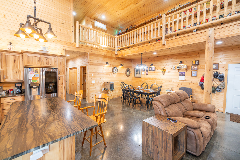While the exterior is modest and understated, the moment you step inside, the home makes a lasting impression. The interior is fully finished in rich tongue-and-groove pine, walls and ceilings alike, creating a warm, lodge-style atmosphere with timeless appeal and no drywall anywhere in the home.