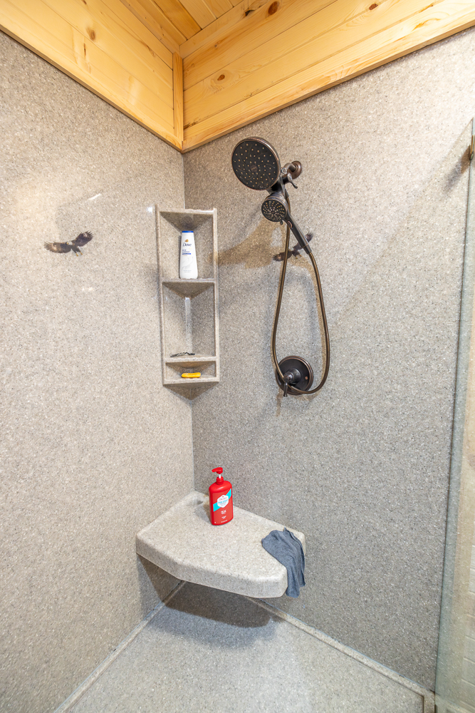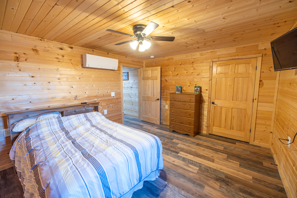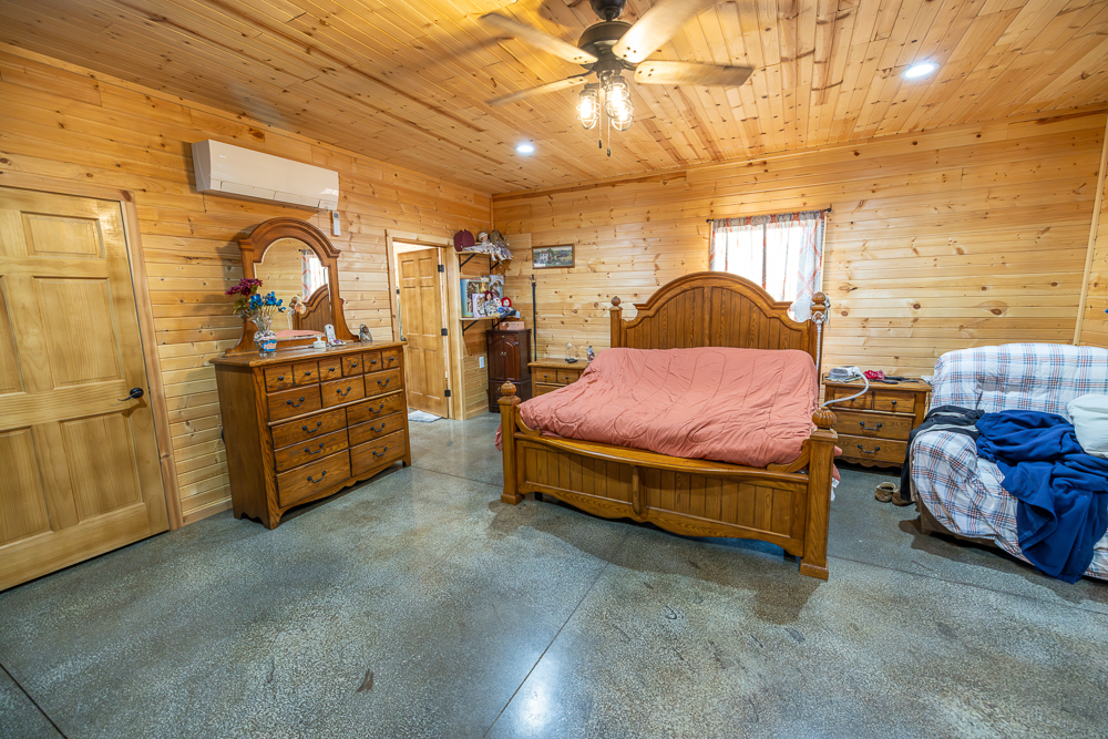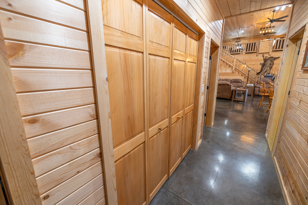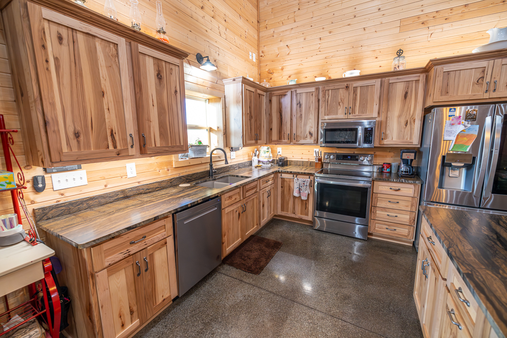 While the exterior is modest and understated, the moment you step inside, the home makes a lasting impression. The interior is fully finished in rich tongue-and-groove pine, walls and ceilings alike, creating a warm, lodge-style atmosphere with timeless appeal and no drywall anywhere in the home.
