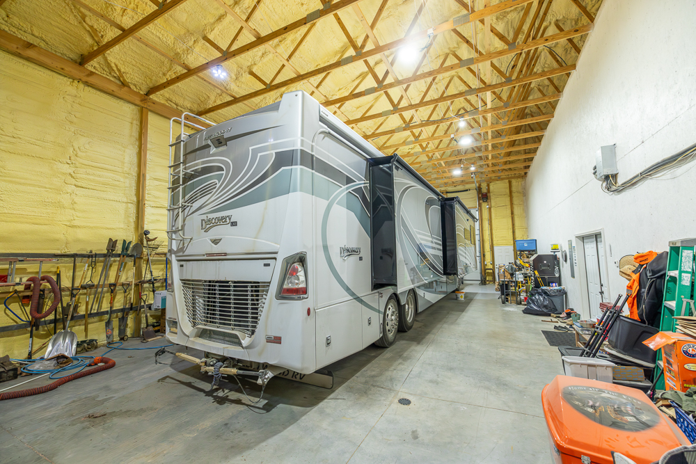 The attached 30'x80' shop/garage offers incredible functionality with 18-foot ceilings and large 12'x14' overhead doors. With approximately 80 feet of depth, this space easily accommodates multiple vehicles, equipment, RVs, or recreational gear. The shop is equipped with its own 100-amp electrical service, floor drains, motion-activated lighting, and high-bay LED fixtures, making it a highly capable workspace.
