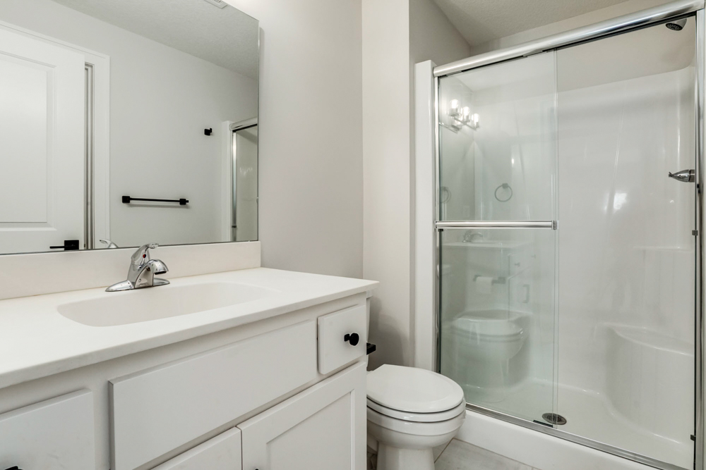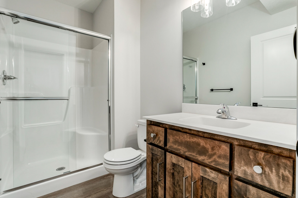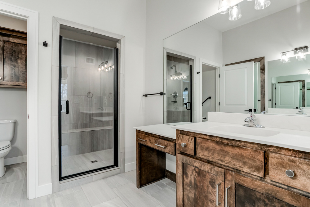 - Walk-in shower and dual vanities