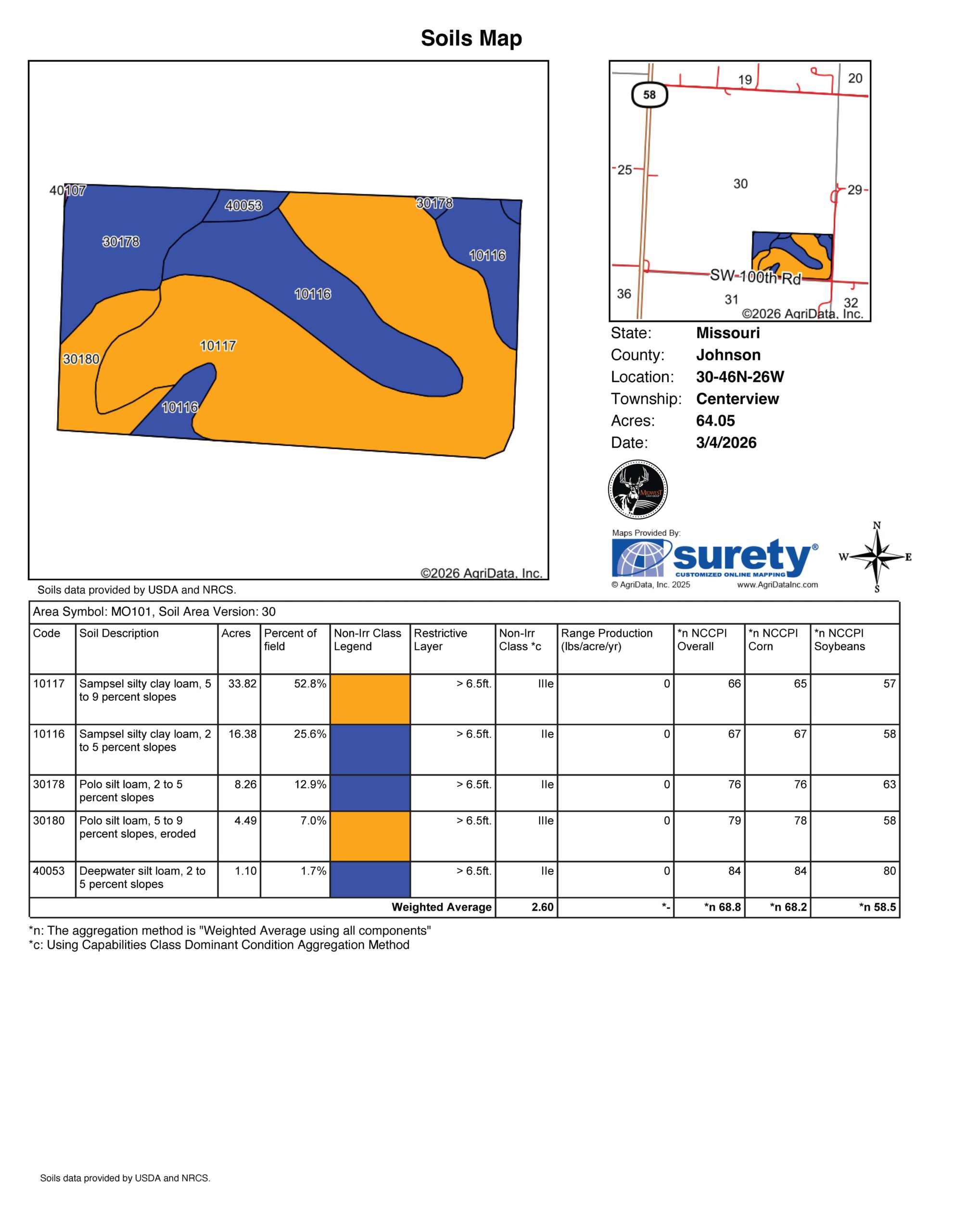 - Productive soils, including Sampsel silty clay loam, Poil silt loam, and Deepwater silt loam, with NCCPI ratings up to the mid-80s