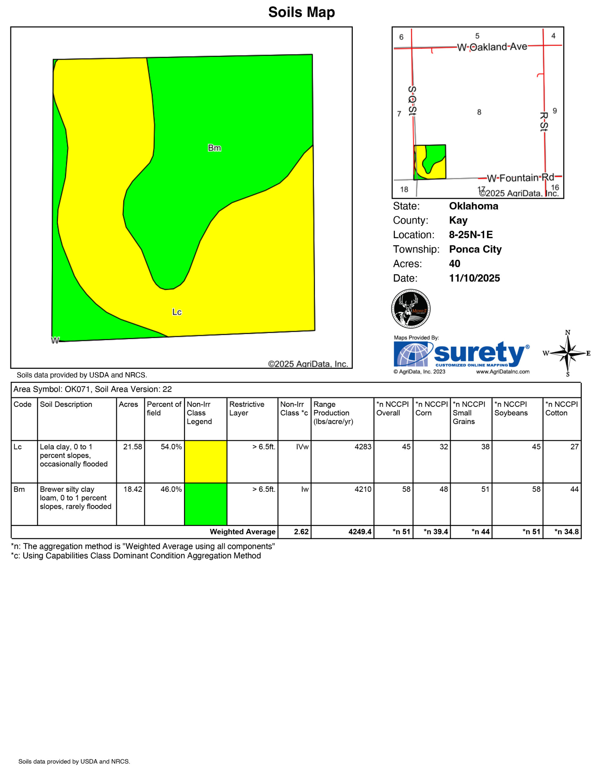 Nestled in Kay County, Oklahoma, sitting between Tonkawa and Ponca City, lies this 40-acre parcel that offers a rare blend of productive farmland and passive income. Approximately 36 acres are tillable, with roughly 46% of the soil composed of Class I Brewer silty clay—ideal for crop production. This income-producing property conveys with mineral rights and currently generates ~$6,000 annually in royalties, offering a 4.4% ROI at list price before accounting for crop revenue. Estimated ROI increases when factoring in the crop ground. Whether you're a farmer looking to expand or an investor seeking land with dependable returns, this parcel delivers. Excellent access, flat-to-gently rolling terrain, and agricultural zoning round out this compelling opportunity. Sellers have an additional 40 acres for sale, ½ mile away. Contact Listing Agent Paul Smith for more information (918) 397-2737.Property Features