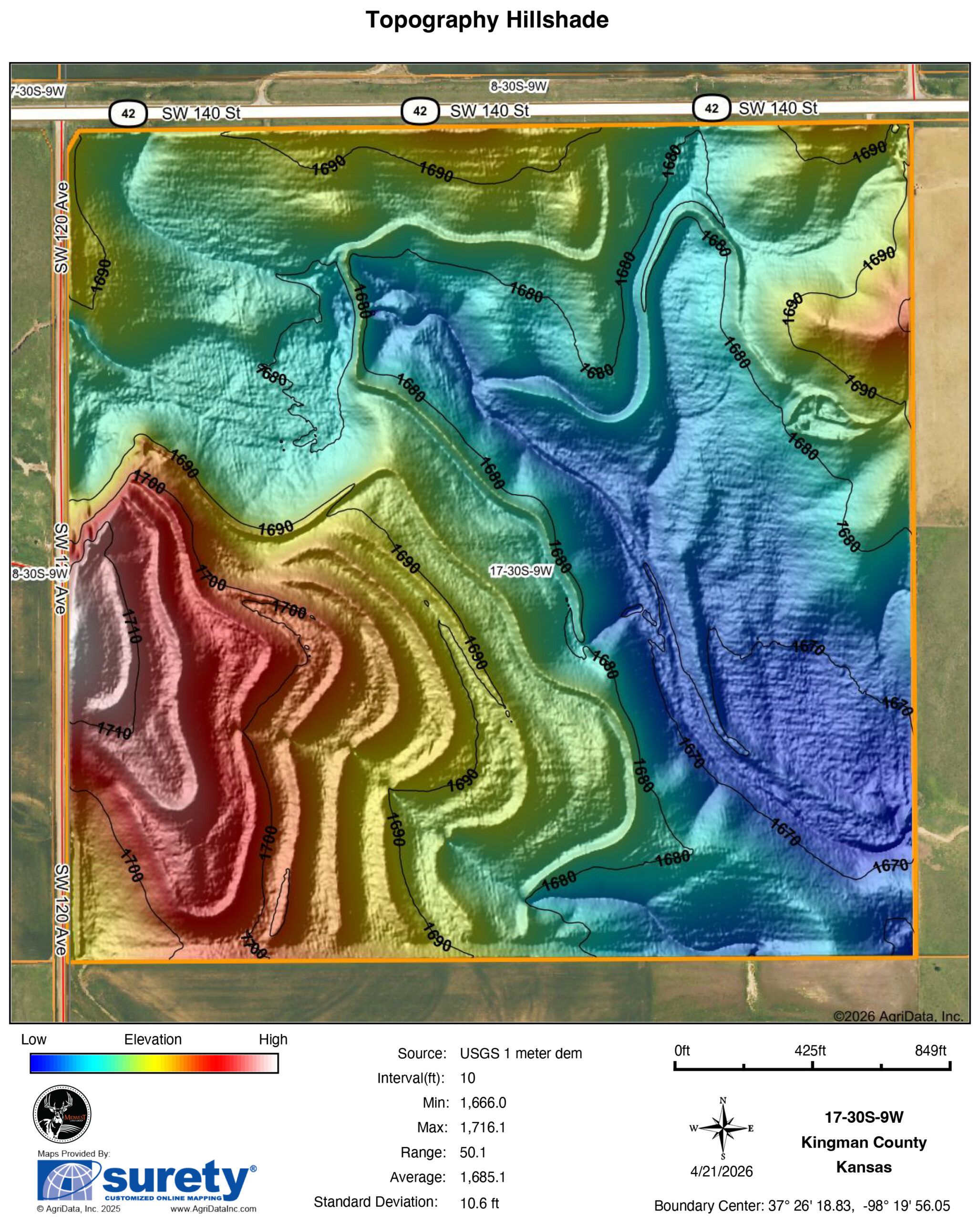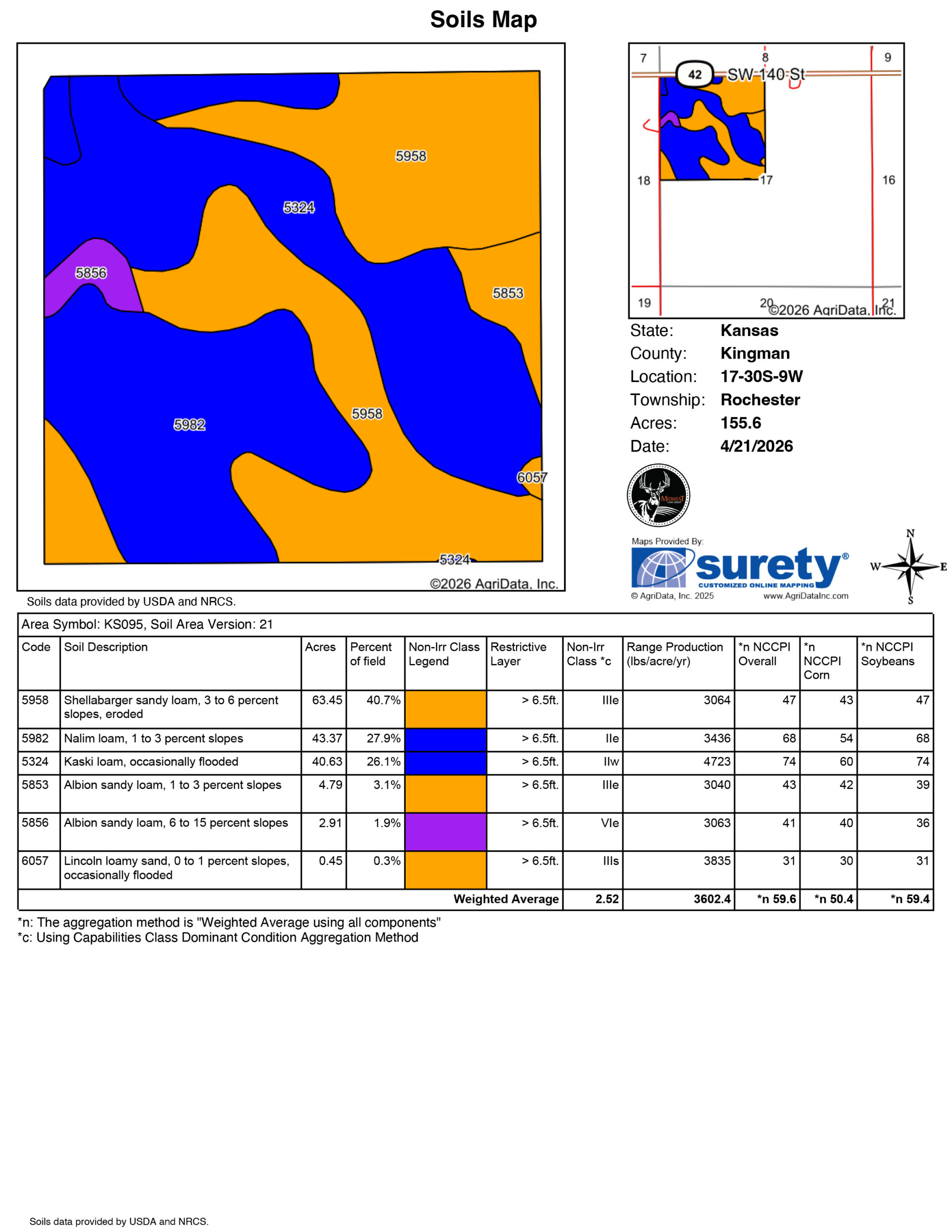 Located in Southwestern Kingman County between Zenda and Nashville is 155 +/- acres of fertile cropland. With frontage on 42 Highway, this farm is in a prime location, quickly navigate to the property to check grazing livestock or swiftly haul grain to the COOP. Being along a state highway has its benefits, a wise long-term investment for anyone who wants increased appreciation or easement potential. With electricity and paved road frontage, this could also make an excellent build site with beautiful views.The farm consists of a mixture of Class II and Class III soils. The tillable acres carry a productivity index of 60, well above average for the county. A mixture of Shellabarger Loam, Nalim Loam, Kaski Loam, and Albion Sandy Loam. These soil types, joined with adequate rainfall, produce tremendous yields. The farm is almost entirely tillable with very little waste. Well-maintained erosion control structures are in place, and smoothed terraces. The tillable acres are currently planted to wheat, with possession to occur following wheat harvest or August 1st, 2026.
