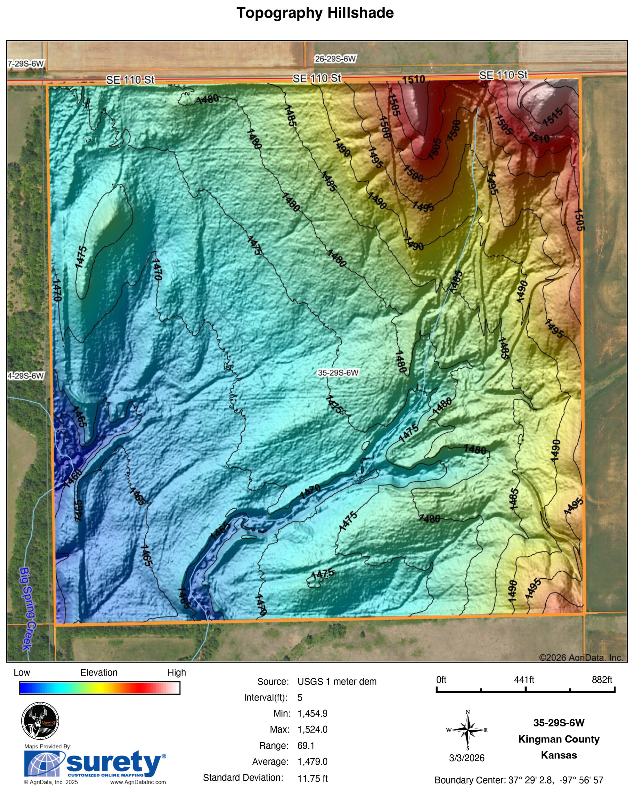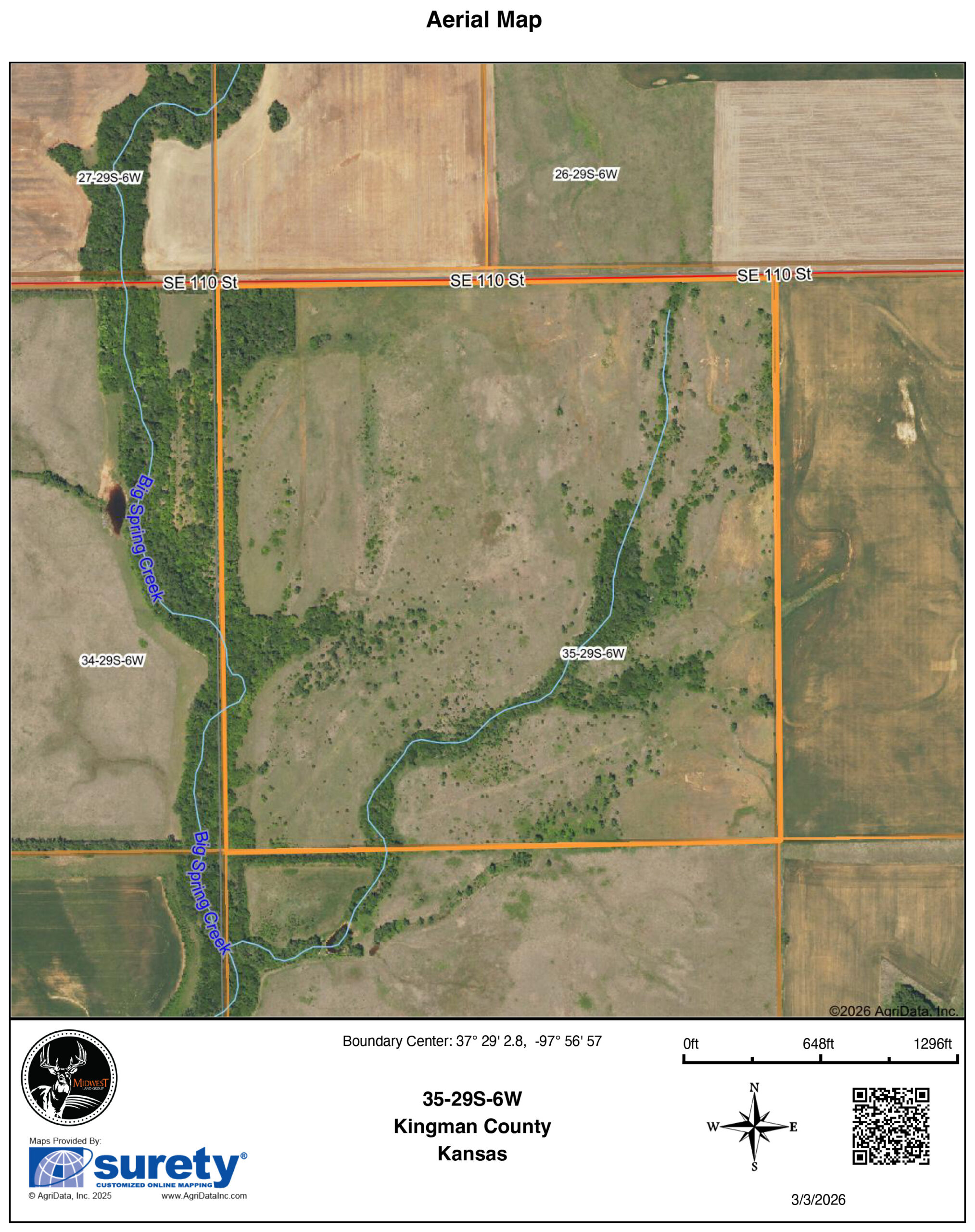 One glance around the neighborhood, and you will see no roads on the east, west, or south side, and this property is surrounded by large landowners in all directions. It offers limited to no pressure from outfitters or guides. Ensuring good age class and genetics for the entire area. The north property line is SE 110 Street and provides easy access to this farm. Entering the property, Big Spring Creek has many Walnuts and Oak trees growing along the clean, clear spring water that is constantly flowing as it enters the farm. This farm also has solid Class II Nashville Silt Loam underneath, providing great soil for future food plots or farming desires. A seasonal creek bed cuts northeast through the middle of the property. Creating a hardwood private barrier in the back of this farm. Here, the deer sign is everywhere! From bedding spots throughout the native grass to scrapes and rub lines along the tree lines. Mowed trails throughout, allowing for easy access to blinds and deer movement. The farm has beautiful elevation change with a large bluff in the northeast corner that flows to the southwest towards Big Spring Creek. Providing an excellent location to scout from or build on that overlooks the entire property!