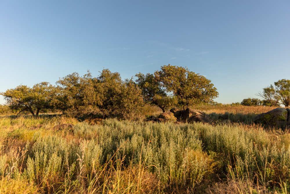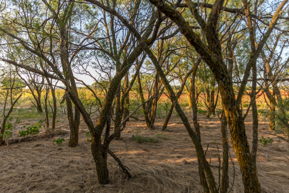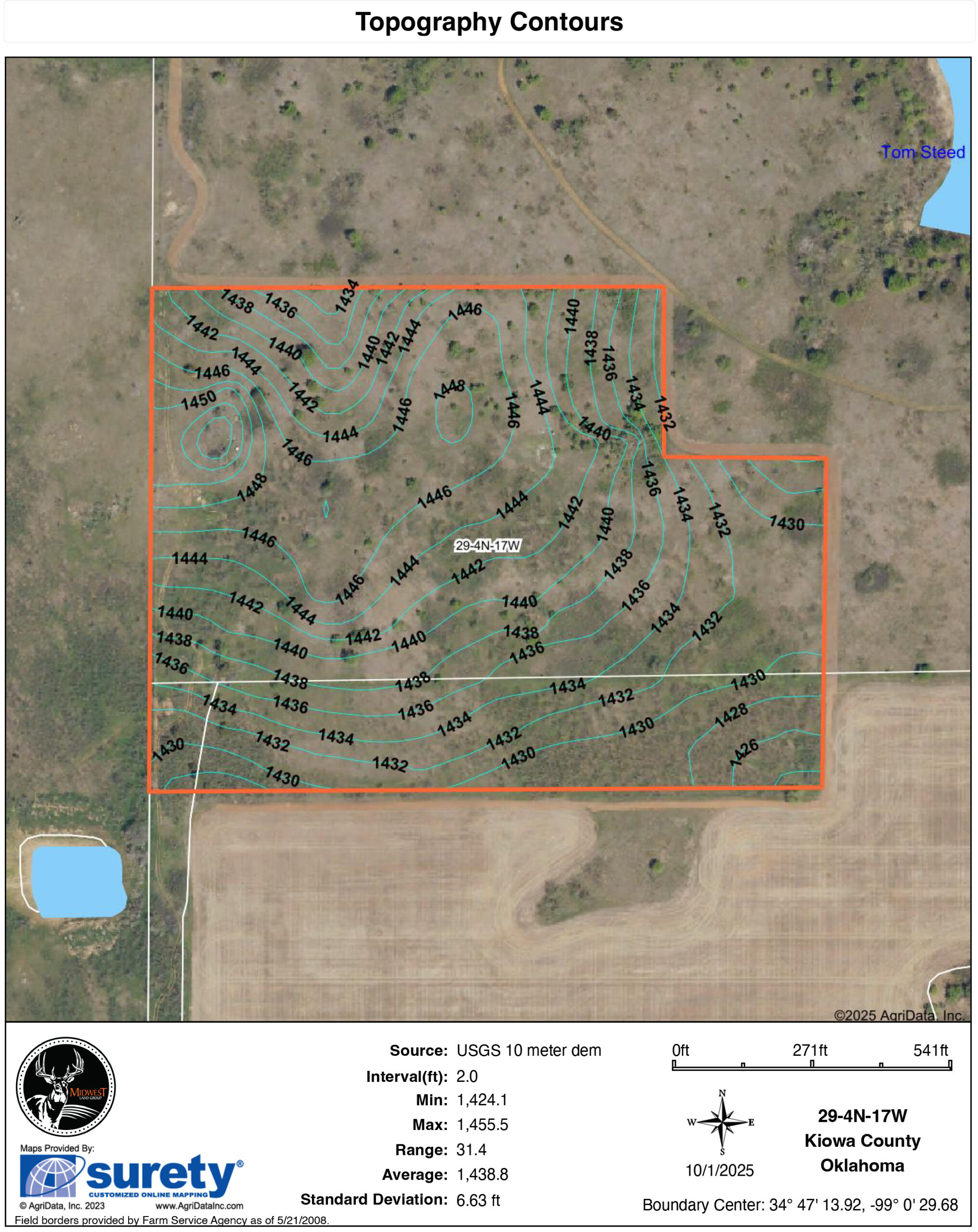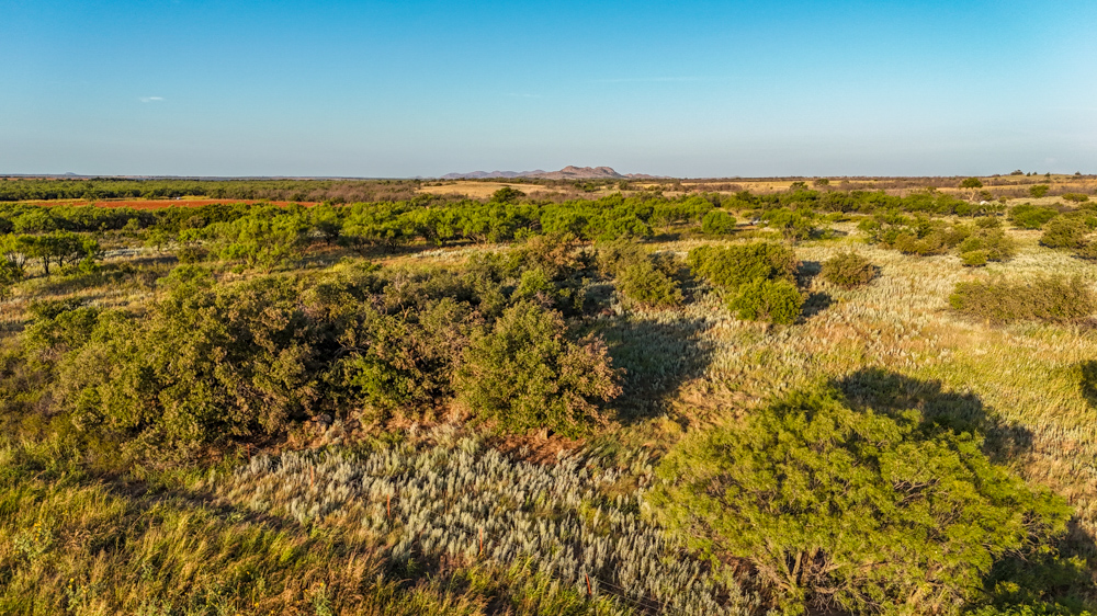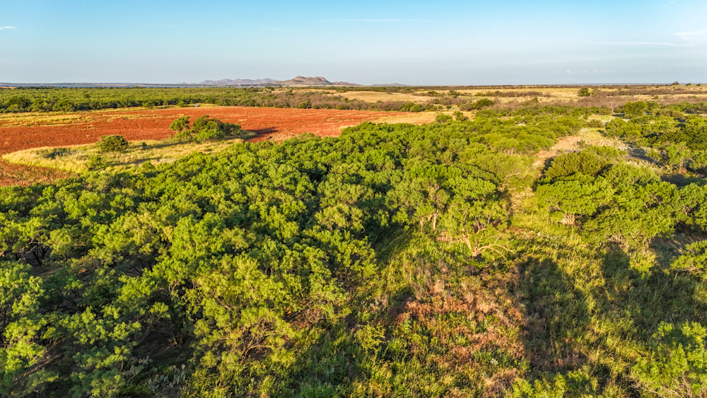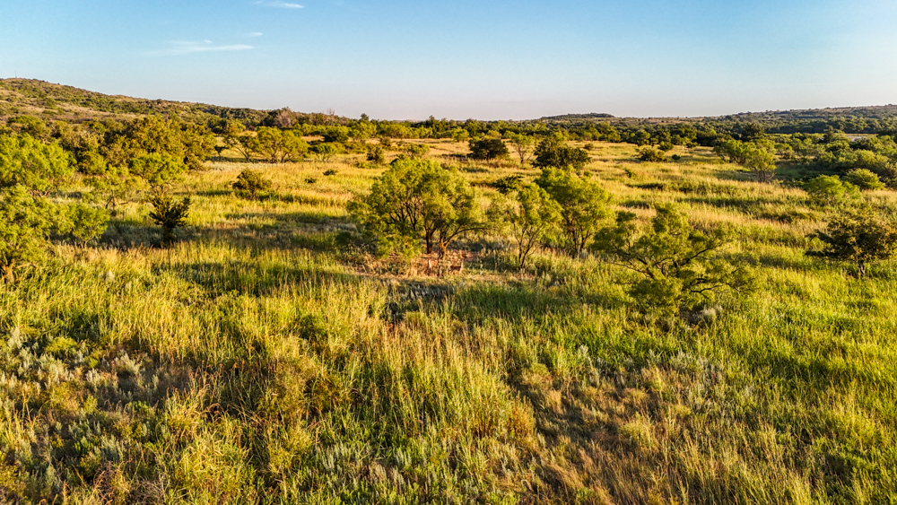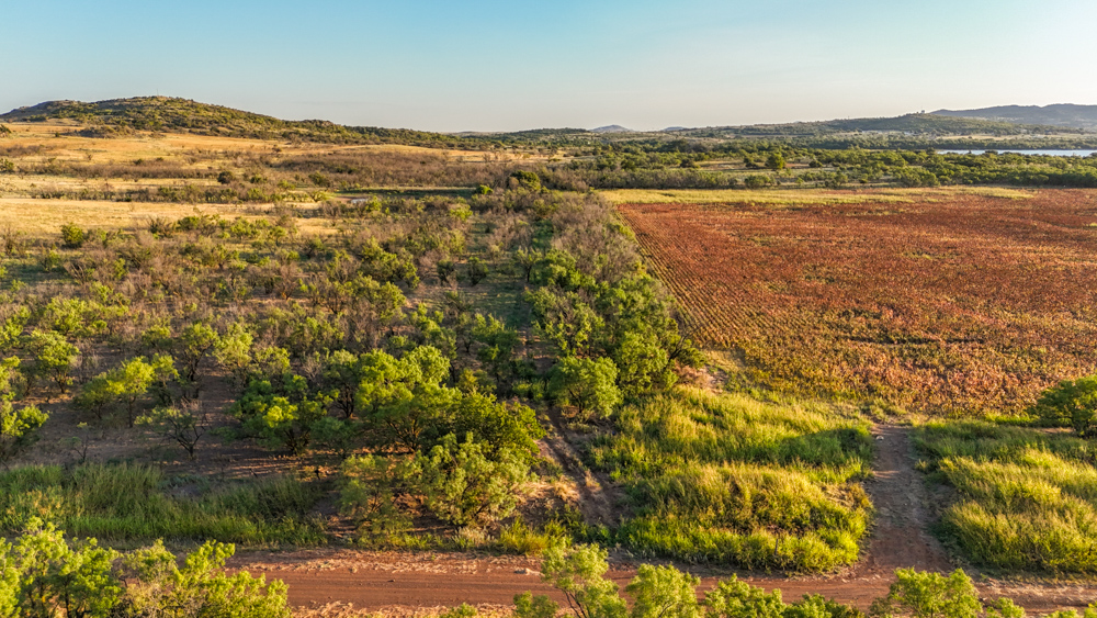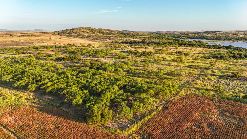 The landscape features approximately 8.5 +/- acres of Class III soils, perfect for establishing food plots to enhance wildlife attraction and hunting opportunities. Mesquite thickets dominate the vegetation, with scattered hackberry, elm, and plum thickets adding valuable cover and diversity throughout. The southern property line borders an active agricultural field currently planted in milo, creating an exceptional wildlife attraction for deer, ducks, geese, and doves during peak seasons. The mesquite thicket adjacent to this field serves as a prime staging and bedding area for deer, making this an outstanding property for bow and rifle hunting. Scattered rock outcroppings add character to the terrain while providing natural vantage points for glassing game and enjoying panoramic views of the Wichita Mountains and Tom Steed Reservoir.