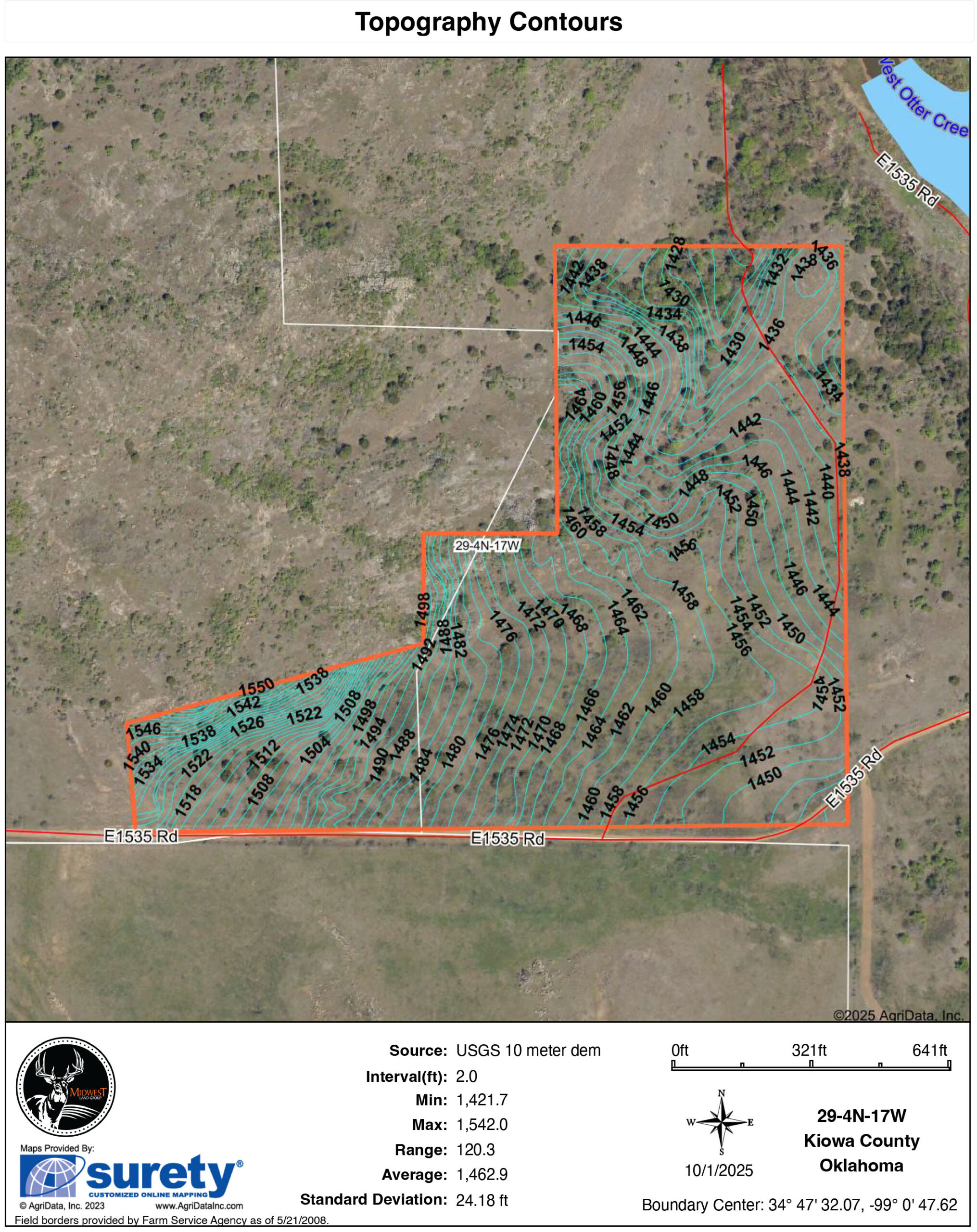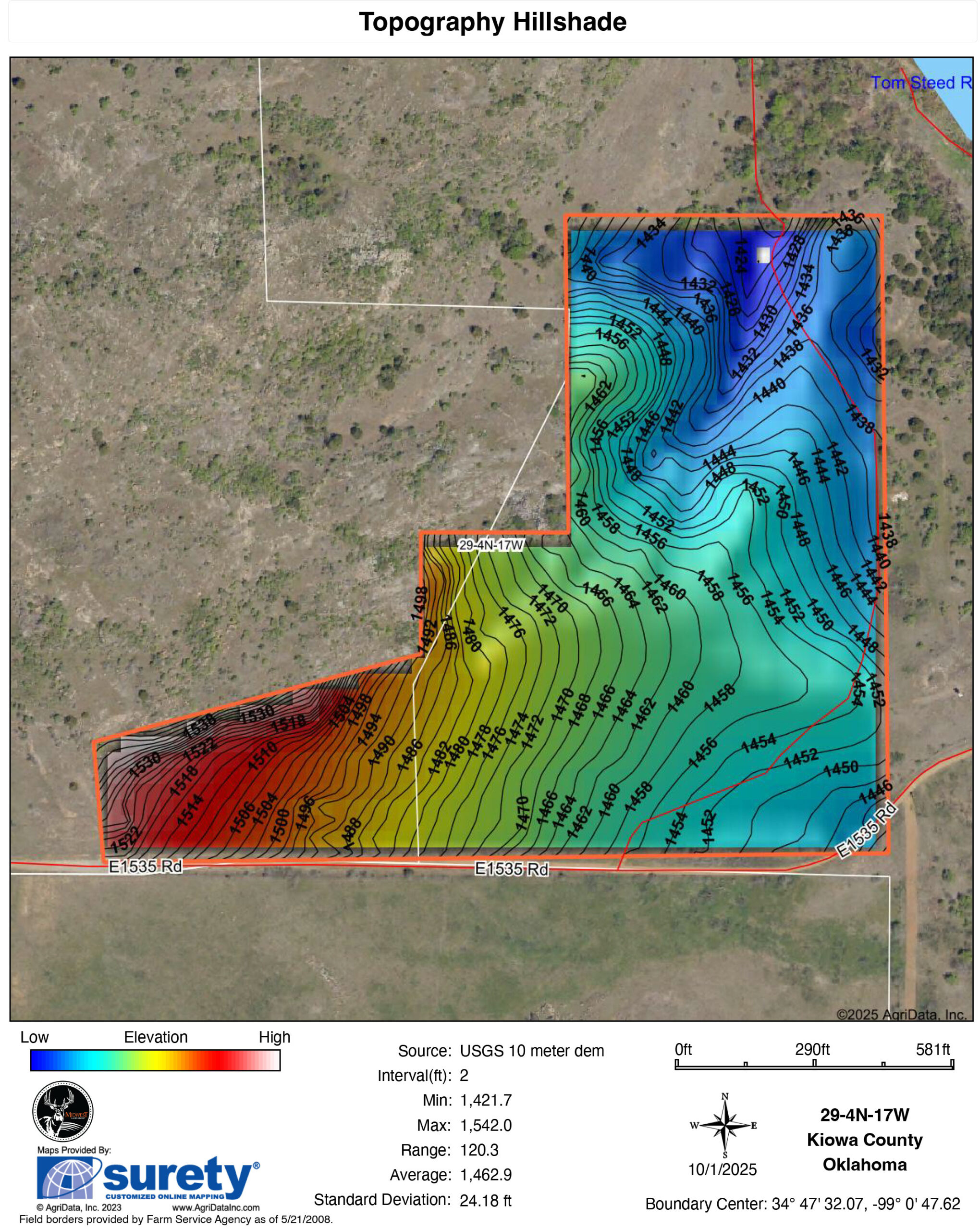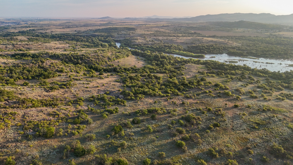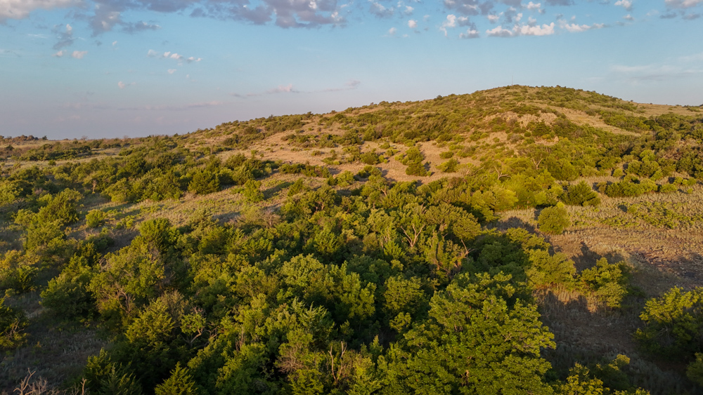 Discover an exceptional 30-acre recreational property offering one of the few privately owned parcels in close proximity to Tom Steed Reservoir in Kiowa County, Oklahoma. This remarkable parcel borders the Mountain Park Wildlife Management Area, providing immediate access to thousands of additional acres for outdoor pursuits. With dramatic topography featuring over 120 feet of elevation change, the property showcases the rugged beauty of the western Wichita Mountains descending toward the shoreline, which lies under 200 feet from the northeast property corner. The diverse terrain, combined with proximity to West Otter Creek as it flows into the reservoir, creates an exceptional wildlife corridor that supports an abundance of native species year-round.The landscape is a striking mosaic of native grasses interspersed with mature hardwoods and native trees, including black walnut, American elm, hackberry, chittamwood, and mesquite. This natural diversity offers stunning vistas of both Tom Steed Reservoir and the surrounding Wichita Mountains. The elevated western portions of the property deliver commanding views that showcase the best of Southwest Oklahoma's scenic beauty, while the lower elevations near the water provide easy access to the lake for fishing and recreation.