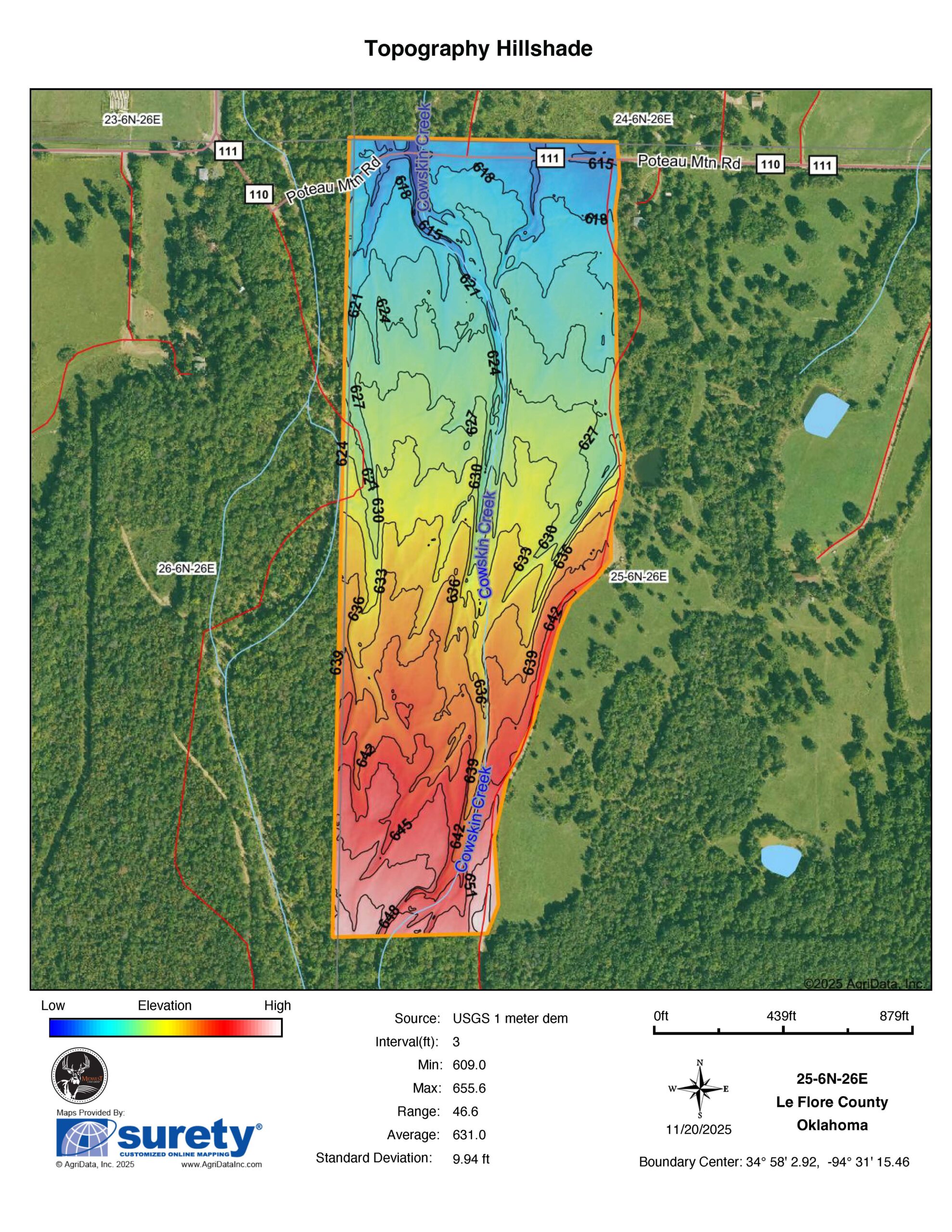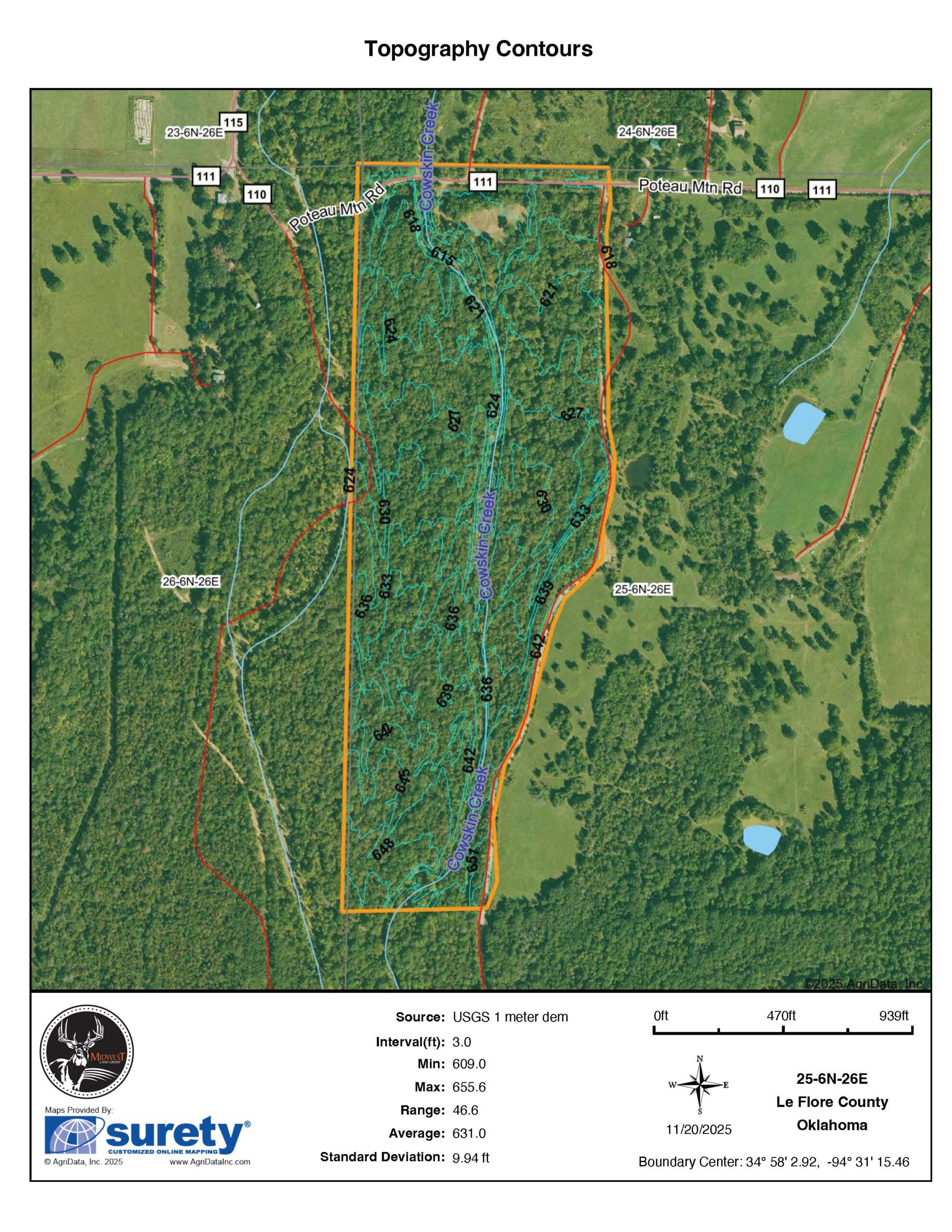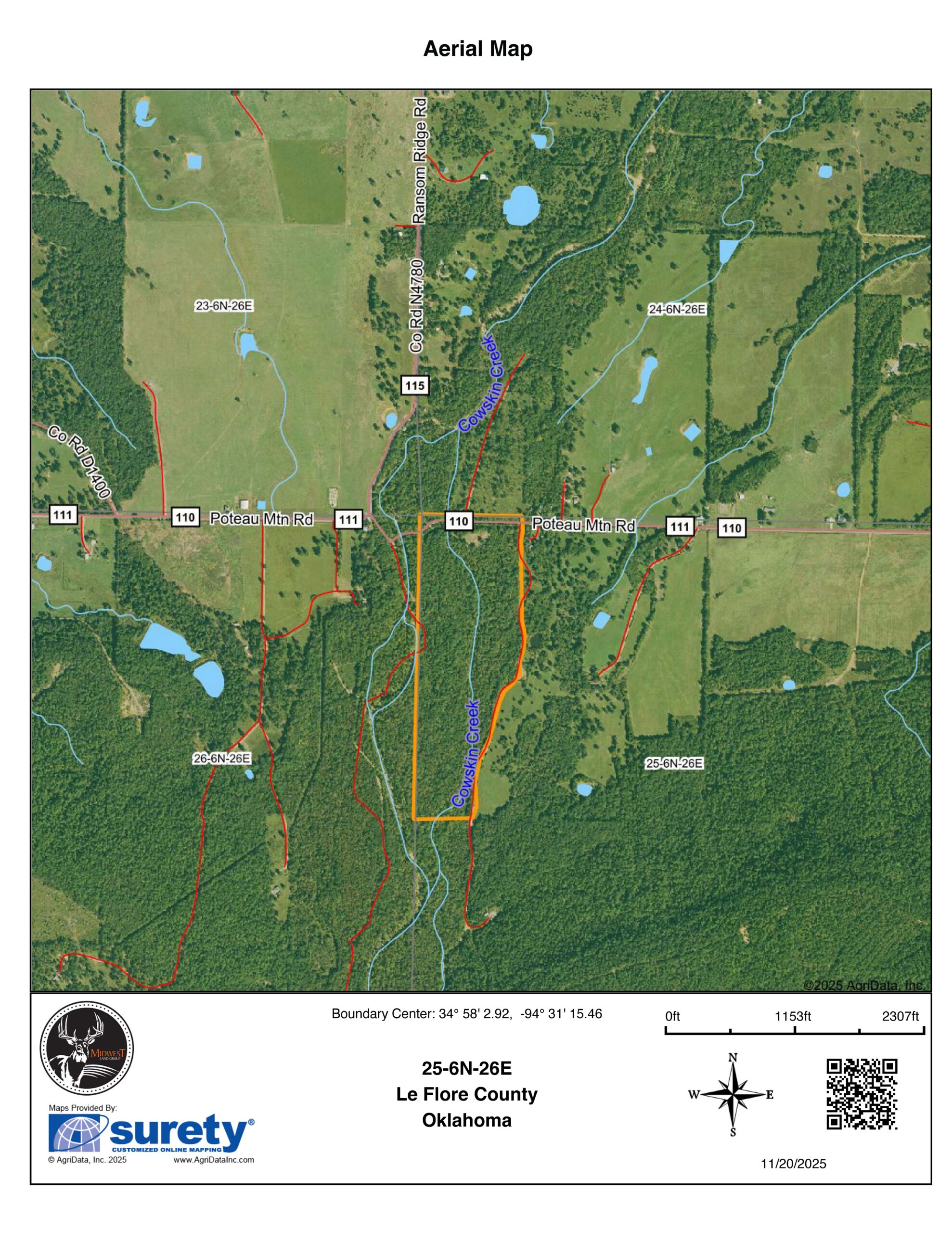 Located in Le Flore County, Oklahoma, this 50 +/- acre tract is waiting for its new owners. With Cowskin Creek running along the west side of the property, enjoy the sound and tranquility of the water. This property has a nice, cleared area for you to put an off-grid cabin or bring your camper for deer season and enjoy your own piece of hunting ground in Oklahoma. Deer are frequent in the area, as it is loaded with deer tracks and buck rubs. There is an abundance of small game, like rabbit and squirrel, on this tract as well.You can build your own cabin/barn out of the trees you take from your own property, with the abundance of cedar, walnut, and a few pines. The north and east property boundaries have barbed wire fencing already in place, with a great pipe gate entrance to get into the clearing. To the west side of the property, there is a great trail already cut in place to enjoy an evening side-by-side ride alongside the creek.