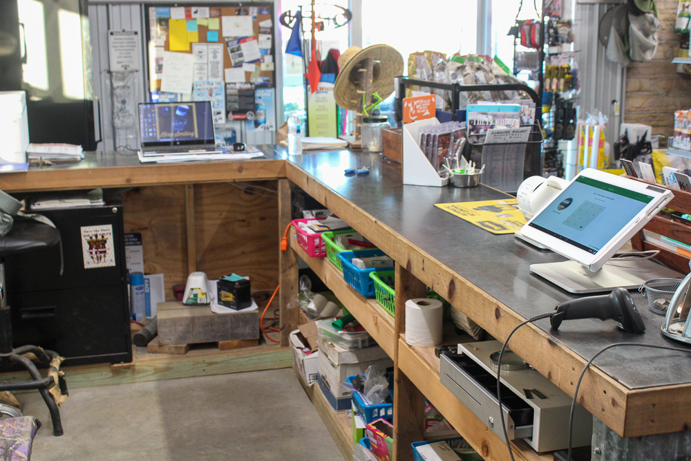 The L-shaped steel-topped counter supports the point of sale system along with plenty of workspace.