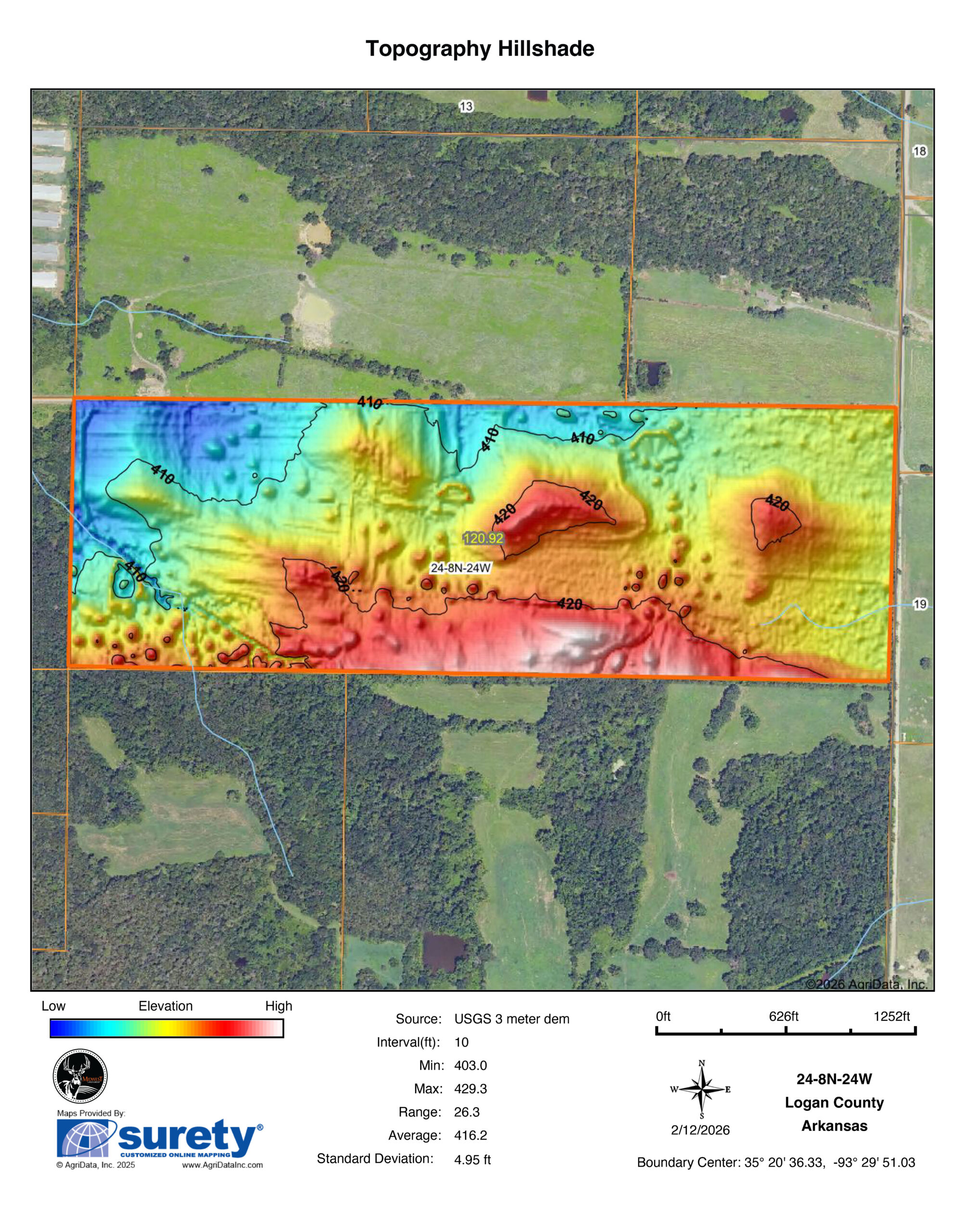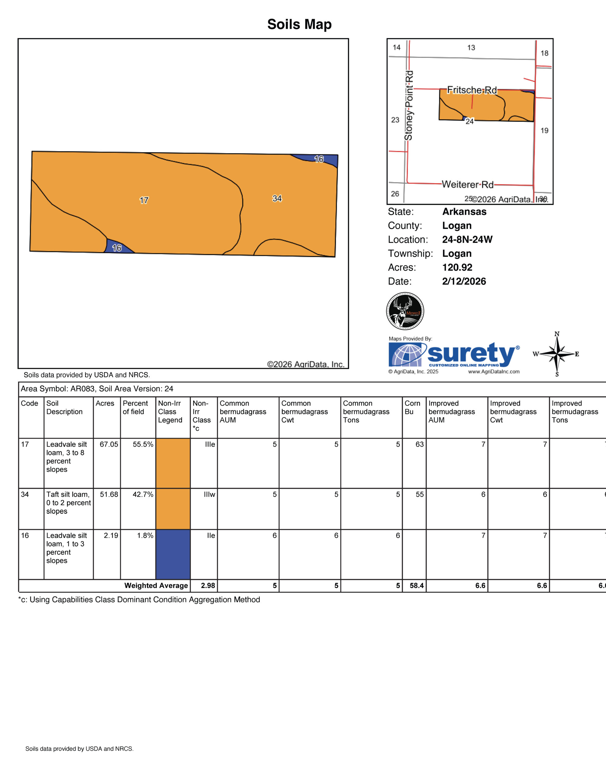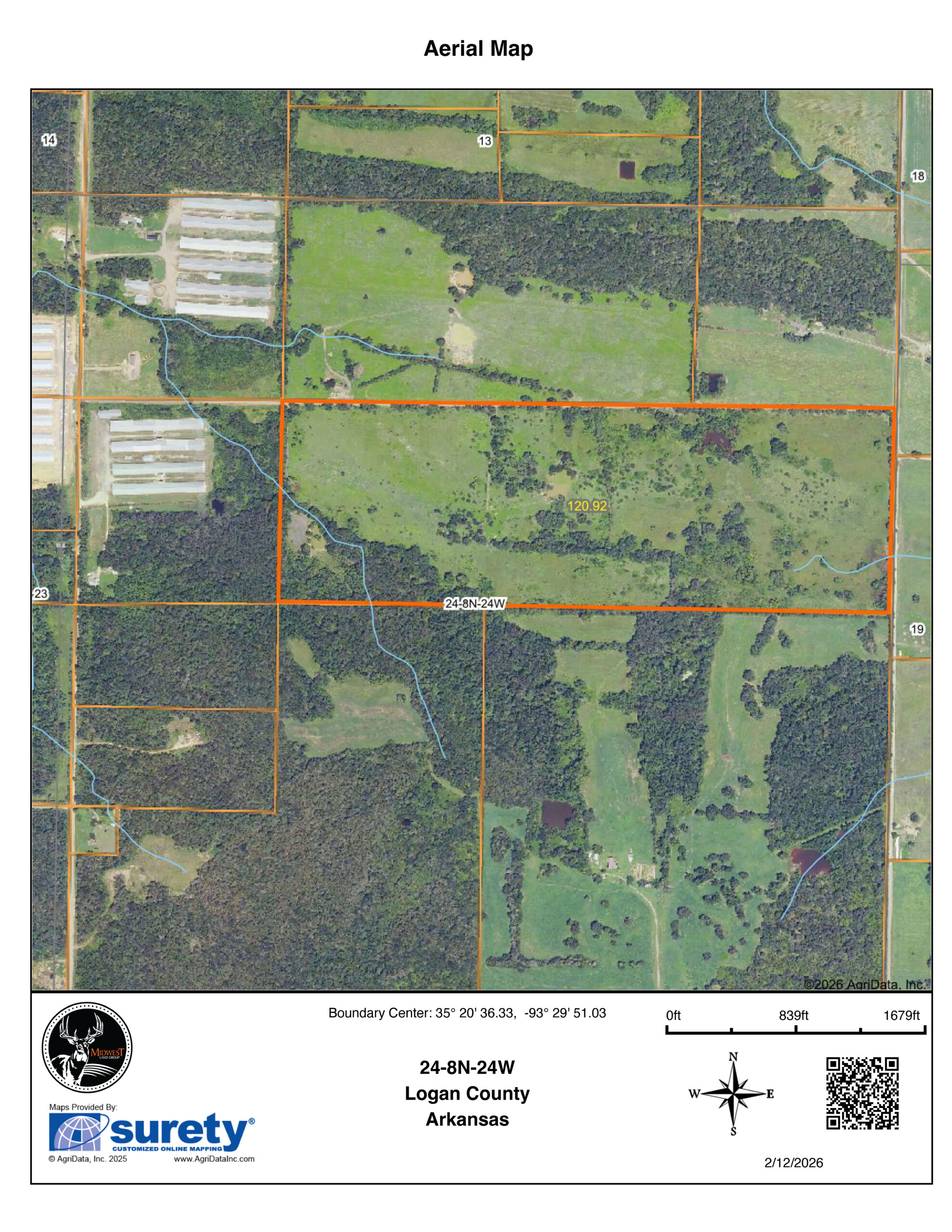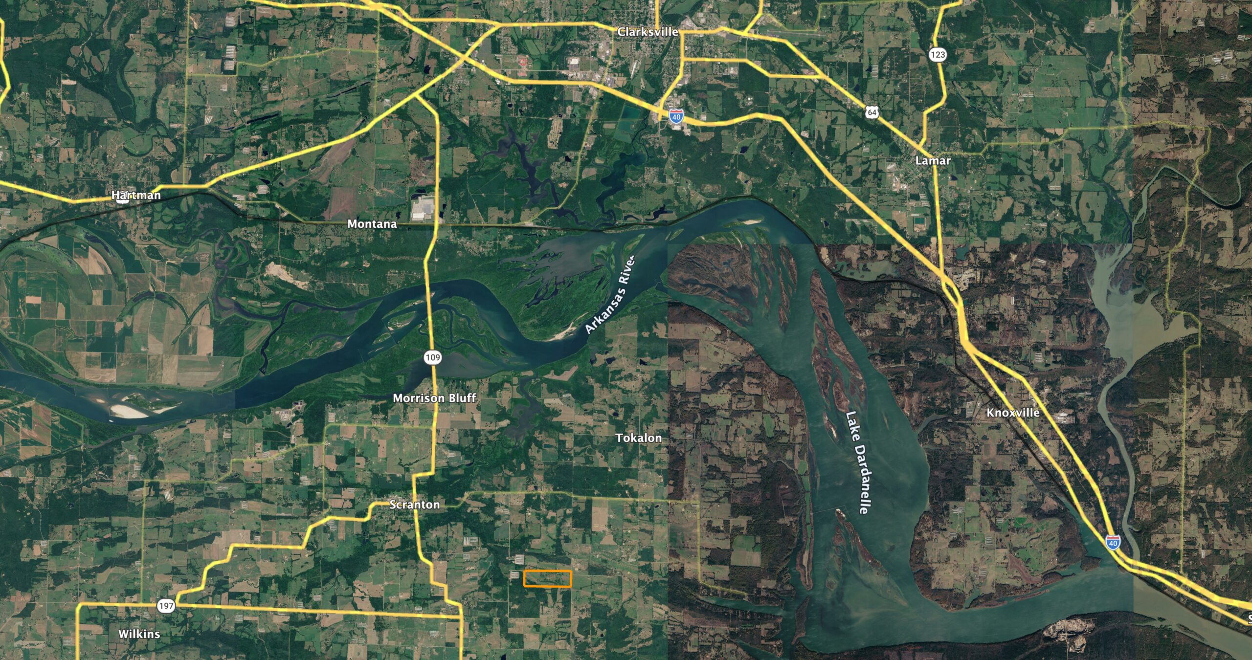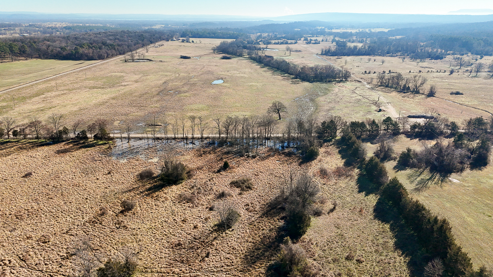 Situated 2.5 miles east of Scranton and one mile off Highway 197, this property encompasses approximately 120 acres of level cattle pasture. The western section of the parcel is currently undergoing clearing, involving the removal of small locust trees. The property benefits from two distinct access points via Fritsche Road: one at the northwest corner and the other located centrally along the northern boundary. The eastern portion of the acreage is predominantly open, with scattered small cedar and locust trees.Three ponds are distributed across the property, providing multiple water sources suitable for up to three paddocks. The property features county road frontage on the north via Fritsche Road and on the east via Weiterer Road. A stand of hardwood and cedar timber occupies the southwest corner. Given the low hunting pressure from the adjacent landowner, the entire property is anticipated to offer favorable Whitetail hunting opportunities.