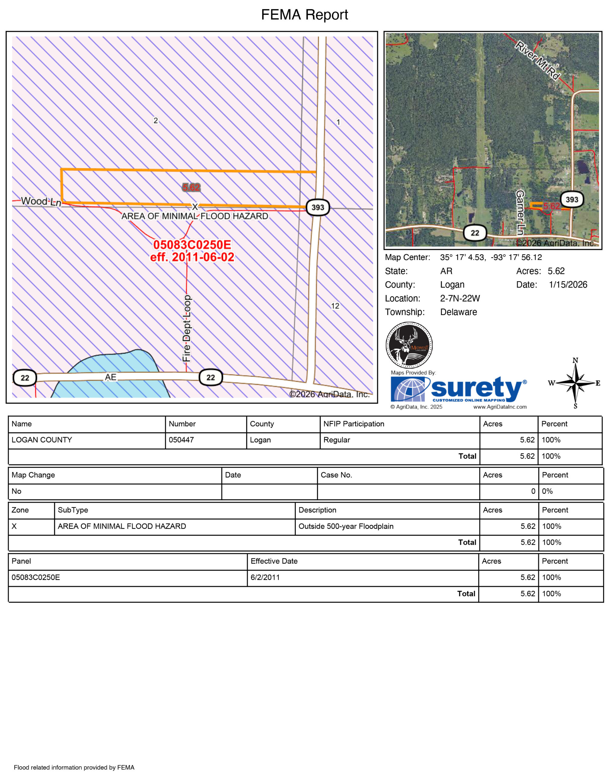 Located less than a quarter mile off of Highway 22 in Delaware, this Logan County build site is perfect for those with convenience in mind. The 5.7 +/- acre property has frontage on both Fire Dept. Loop, as well as Wood Lane, providing great access to the property’s two build sites. With access from both county roads, the property would be a prime candidate for a minor subdivision. Power, rural water, and fiber-optic internet are all available along the property’s county road frontage, perfectly complementing the great access and adding another level of convenience.Dardanelle is less than fifteen minutes away, and Russellville is less than twenty, making this a very commutable location for those working in town every day. Lake Dardanelle, known for its great fishing, has several boat ramps, day-use areas, and campsites nearby. If you are looking for a build site in the country that offers a level of privacy but does not compromise convenience, you will want to take a look at this one.