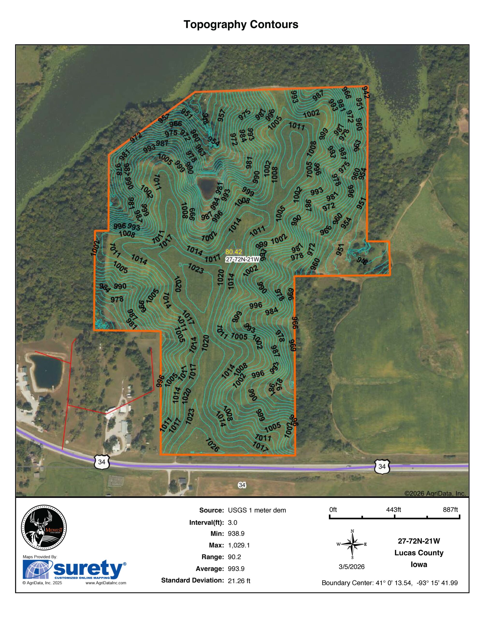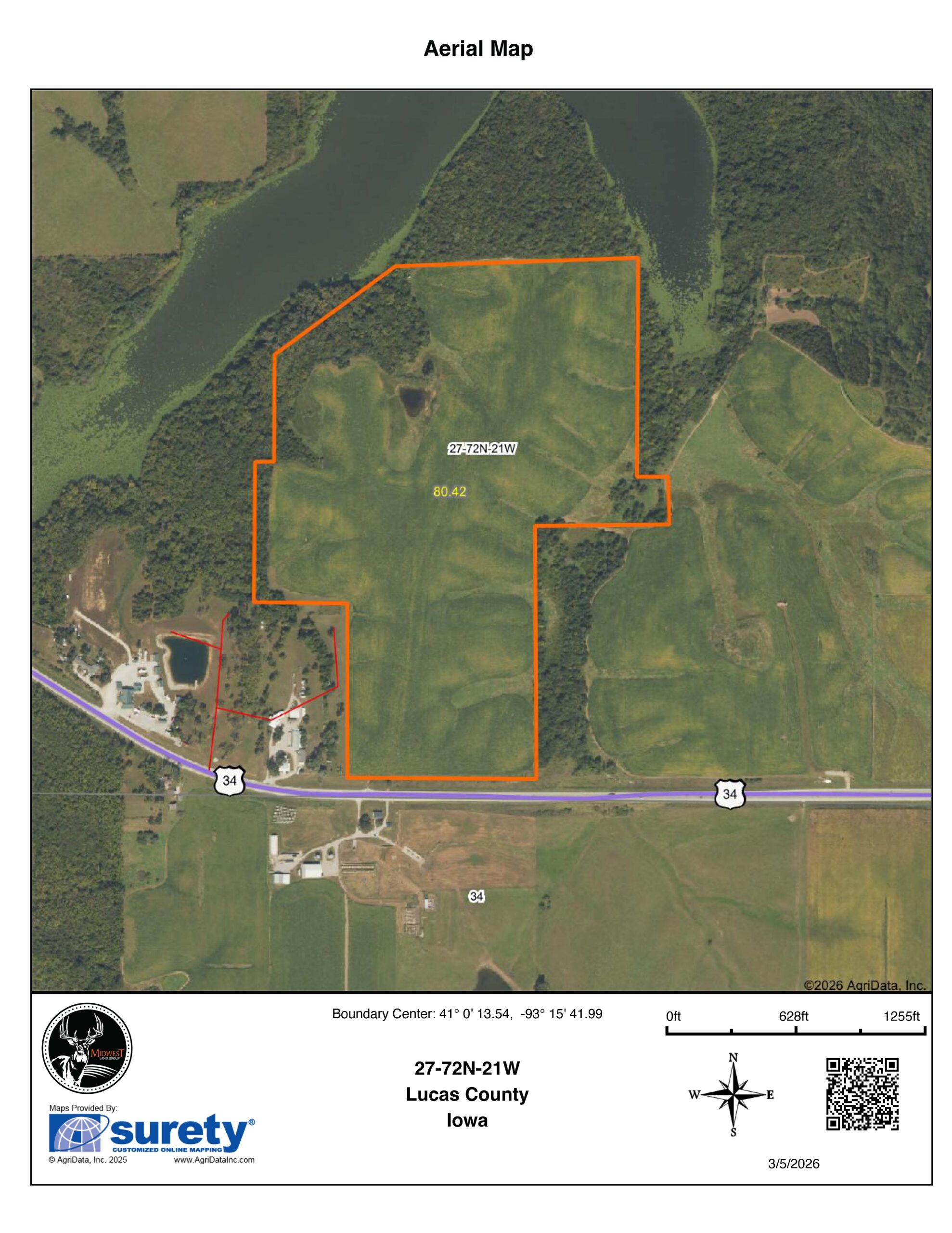 Midwest Land Group is proud to present this sensational 80 +/- acre property located just east of Chariton, offering an exceptional opportunity for investors, outdoor enthusiasts, and those seeking a breathtaking rural build site. Conveniently situated only 60 miles southeast of Des Moines, the farm lies just one mile east of town along Highway 34, providing excellent access while maintaining a private and peaceful setting. The property is also only 30 miles from Lake Rathbun—the second largest lake in Iowa, and just a short distance from both Red Haw Lake and Lake Morris, with Red Haw State Park located only blocks away.This versatile farm offers an outstanding combination of recreational appeal, agricultural productivity, and development potential. Despite lower CSR2 ratings, the land consistently produces tremendous crop yields year after year. With no building restrictions or covenants, the property offers multiple gorgeous and private build sites, including an exceptional potential homesite overlooking both the lake and a newly rebuilt large pond. Utilities and rural water are available along the road, making development convenient. With its prime highway location, the property also presents excellent investment or possible commercial building opportunities.