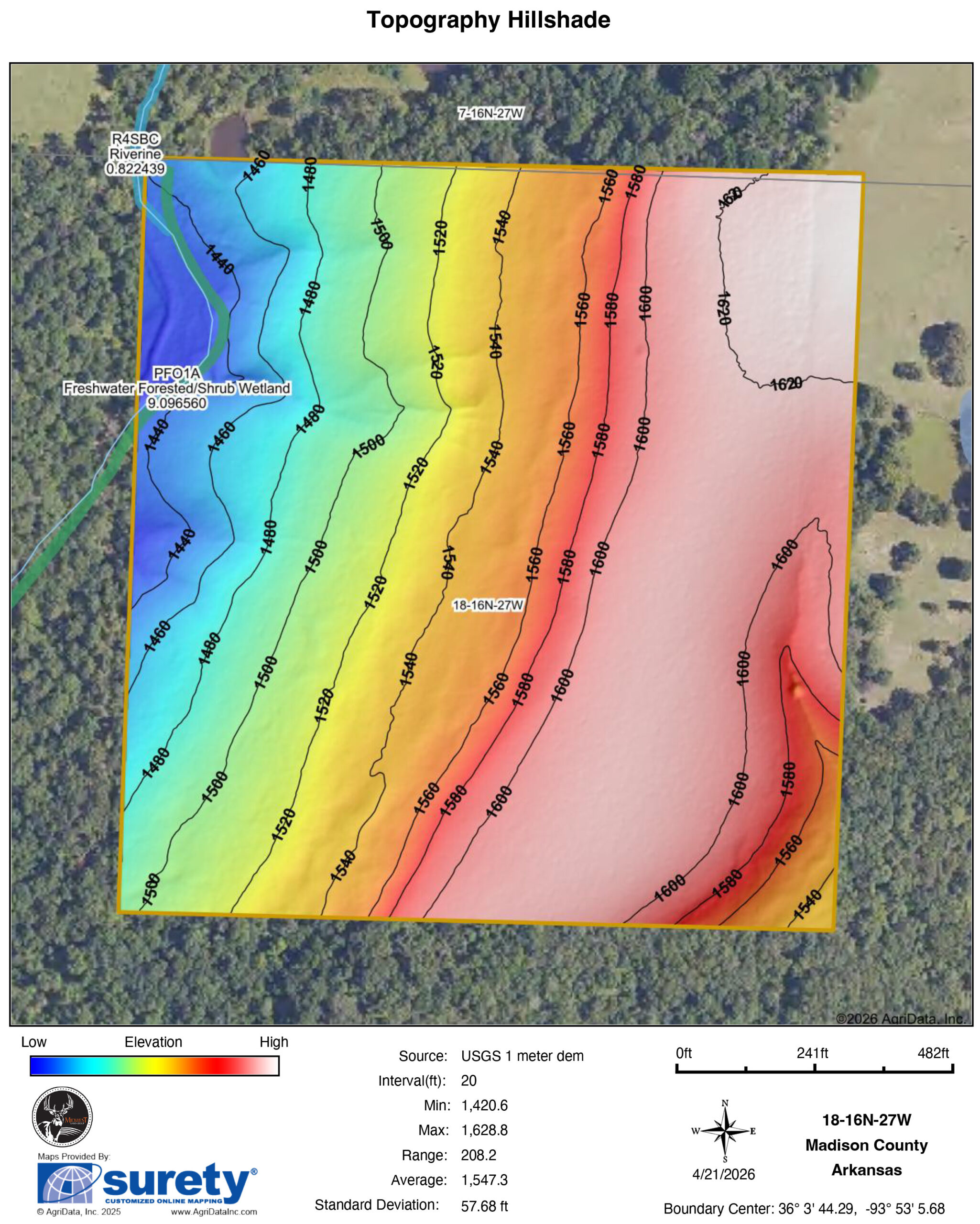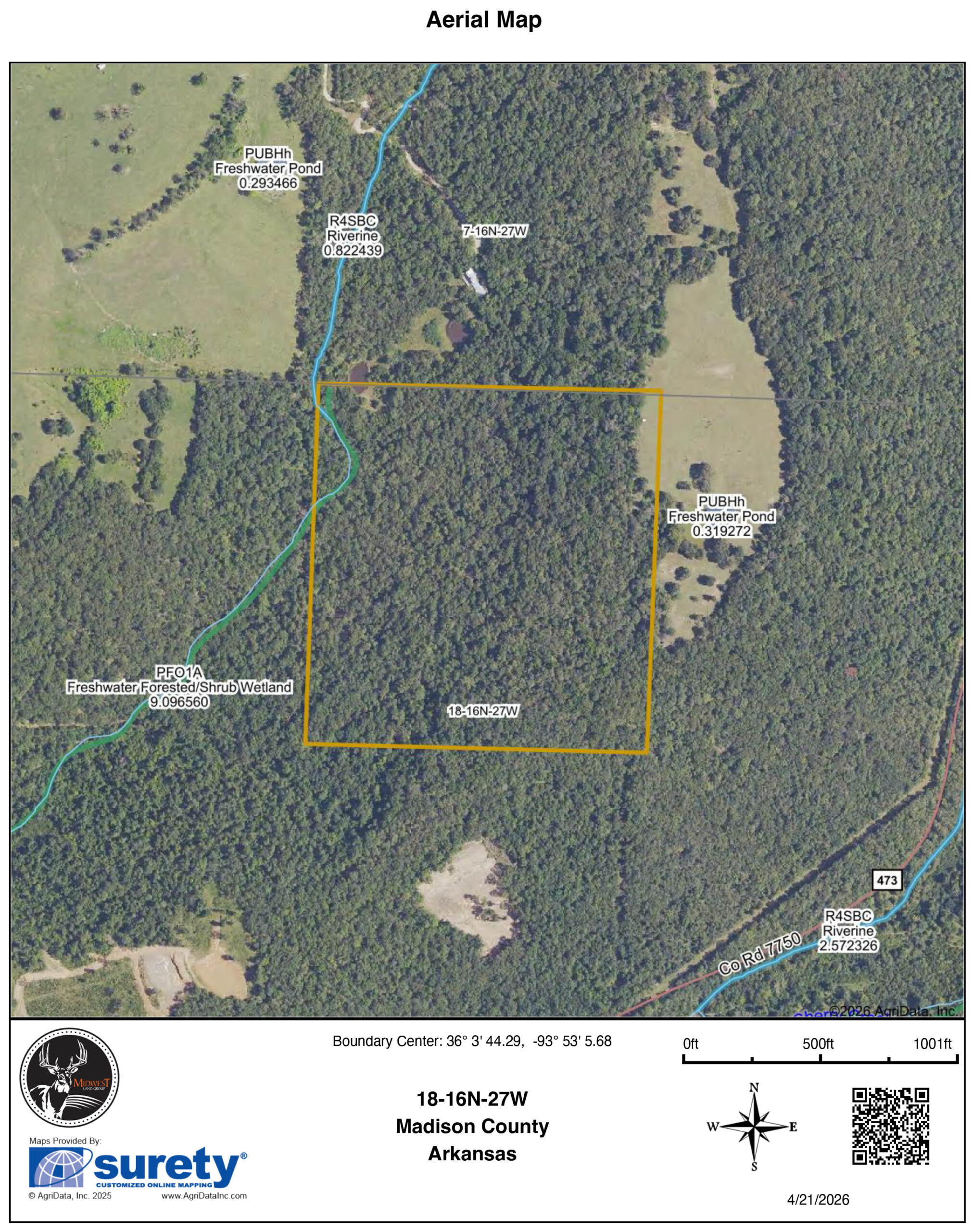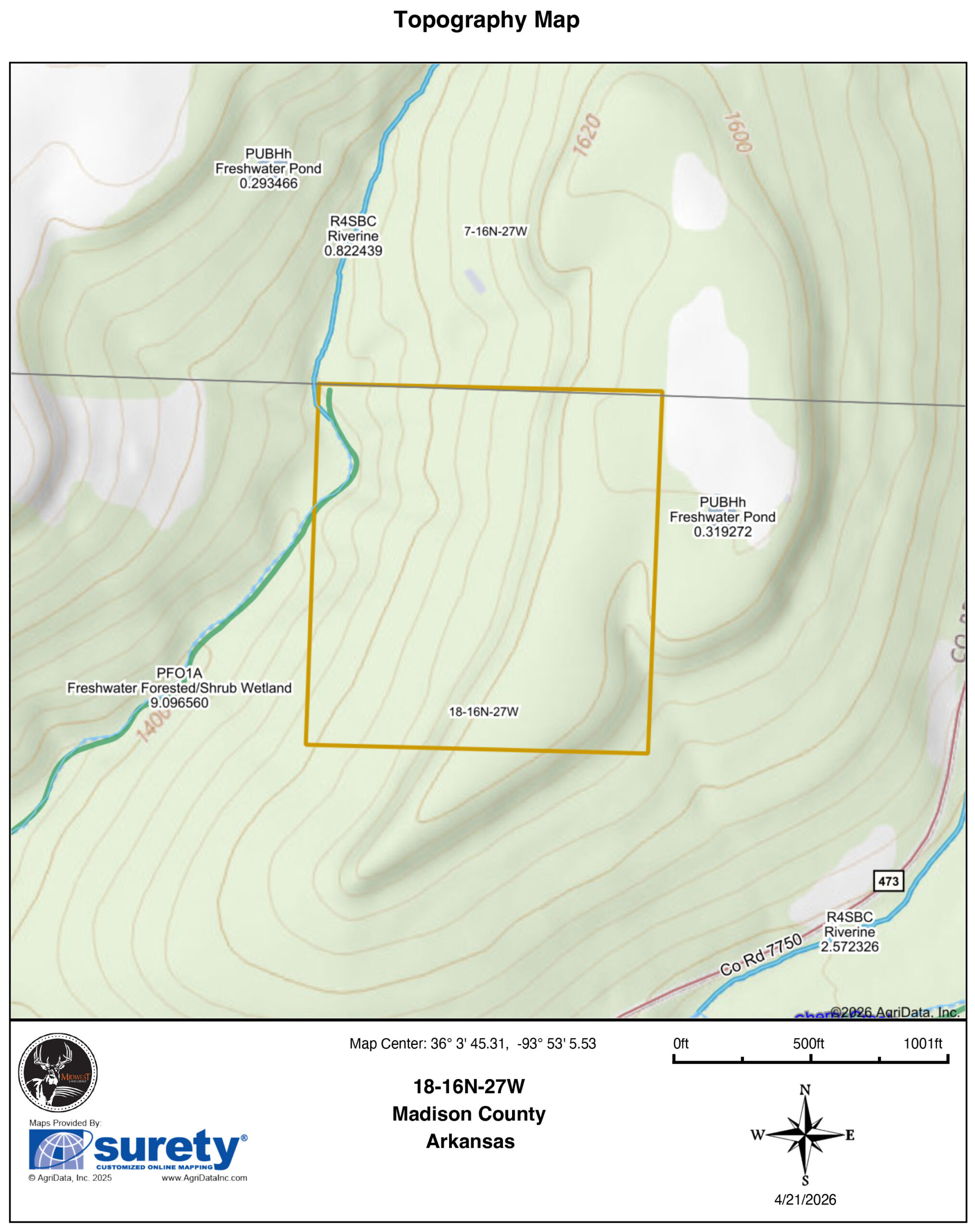 If you’ve been looking for a manageable piece of ground that checks a lot of boxes, this 37 +/- acre tract in Madison County deserves a hard look. Here, you have a great location, hunting potential, and timber value. Nearby utilities offer opportunities for future improvement as well. This property is being split from a larger parcel, with the seller providing ingress/egress along with utility easements, making it a very workable setup from day one. Utilities are along County Road 7670. Electric service is provided by Ozarks Electric, and water is supplied by Madison County. You’ve also got the option for Ozarksgo high-speed fiber internet.The land itself sets up extremely well. You’ve got gently sloped benches throughout the property, along with a large, usable flat on the eastern side that really opens up your options for a homesite, cabin, or multiple food plot locations. A wet-weather creek runs through the northwest corner of the tract, and there’s also a pond already in place. These are good features for both wildlife and recreation.