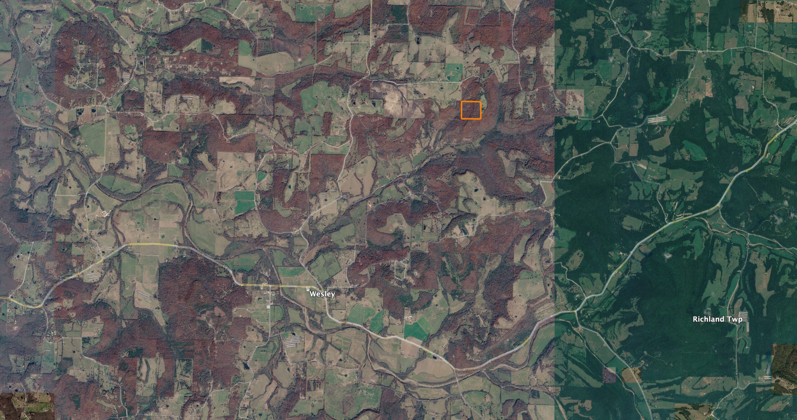 Location is the major highlight. The property sits just north of Wesley and just south of Highway 295. You’re less than 30 minutes from East Fayetteville, just a little over a half hour to the University of Arkansas, and under 30 minutes to Huntsville. It’s close enough to be convenient, but far enough out to feel like you’ve actually gotten away.
