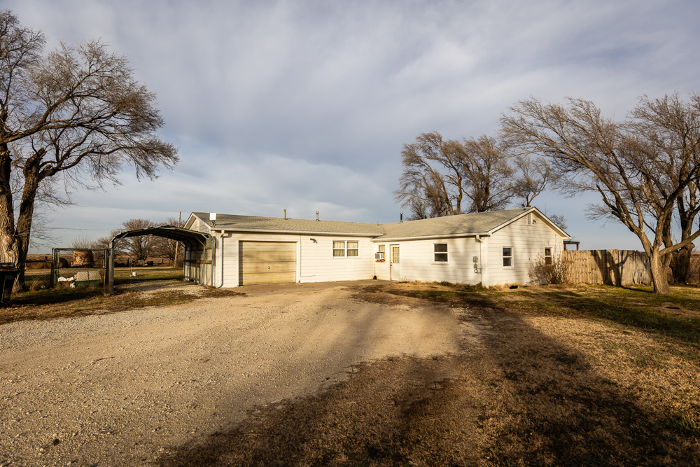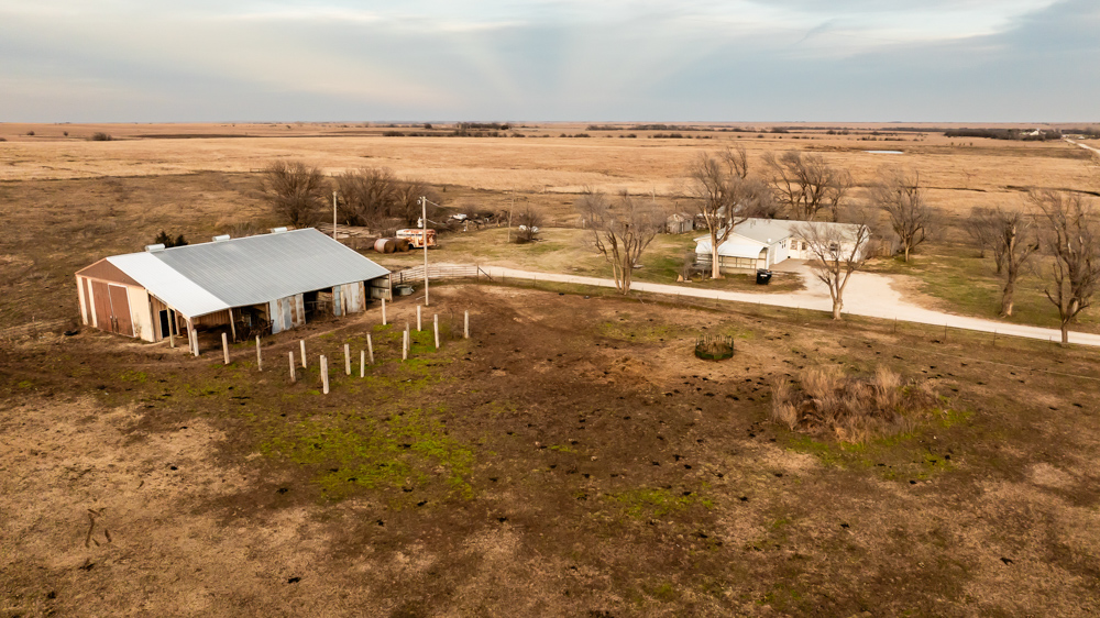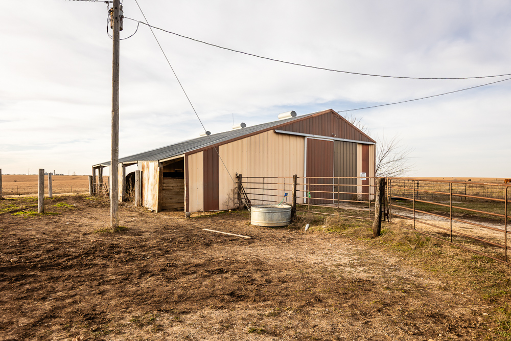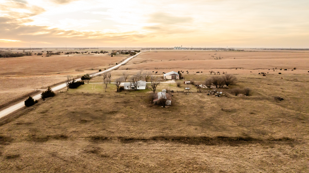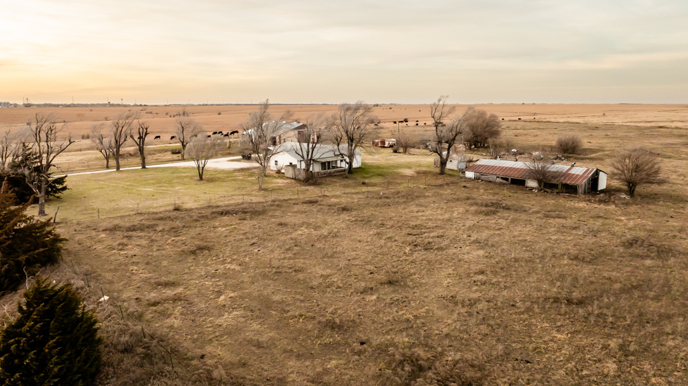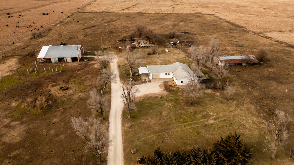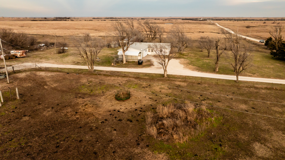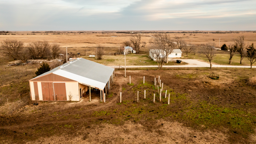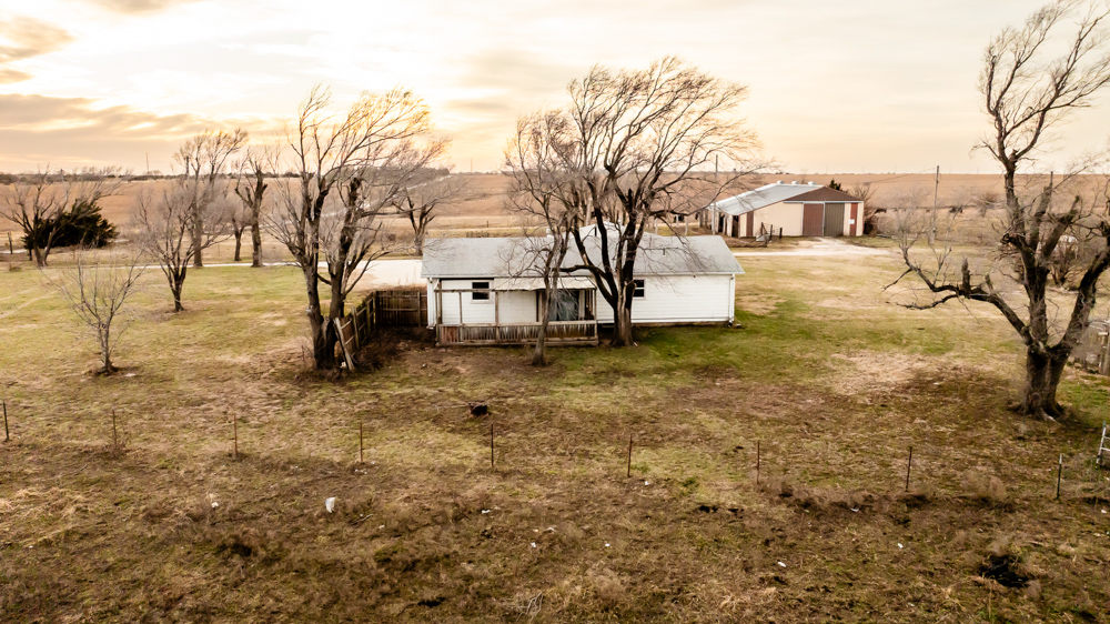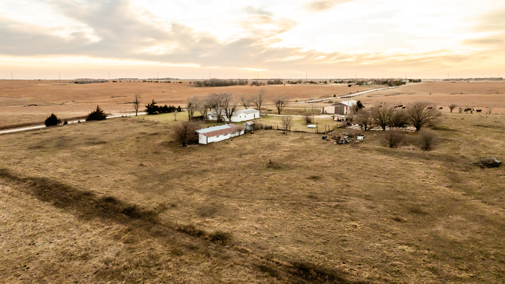 Located 1.5 miles east of Burns, Kansas, on the western edge of the beautiful Flint Hills, sits this home and shop on 10 +/- acres of land. The home was originally built in 1940 and added on to throughout the years consists of 1,488 finished square feet and has 3 bedrooms and 1 bathrooms all of which are on the main level. The main floor also has a kitchen, stand alone dining area, and a living room. There is a one-car attached garage, unfinished basement, and a covered back porch with tremendous views of the rolling Flint Hills! Heat and air are provided by a window unit and a propane heater in the living room. Well water is the property's water source, and wastewater is a lagoon.Outside, there is a 40'x60' shop building with a lean-to and a couple of stalls. Half of the floor is concrete, and there is an electric service to the building. Surrounding this building is a fenced-in area with water spigots perfect for horses, cows, or hobby animals. There are around 6 acres of Brome grass on the property, perfect for grazing or haying, all of which is fenced. There is also a 30'x60' loafing shed on the property.