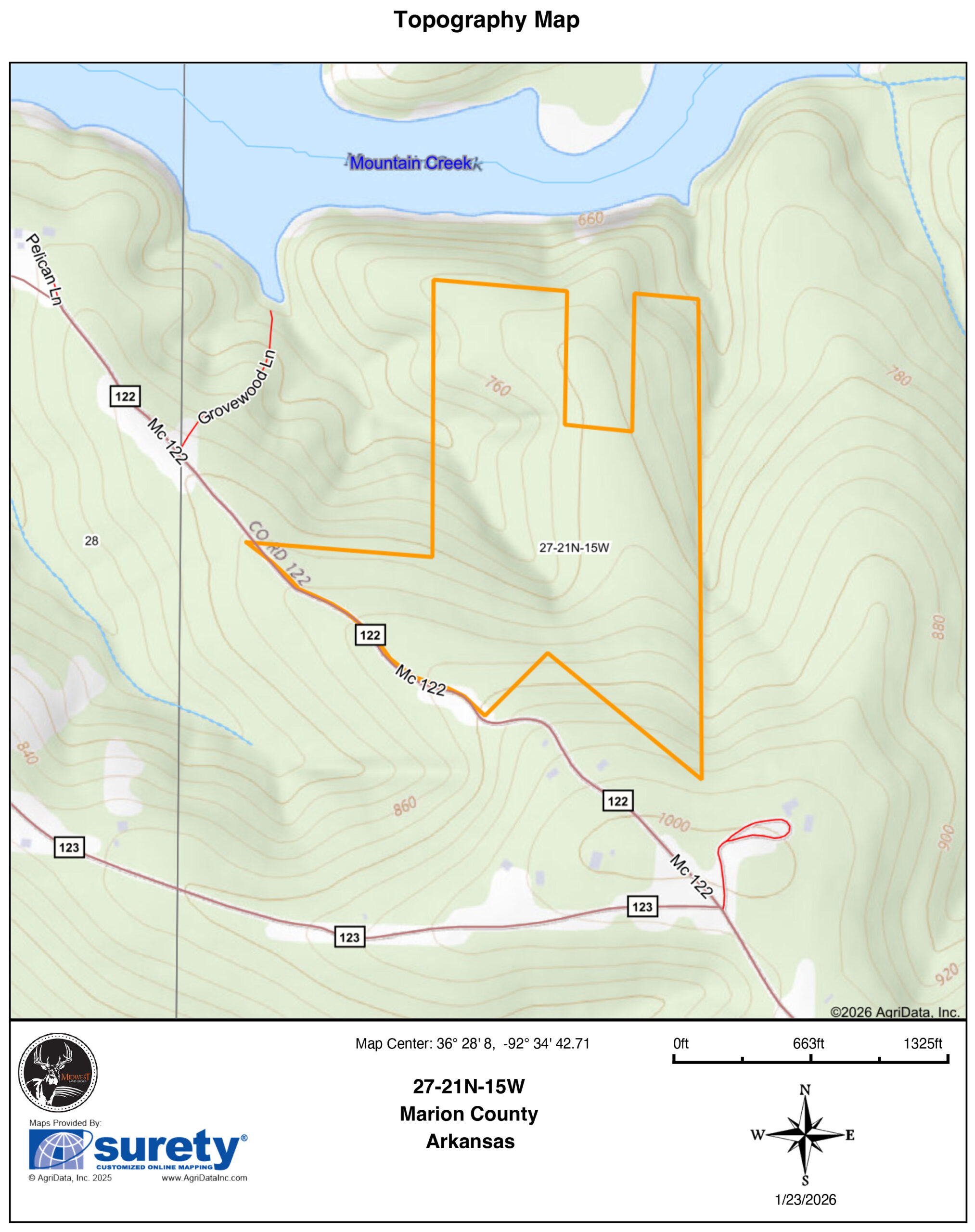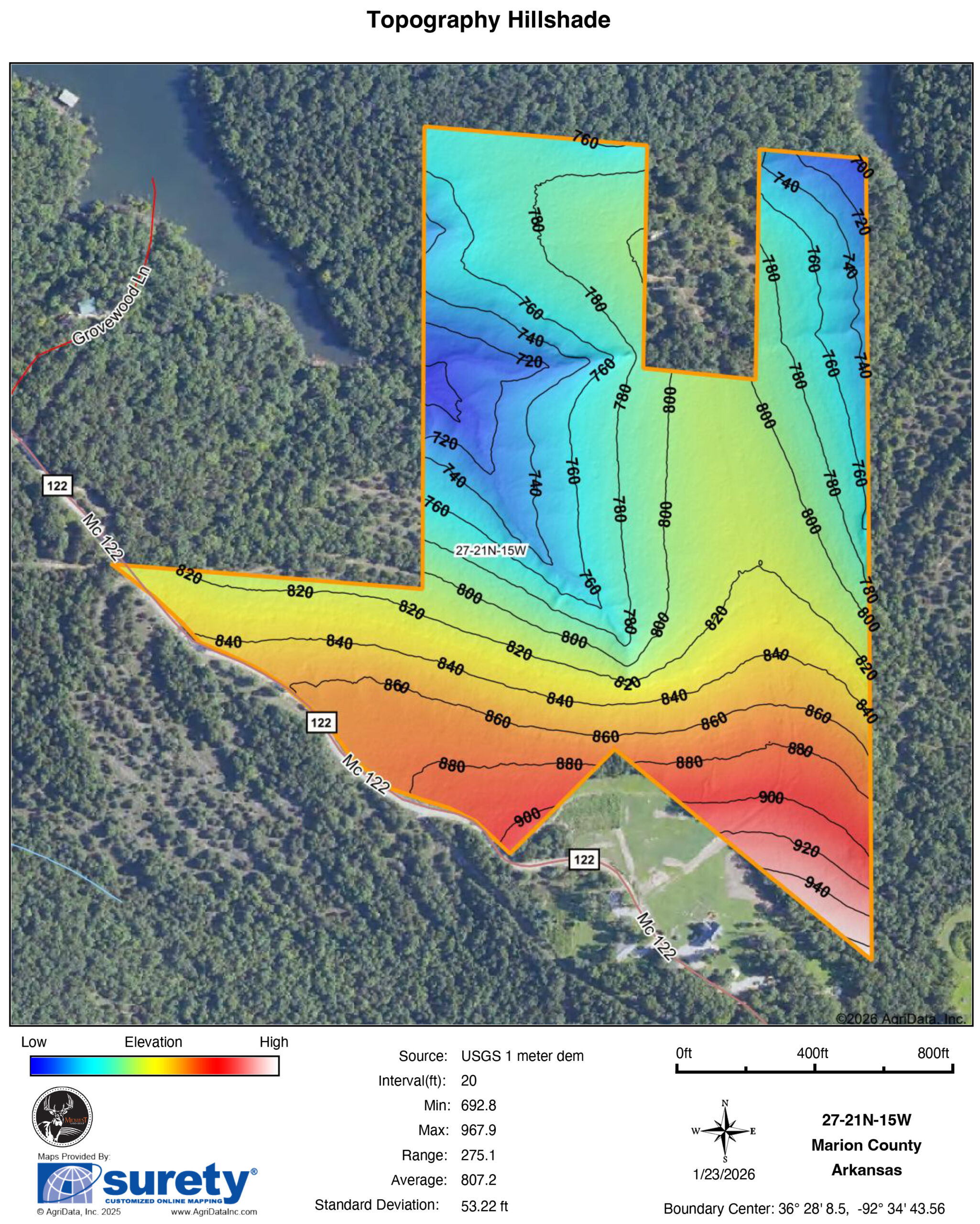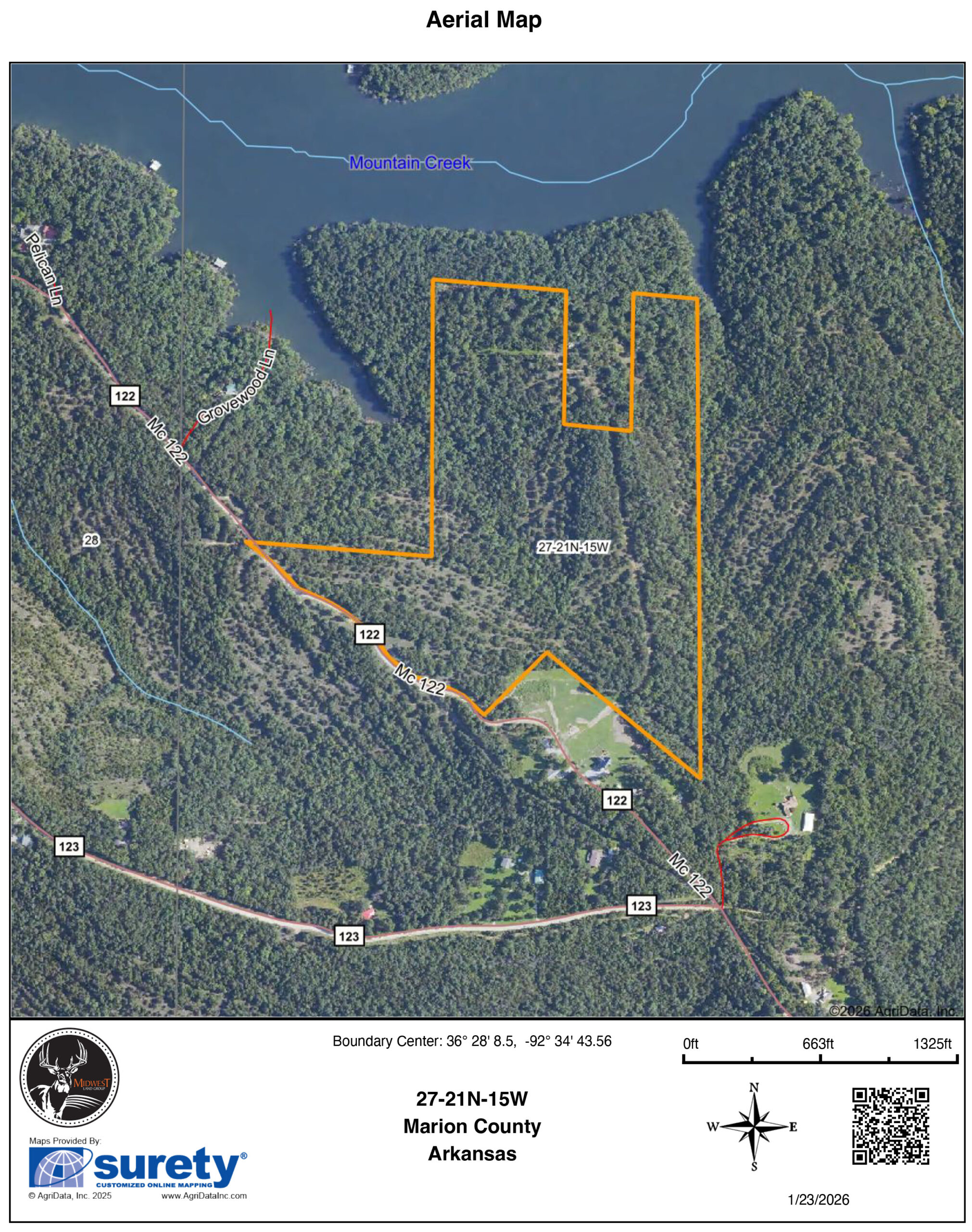 Midwest Land Group is proud to bring to market the Marion County 63, a beautiful 63 +/- acre tract located in north-central Arkansas just outside the quiet community of Oakland. As you approach the property along County Road 122, you’re immediately greeted by a scenic view of Bull Shoals Lake stretching off to the north and northwest—setting the tone for what this property has to offer. The tract features approximately 1,320 +/- feet of road frontage, with electricity along the road provided by North Arkansas Electric.The land itself offers a great mix of character and usability. Cedar pockets are broken up by small, meadow-like openings that create a park-like feel and add to the property’s visual appeal. Hardwood benches, gentle rolling terrain, small bluff formations, and scattered rock outcroppings give the tract depth and diversity. There are also natural drainages on both the east and west sides of the property that funnel water toward the coves of Bull Shoals, providing seasonal live water on the property itself.
