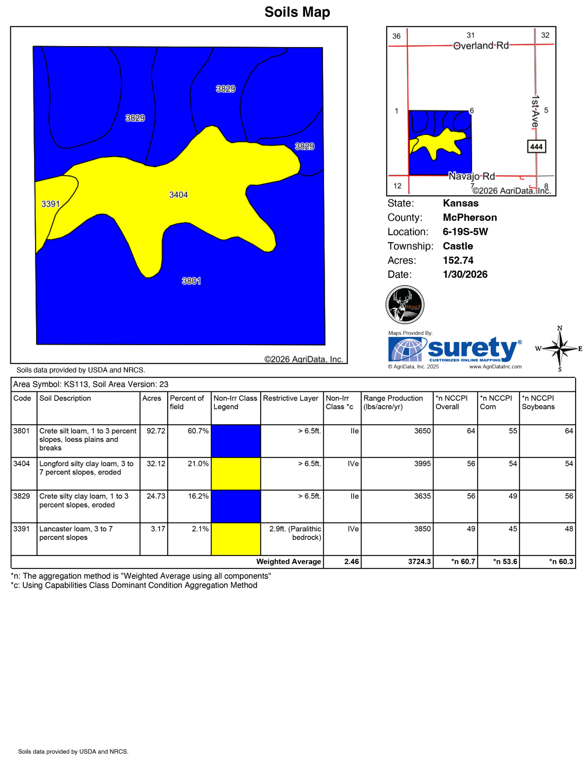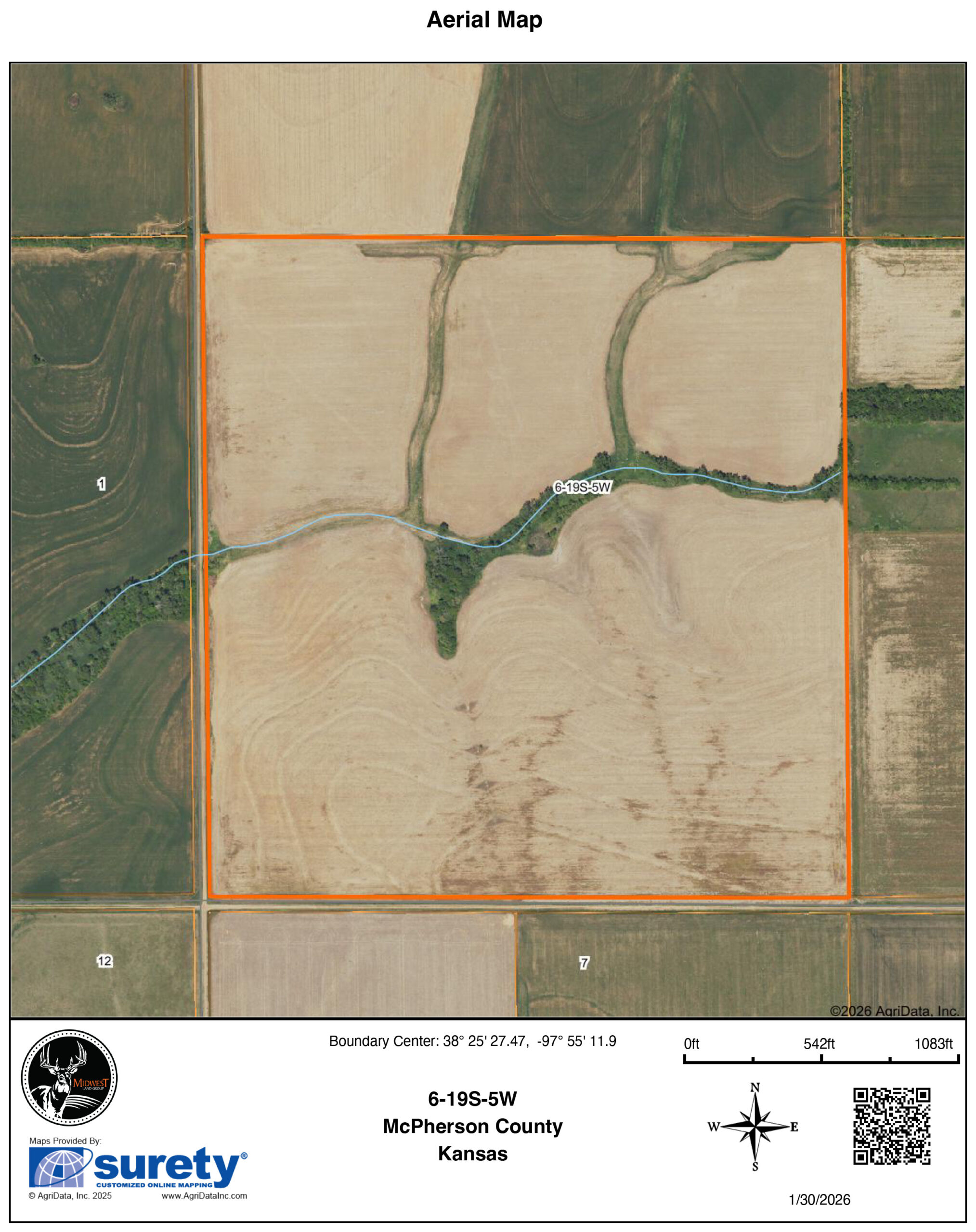 The tillable land is over 60% Class II Crete Silt loam, and with the lower bottom land being over 20% Class IV Longford silty clay loam. The farm brings a nice NCCPI score of 60.7 to the table. FSA acres are estimated at 151 acres. McPherson County has an average rainfall of 28 to 32 inches of rain that will help keep the crops on this farm yielding. The farm has good terraces in place with concrete overflows to keep erosion down and water moving where it needs to. Waterways are all in great shape and provide any owner/tenant additional hay opportunities each year. The farm is currently in wheat, and possession will be given after the wheat is harvested in 2026. For any questions, please call the listing agent, Tyler Heil, at (913) 207-4541.