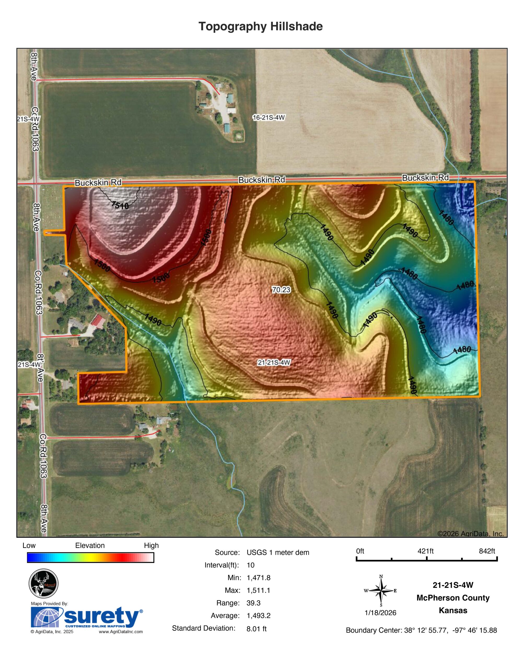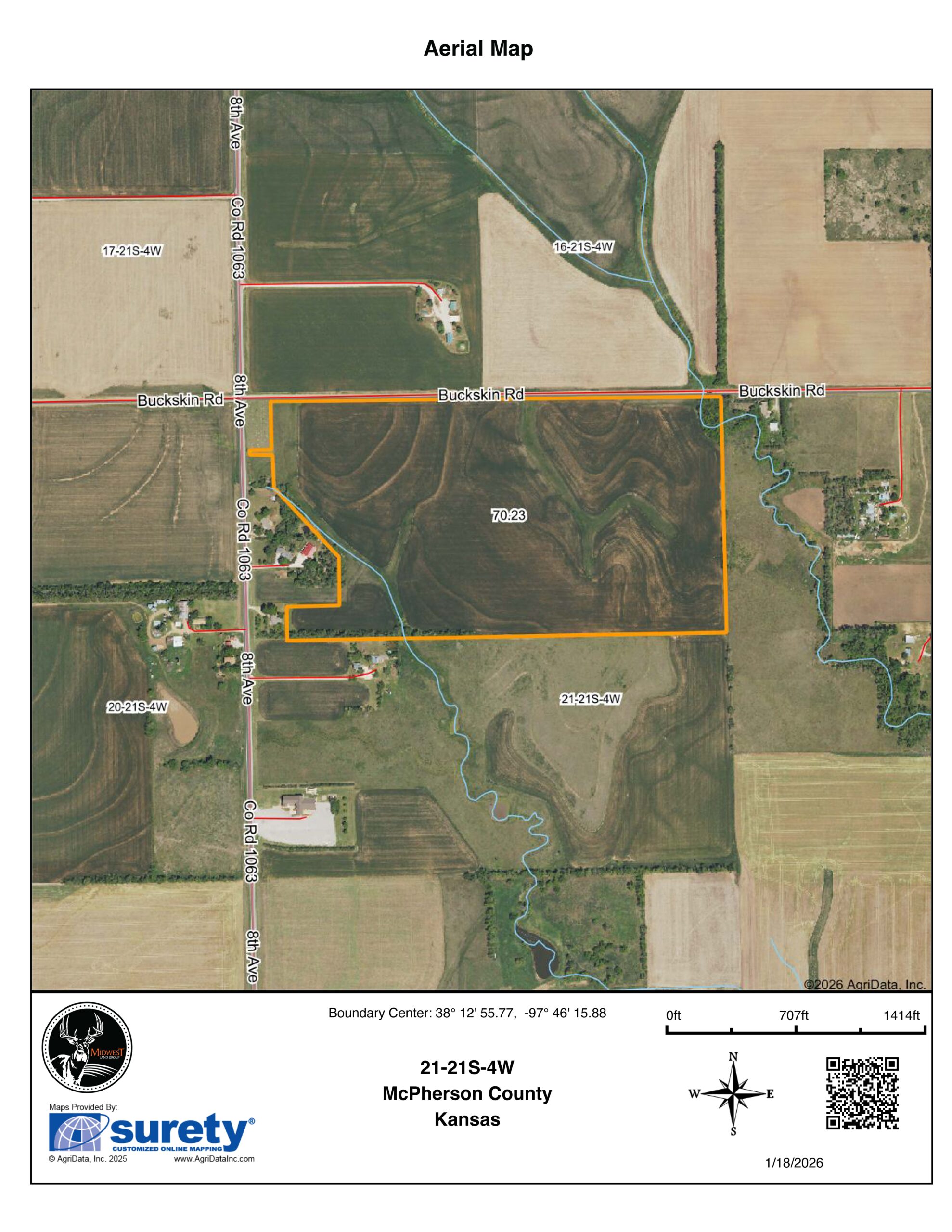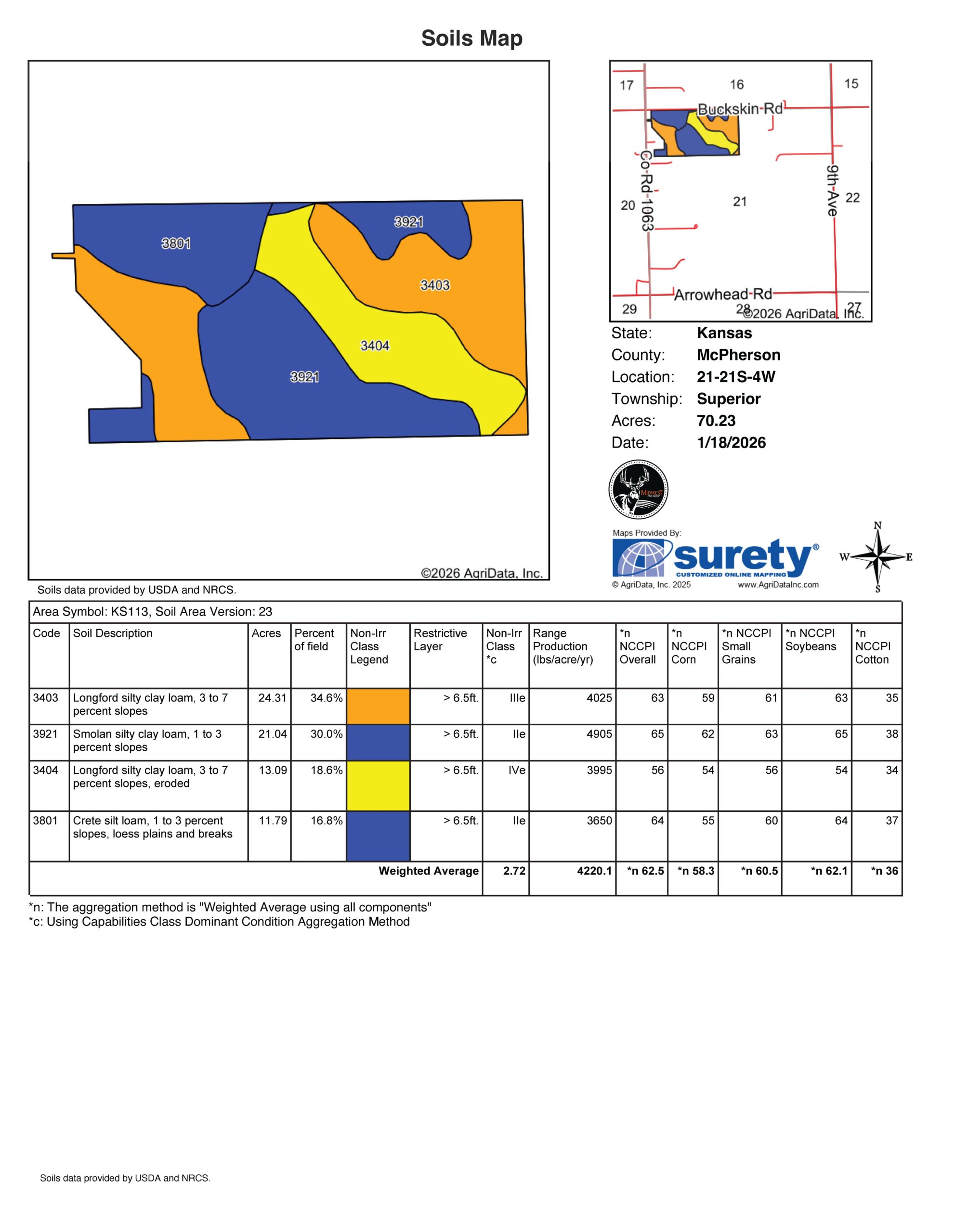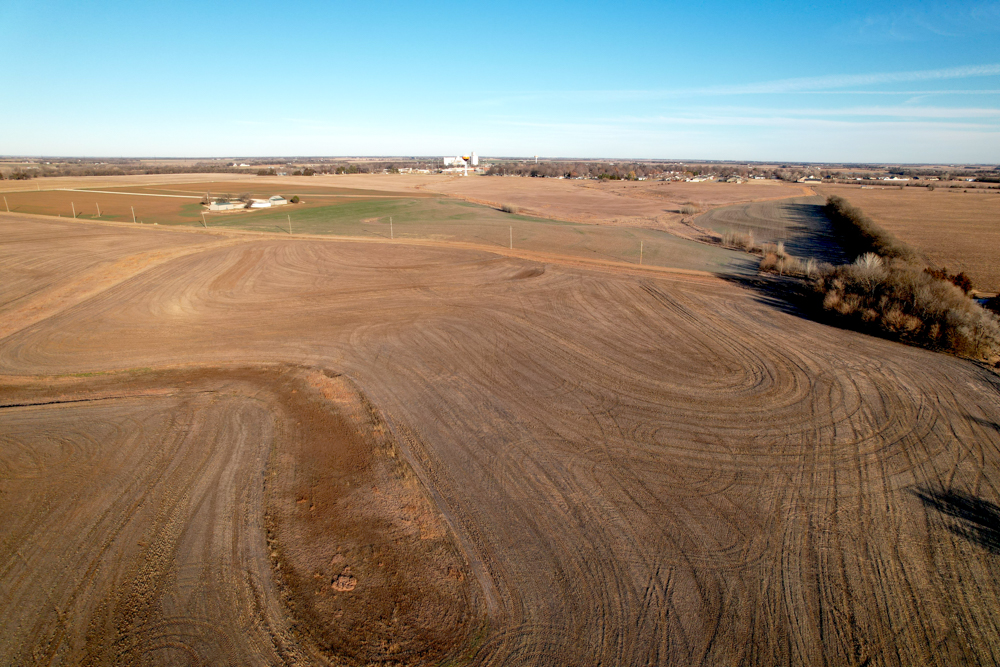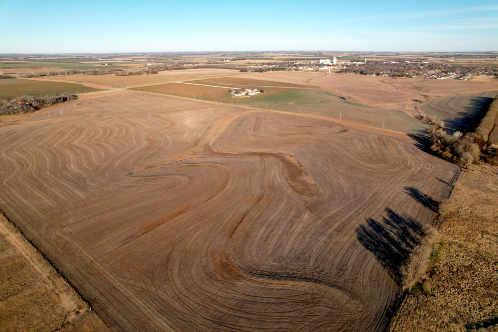 Just south of Inman is 70 +/- acres of fertile cropland available to plant this spring. There is access from Buckskin Road and paved 8th Avenue. 8th Avenue turns into Main Street in Inman and to the south, Buhler Haven Road. This location is easily accessible from K61 Highway, Inman, and Buhler. The farm is characterized by a gentle slope from northwest to Southeast. The terraces have been well kept, and clean waterways drain the 66.82 acres of FSA cropland. The soils are fertile and have dependably generated excellent yields. The NCCPI Productivity Index is 63, well above average for the area. Silty Clay Loam soils with a little elevation change make efficient use of crop inputs. 41.8 wheat base acres with a 54 PLC yield, and 20.20 acres of sorghum base with PLC yield 86bu. Currently in soybean stubble, the farm is available for spring possession and planting of your full-season crop.