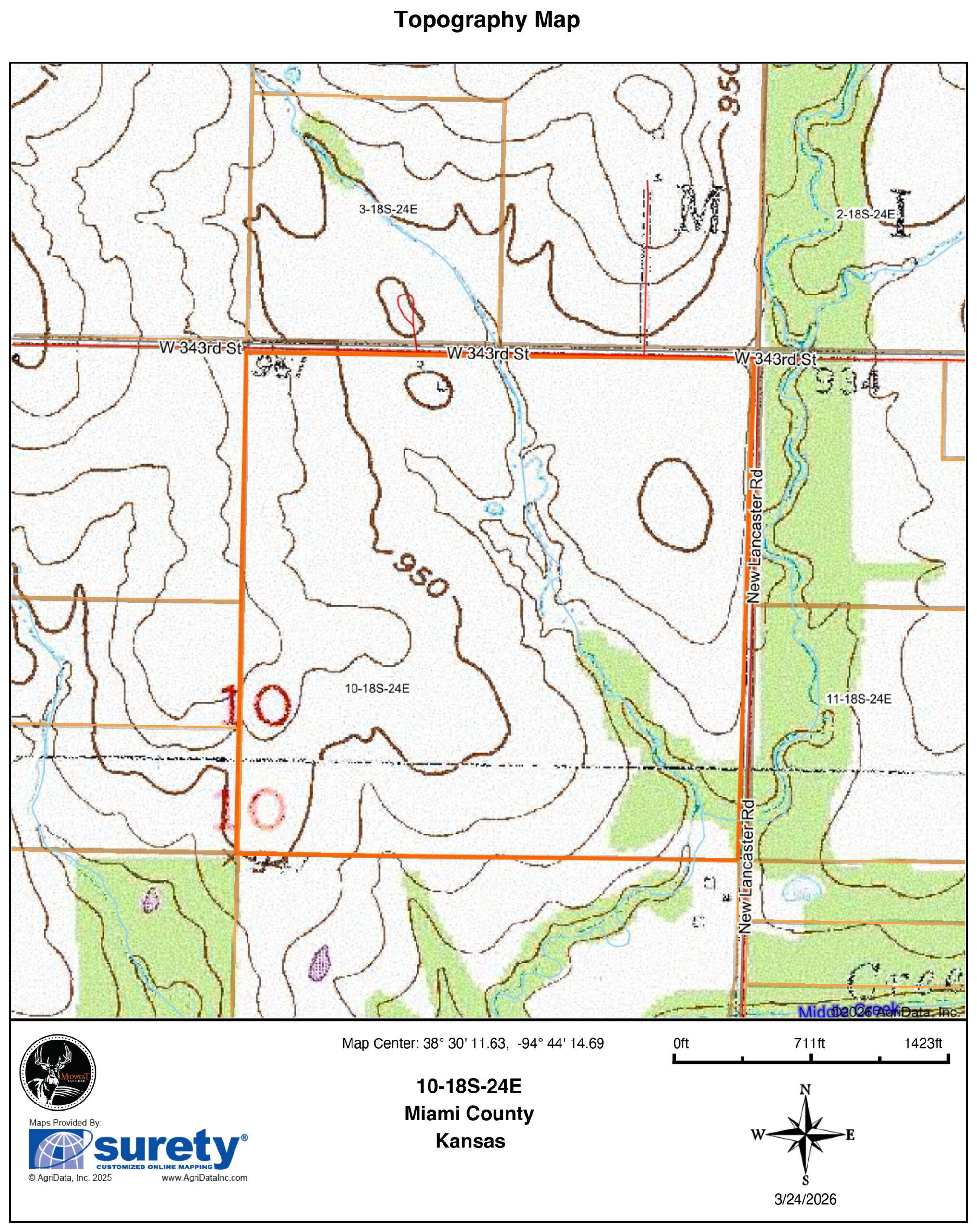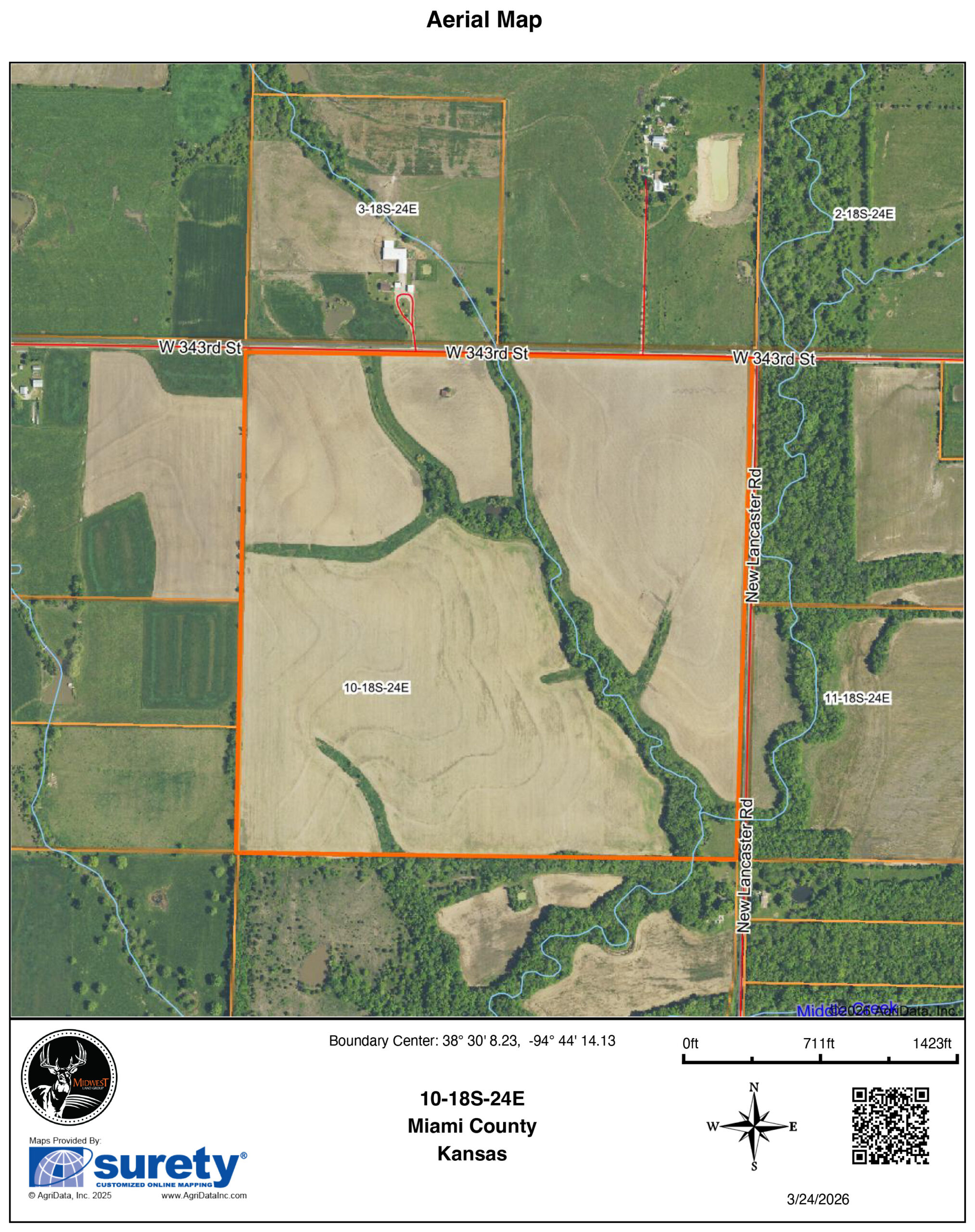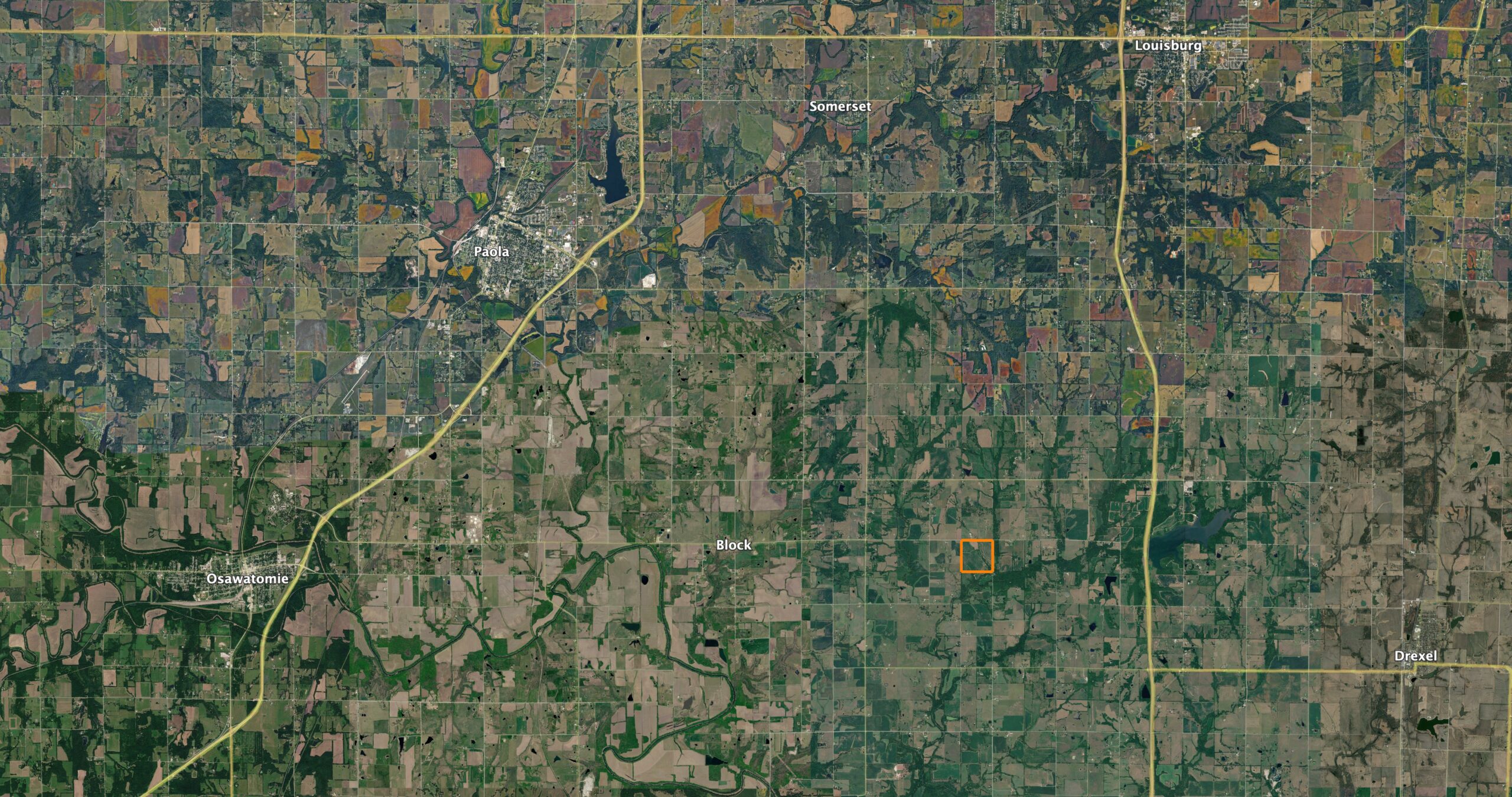 Set in the rolling countryside just outside Paola, this exceptional 157 +/- acre offering presents a rare convergence of farmland, natural beauty, recreation, and luxury estate potential. Positioned prominently at 343rd Street and New Lancaster Road, with road frontage along both the north and east boundaries, this property delivers accessibility.