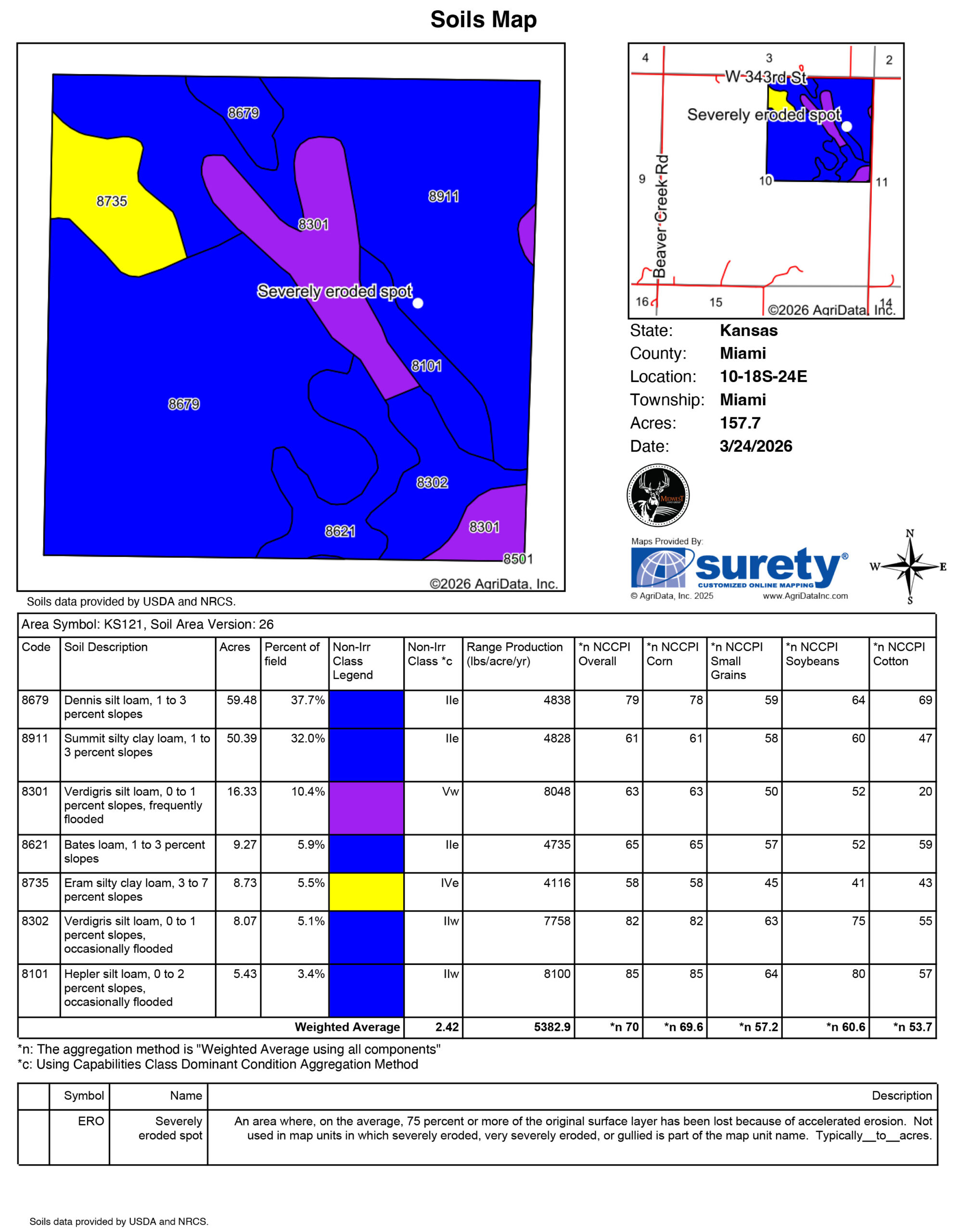 At its core lies 147.29 acres of highly productive tillable ground, dominated by Class II soils including Dennis silt loam and Summit silty clay loam—an ideal foundation for consistent agricultural success. The waterways enrolled in CRP not only preserve the integrity of the land but also generate supplemental income, enhancing the farm’s long-term value.