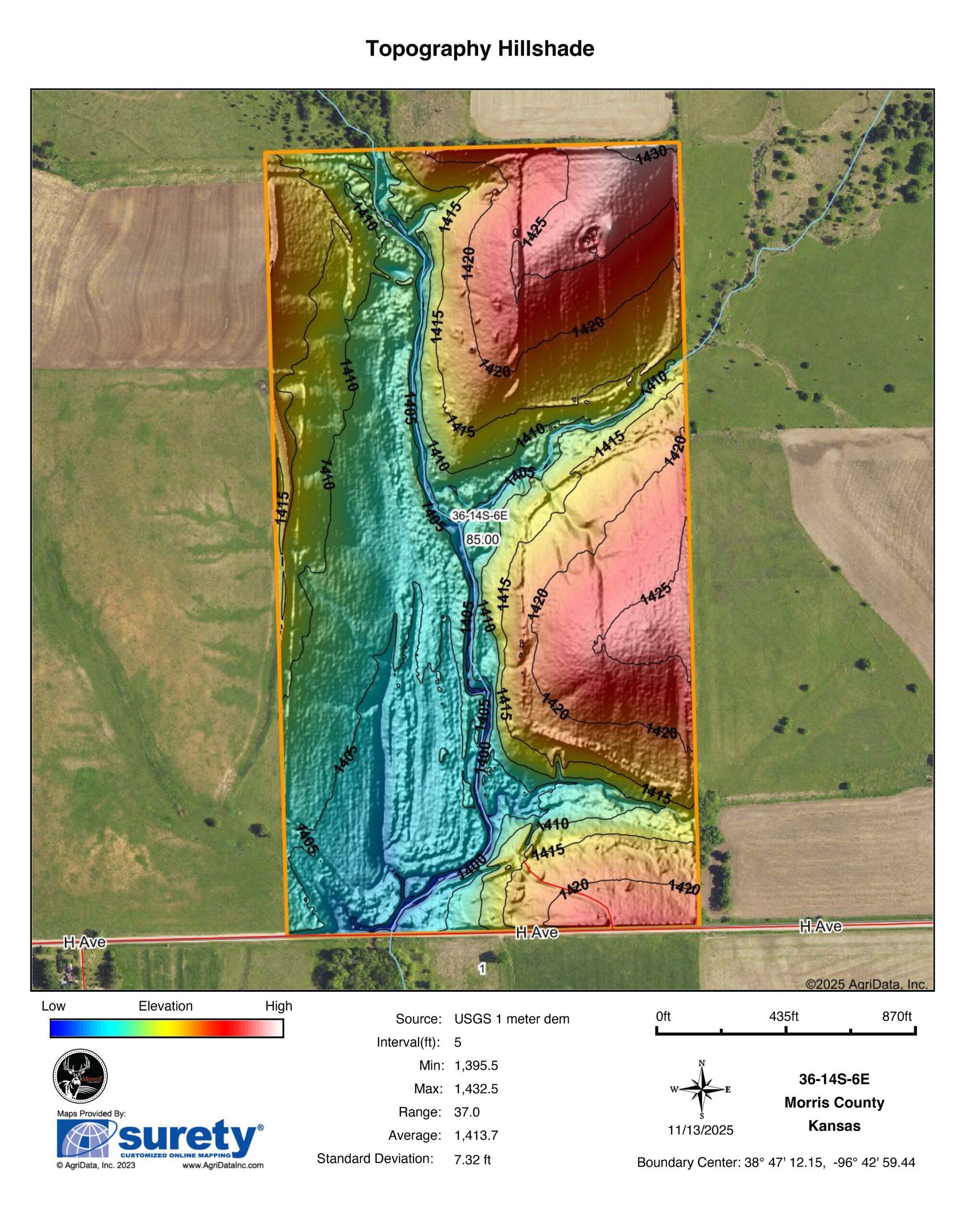 The combination of habitat diversity, reliable food sources, and water creates outstanding opportunities for whitetail deer, turkey, quail, and waterfowl hunting. The property is located in Kansas Deer Management Unit 14, an area well known for trophy whitetail bucks.