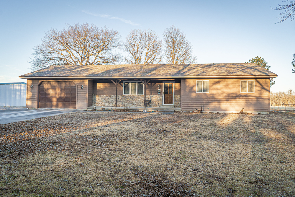 Built in 1990, the home offers 1,450 square feet of open-concept living on the main level, thoughtfully positioned to capture breathtaking Kansas sunrises. Double sliding doors open to the back porch, creating a private front-row seat overlooking your own land, livestock, and wide-open skies. The home features 3 spacious bedrooms and 1.5 baths, while the 725 square foot partially finished basement serves as an ideal entertainment space, complete with a built-in media center for hosting friends and family.
