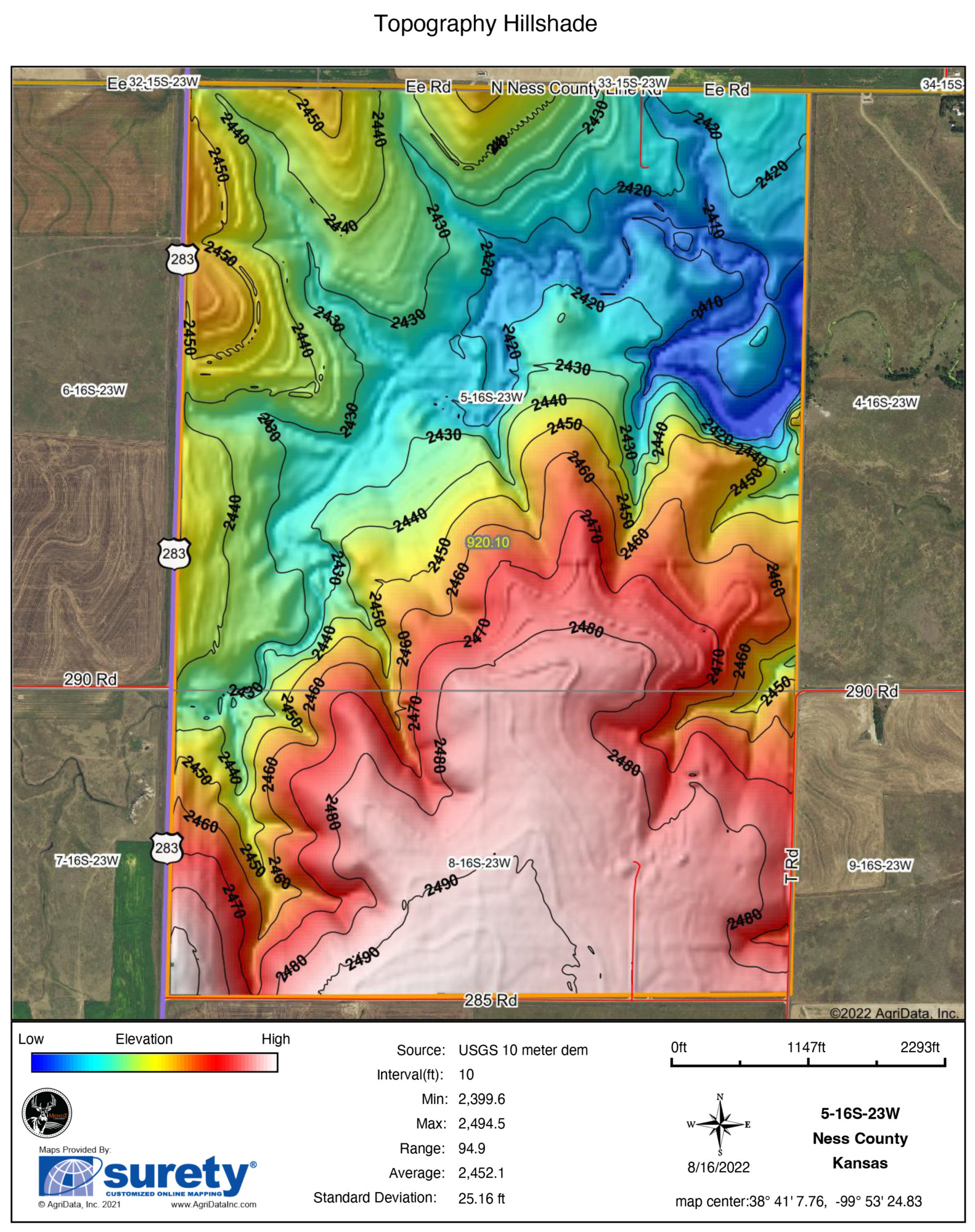 The soils on the tillable ground are excellent, with crop production ratings up in the 70’s. Harney and Uly silt loam make up the majority of the tillable acres. There are currently 135.83 +/- acres of wheat that will be cut this summer, 143.21 +/- acres planted to milo, 142.2 +/- acres of fallow ground, and 66 +/- acres of CRP making up the tillable acres. All of the tillable ground is being custom farmed, so possession can be passed at closing.