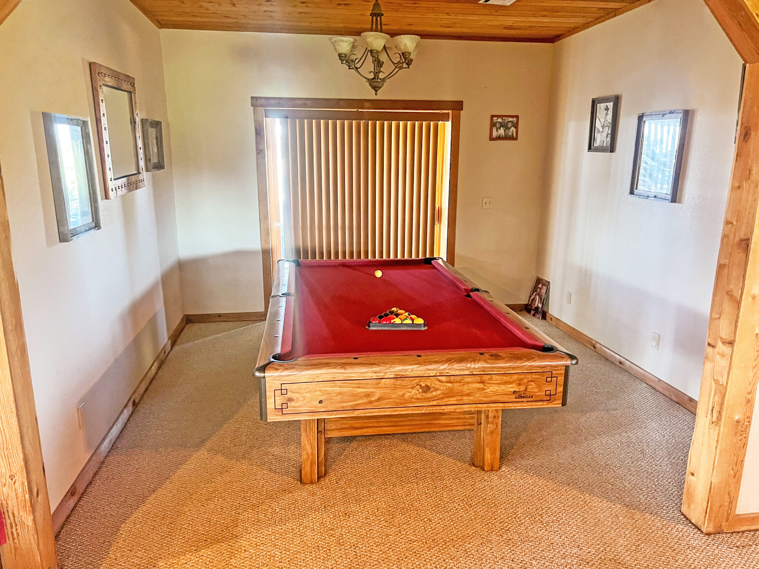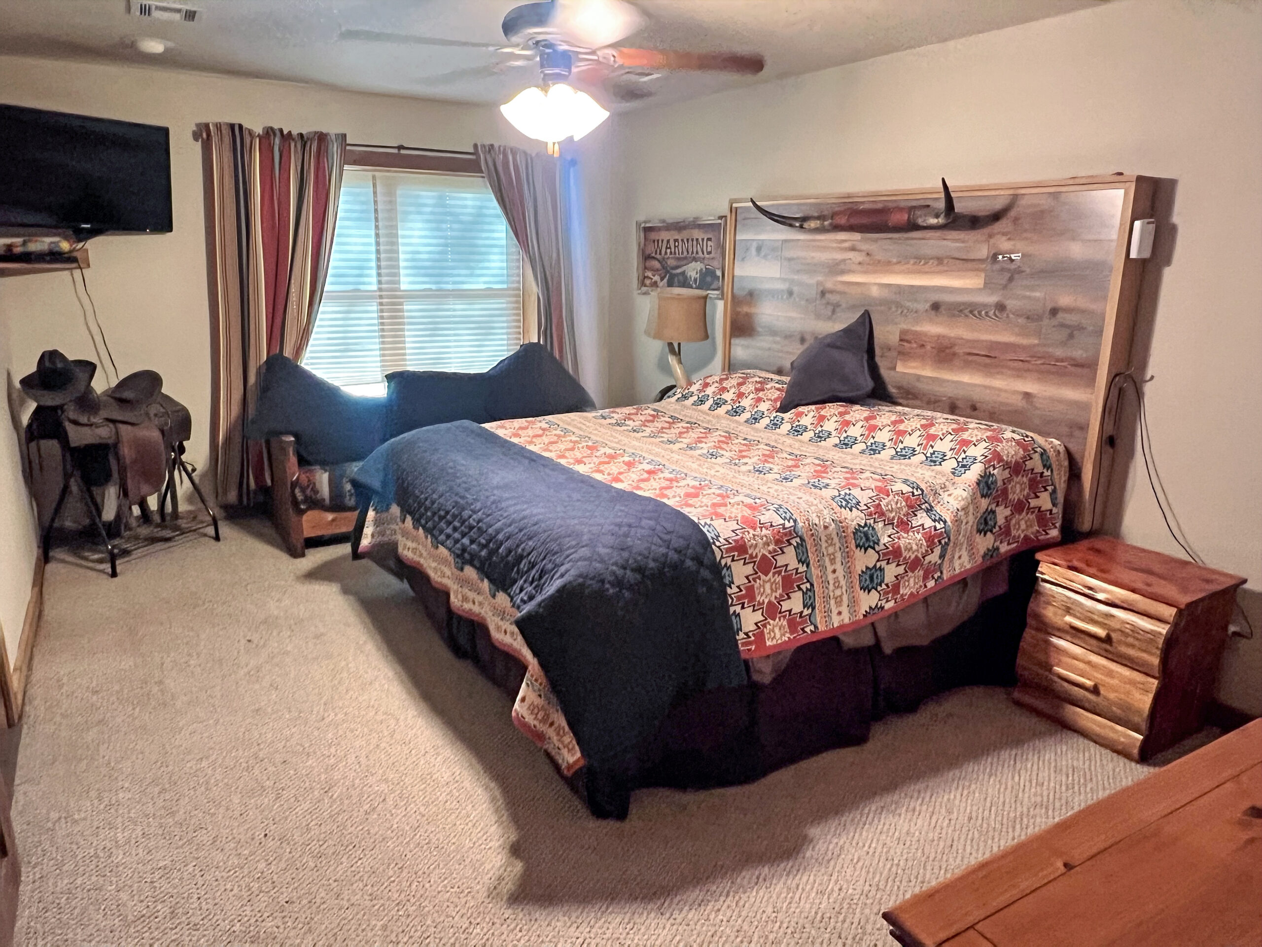 Ranch infrastructure includes perimeter and cross-fencing dividing the land into 4 pastures, a pipe corral and working pens, a 50’x42’ concrete-floored shop/barn with 220 electric, bathroom, tack room, and storage, plus a 30’x30’ additional shop and two more outbuildings. The property also includes a greenhouse, a 4-stall heated and cooled dog kennel with outdoor runs, and a custom-built dirt race track with a small cabin and an outdoor movie screen for unique family fun.