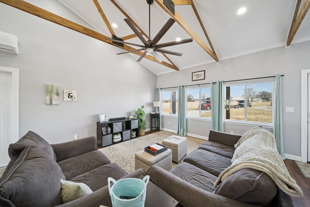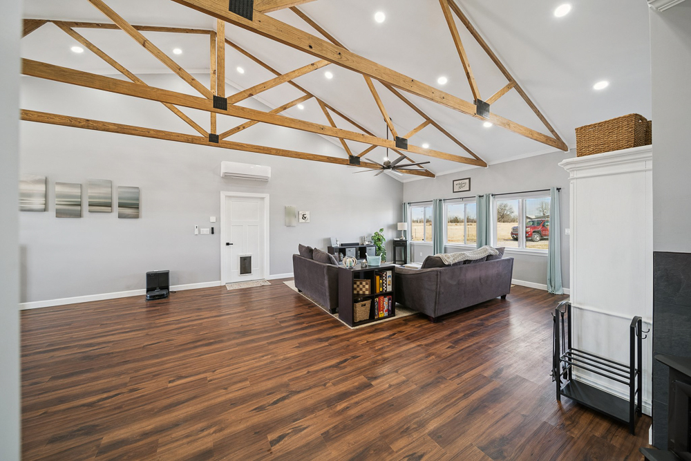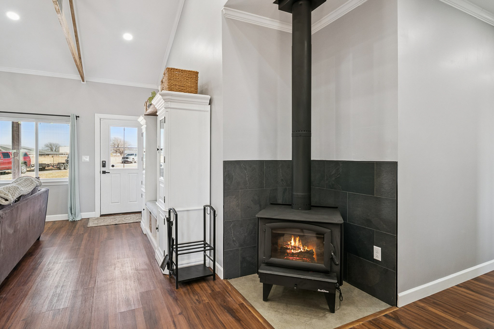Built in 2023, this modern rustic barndominium, 3 beds, 2 bath, 2,000 square foot home blends efficiency, craftsmanship, and country lifestyle into one turn-key property. From the moment you step inside, vaulted ceilings and exposed wood trusses create a dramatic yet inviting space. Radiant heated floors run beneath luxury vinyl plank flooring, while a centrally positioned wood-burning stove anchors the open-concept living area.