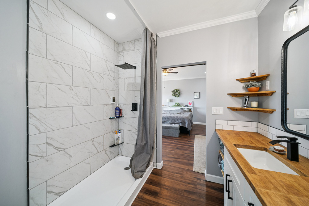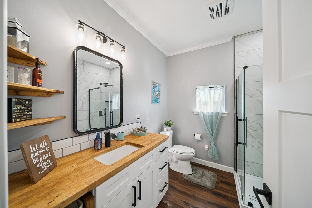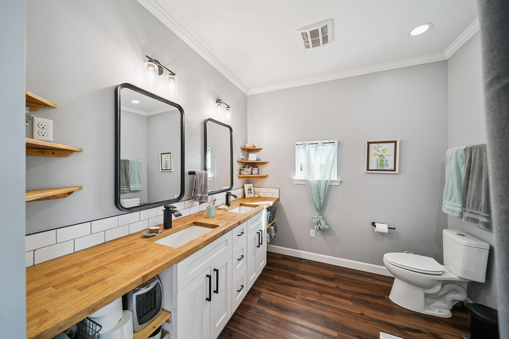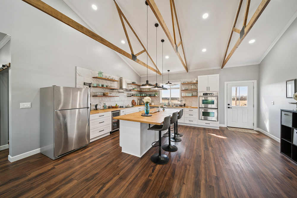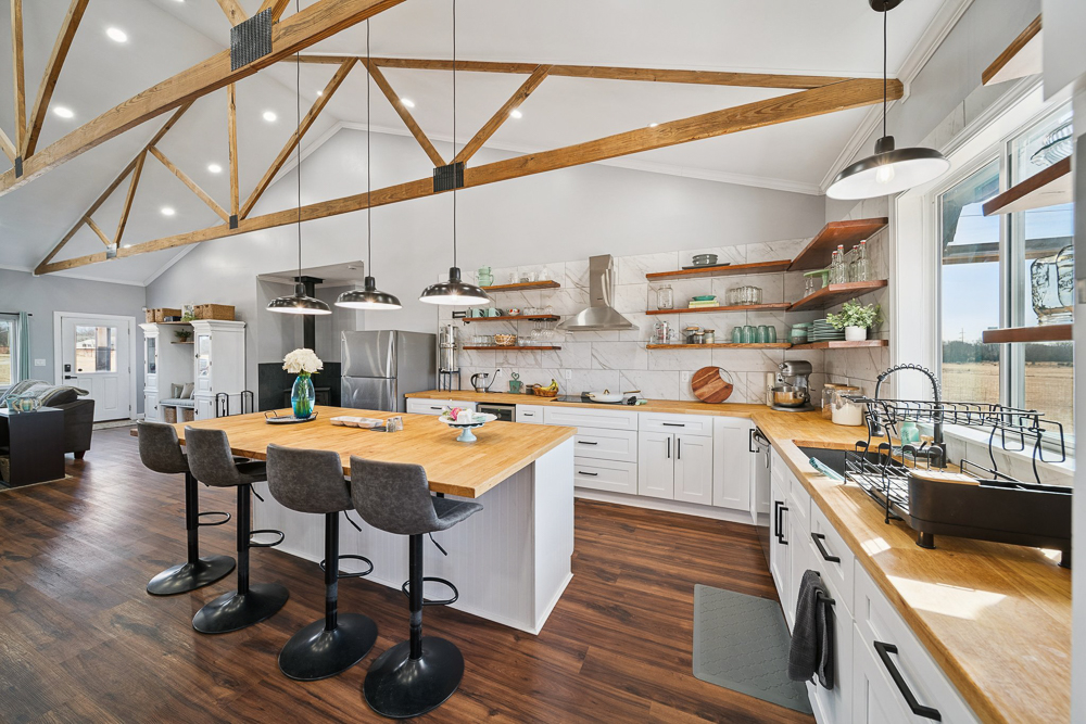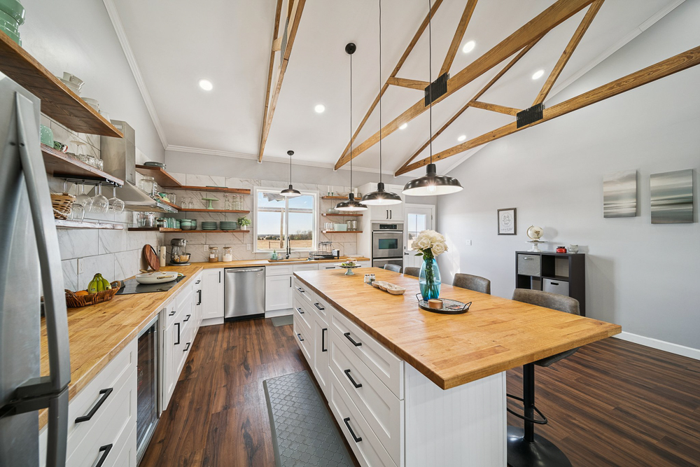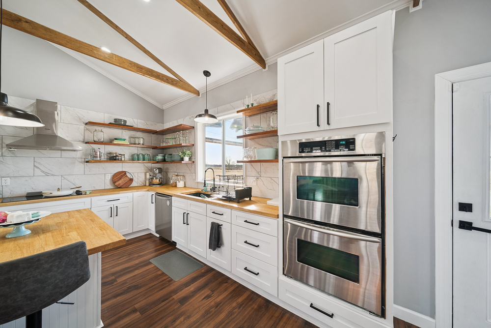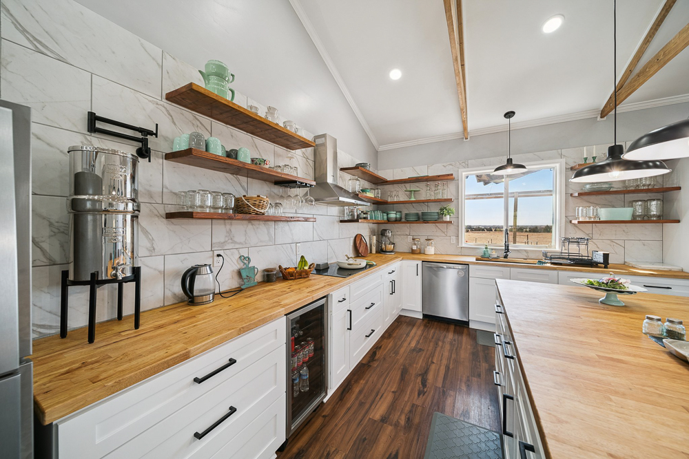 The kitchen is both functional and beautiful — butcher block countertops, stainless steel double ovens, a farmhouse sink, open shelving, custom cabinetry, and a generous island perfect for gathering.