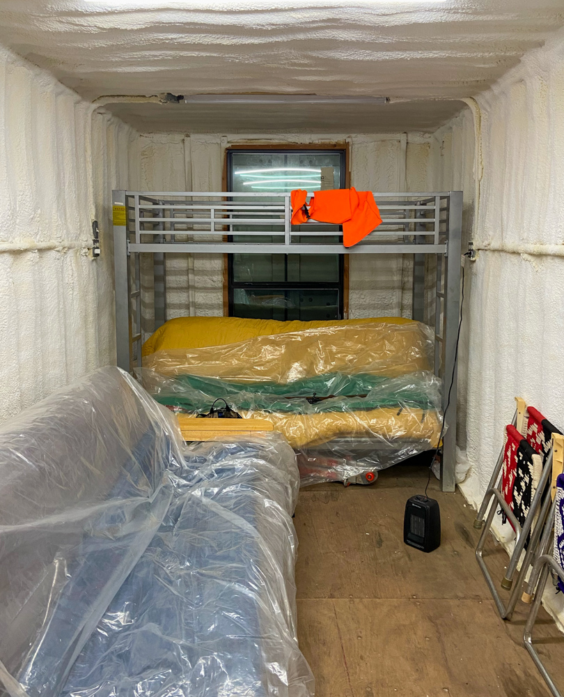 • Shipping container is spray‑foam insulated with a sliding door, large window, and attached deck