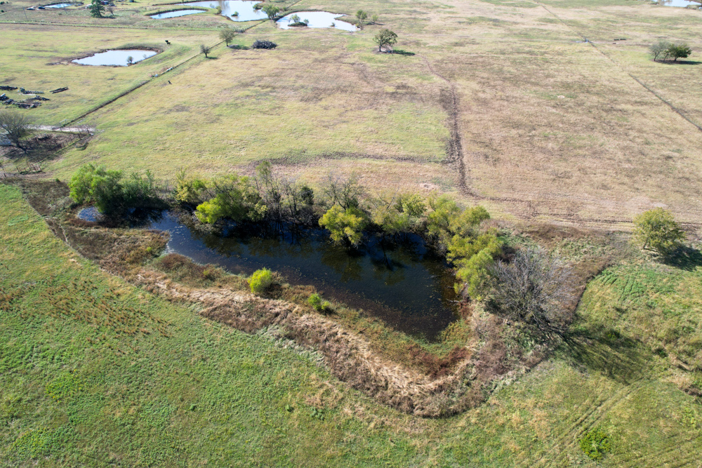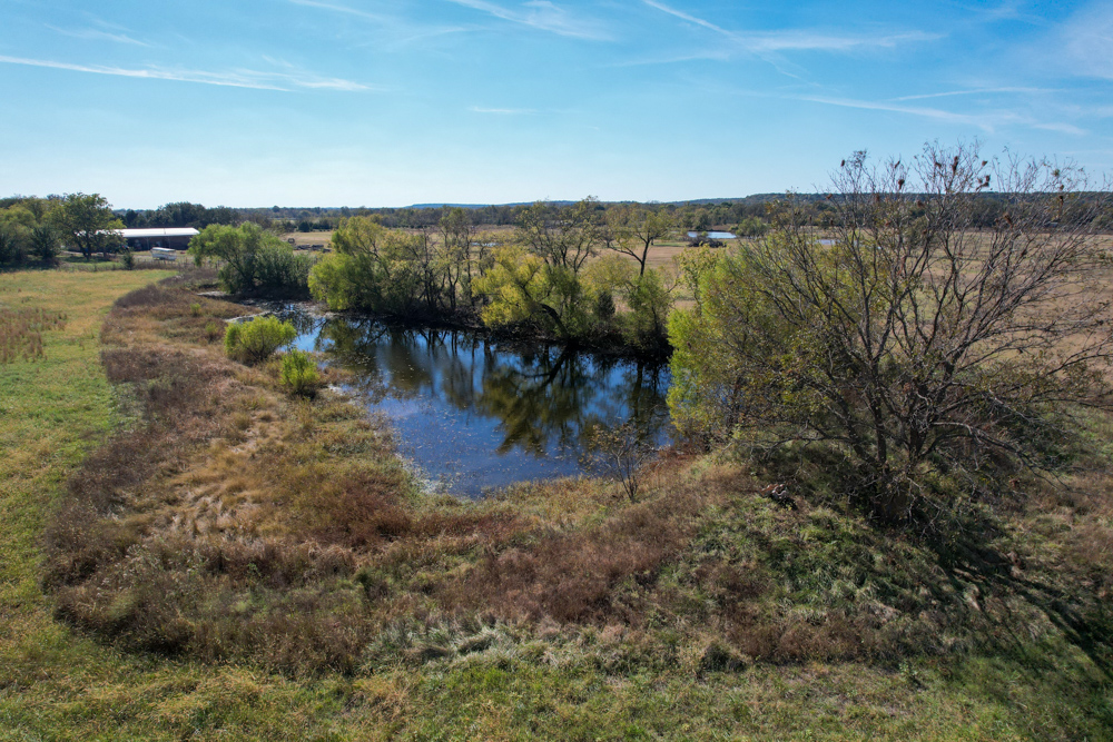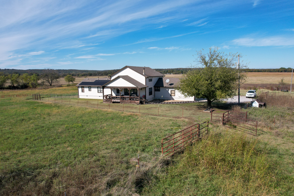 Outdoor living is equally appealing, with three covered porches and a new walkway connecting the driveway to the south entrance. The property is enhanced by scattered mature trees and a year-round pond that adds beauty and utility to the landscape. The land is perimeter fenced and cross-fenced, perfect for livestock or hobby farming, and accessed by a private drive off a main paved county road.