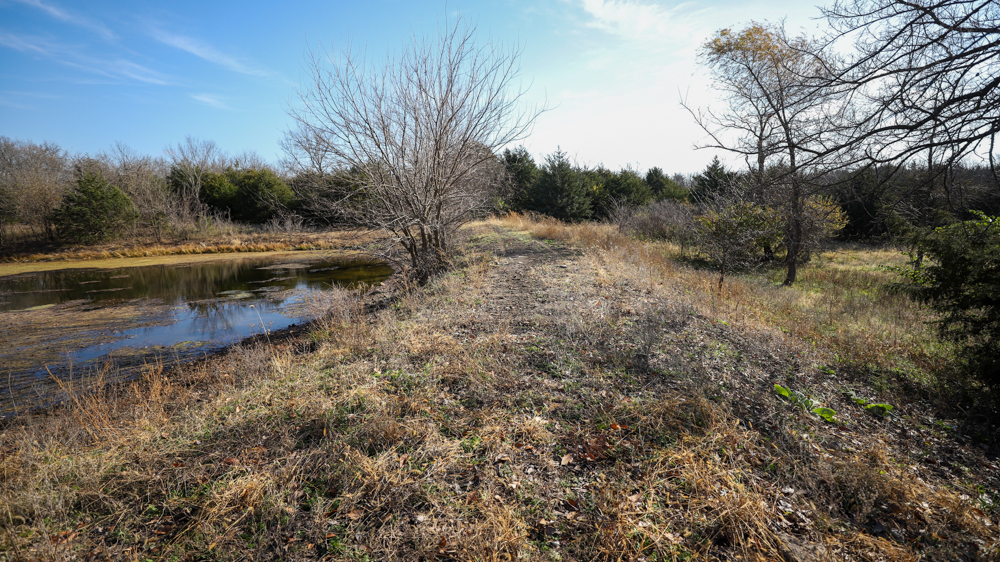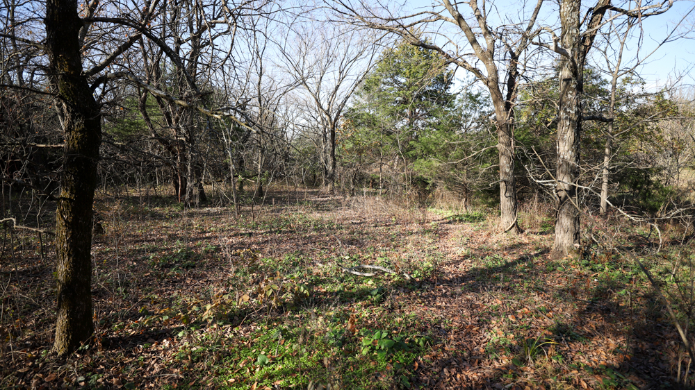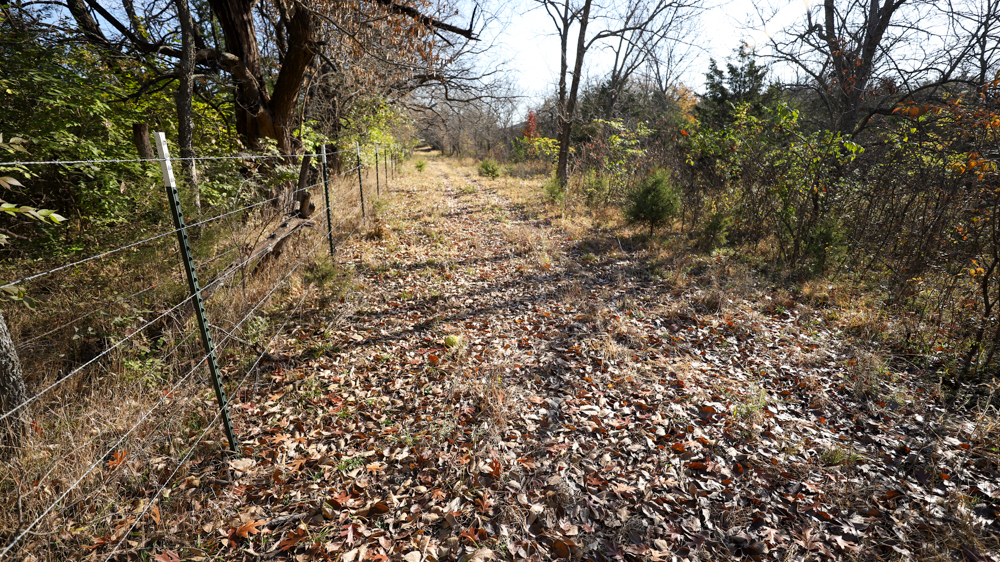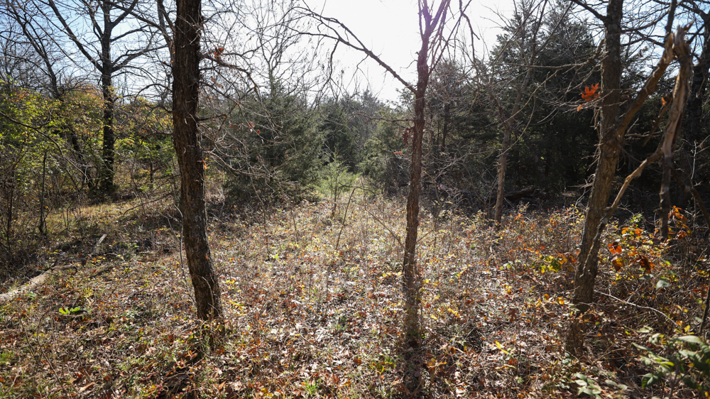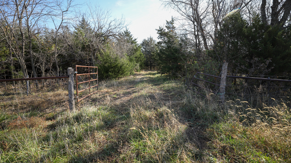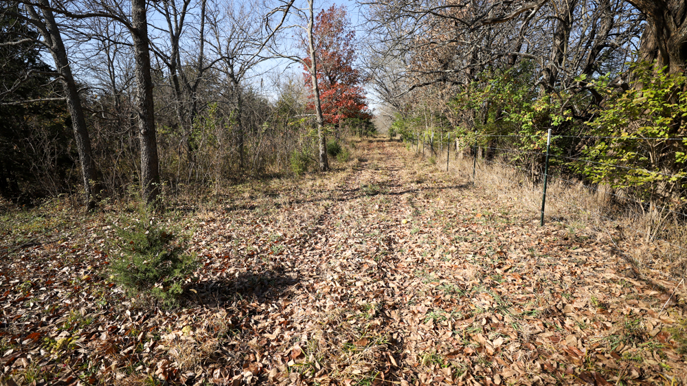 The property is heavily wooded with dense thickets composed primarily of oak, hedges, and eastern red cedar trees. A well-established trail system runs throughout, providing easy access for hunting, hiking, or ATV use. Additional features include a watering pond and excellent barbed wire fencing.