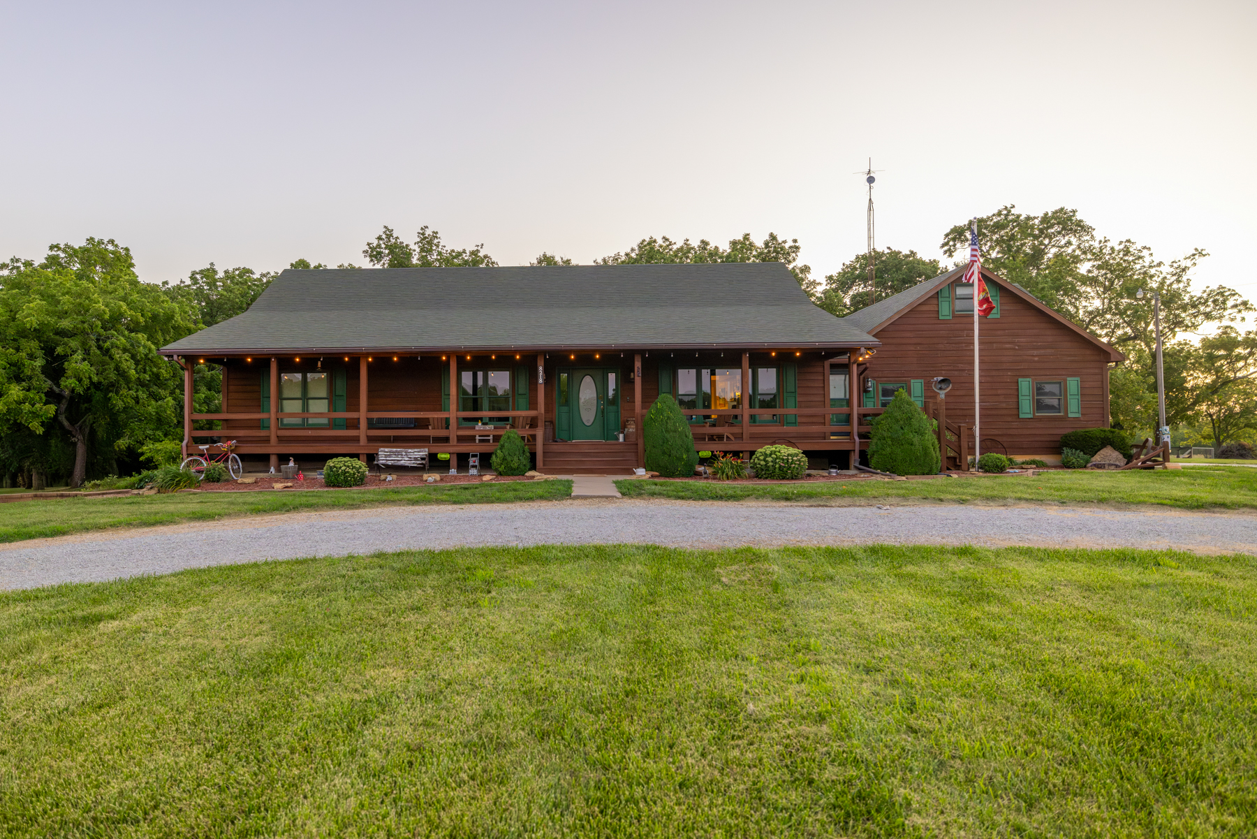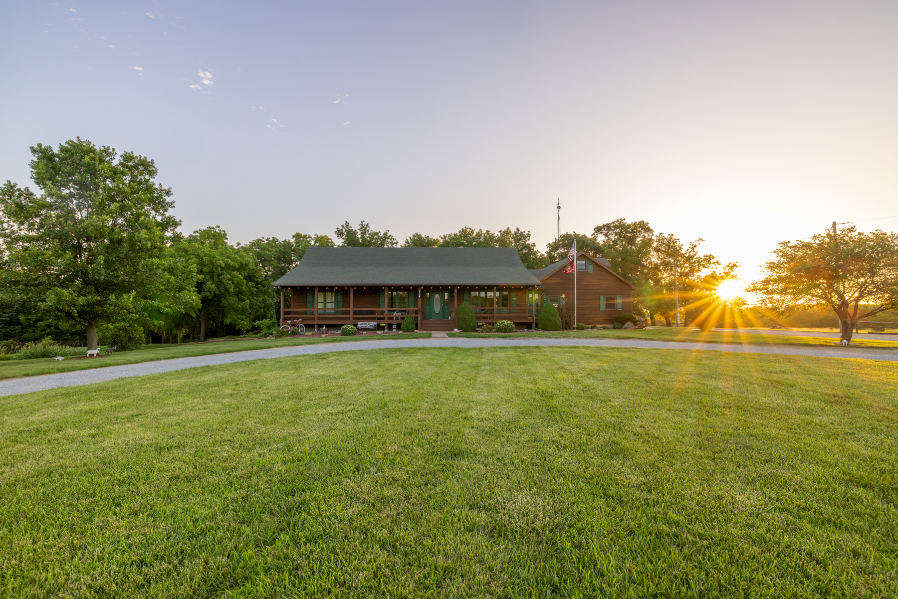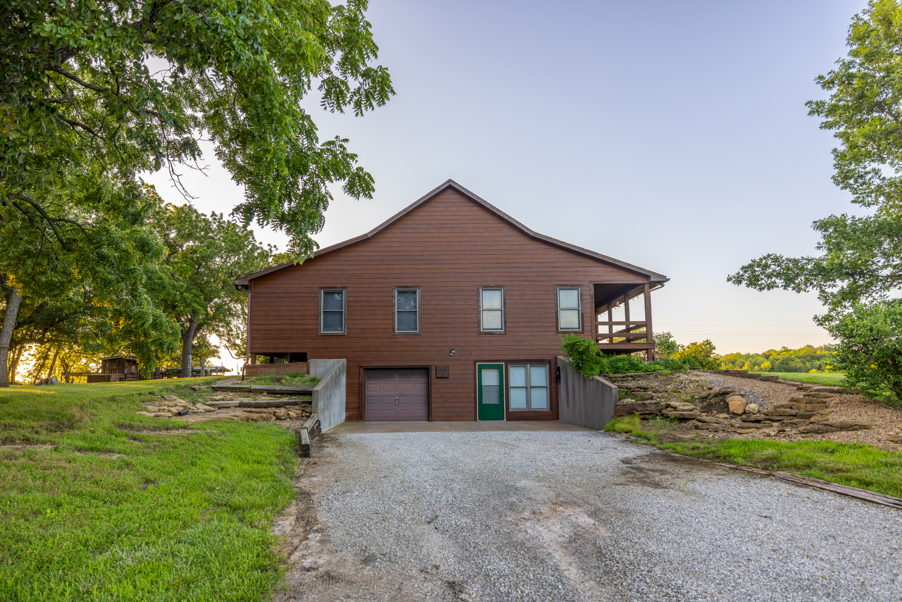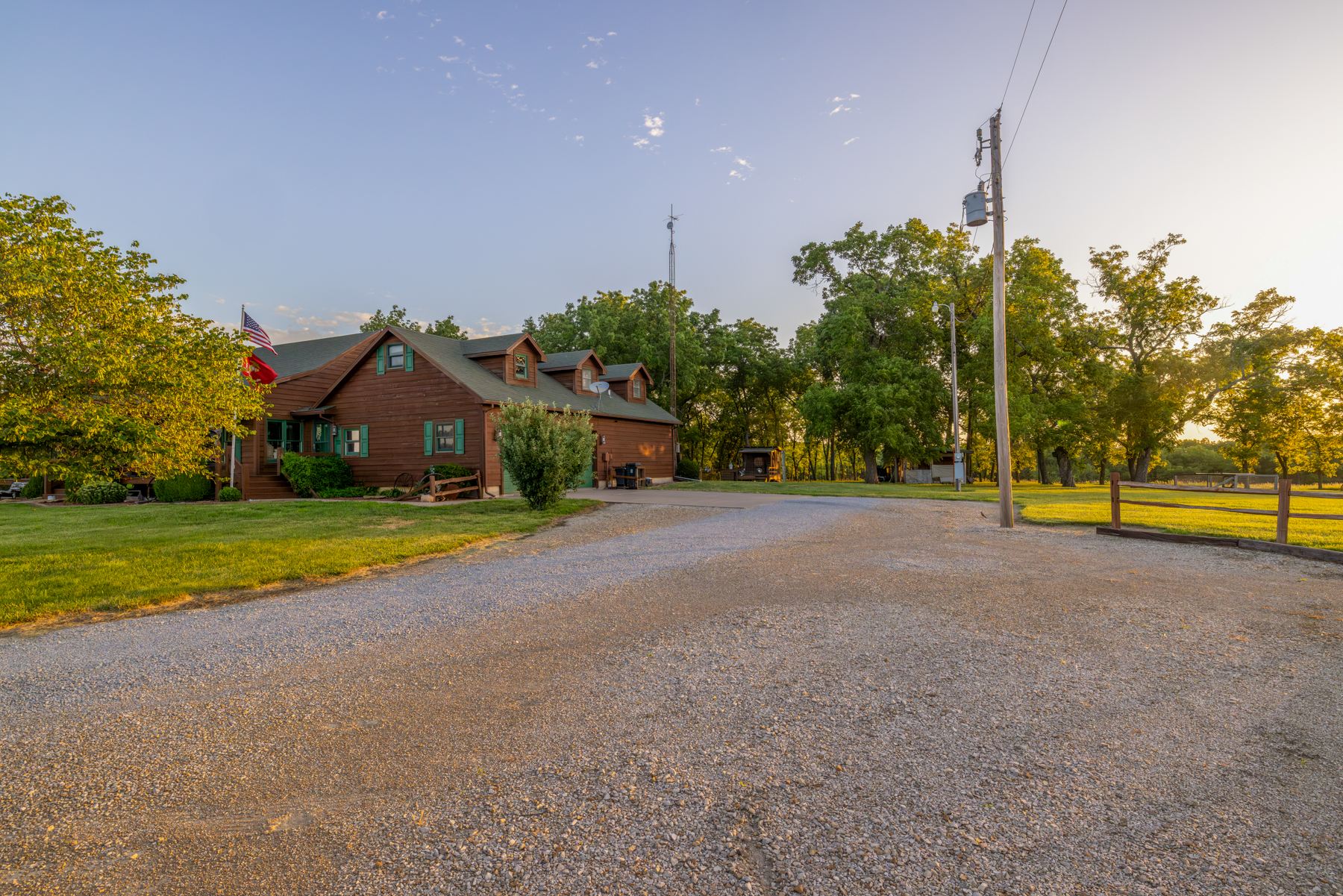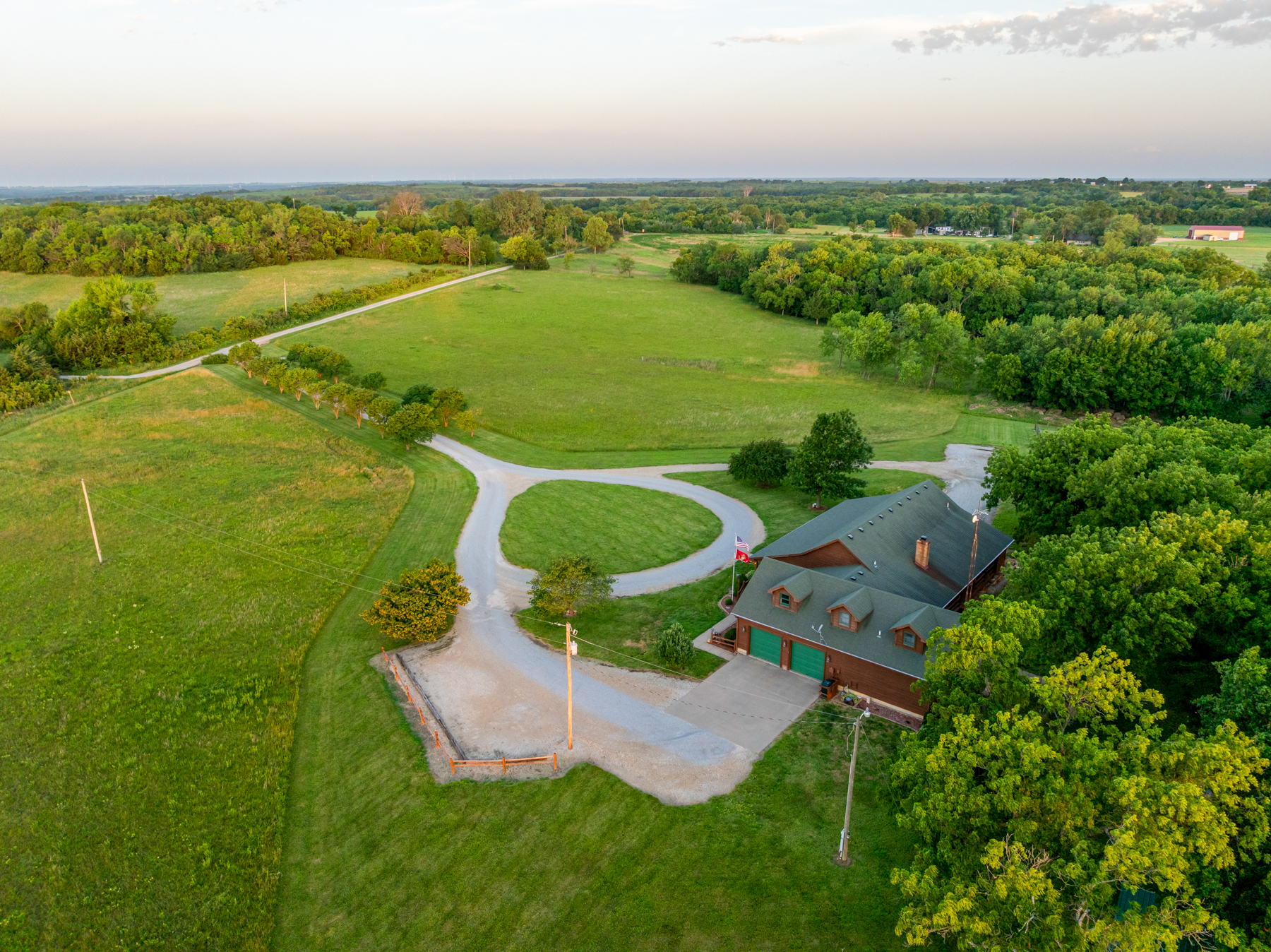 Pulling down the dead-end West 273rd Street, appreciate the residence placement as it is set far to the north off of the county roadway and wrapped with a slice of heaven on earth. The well-maintained driveway is lined with mature Redbud trees and lies out in an eased circle driveway in front of the residence, with a split off which leads to the east garage and west garage. One step on the front covered deck, and you may never want to leave, as the views are the icing on the cake. Inside, take note of the attention to detail throughout. The study holds custom-built bookshelves with incredible natural light. There is an office area to the west of the library. Continue on to the kitchen, which is complete with custom solid Oak cabinetry with built-in double oven, microwave cabinet, cook top, dishwasher, and refrigerator. The majority of all appliances have recently been replaced. The kitchen is open to the dining area and living room with a 1/2 bathroom and laundry room just off. There is a wood-burning built-in stove with a blower that provides not only ambience to a winter’s day, but endless supplemental heat. The double sliding doors lead you out onto the back covered deck area. The master bedroom boasts ideal space with his and her closets with built-ins and a double vanity. There is a walk door between the master bedroom and kitchen that leads out to the back covered deck. There are 2 additional bedrooms on the west side of the home with spacious closets with built-ins. The main full bathroom is located between the bedrooms. The upstairs staircase is located just off the kitchen and offers incredible space that could be used for 2 additional bedrooms, a play/rec room, or an office.