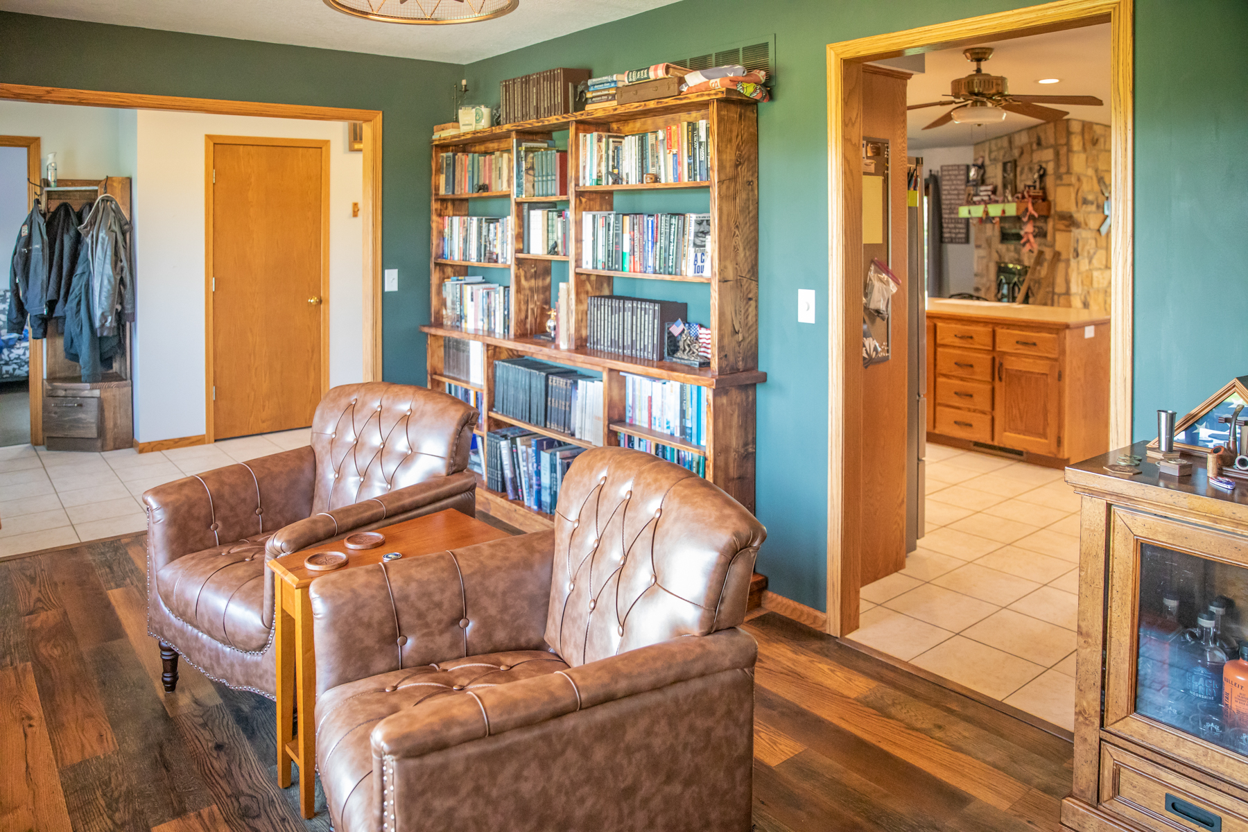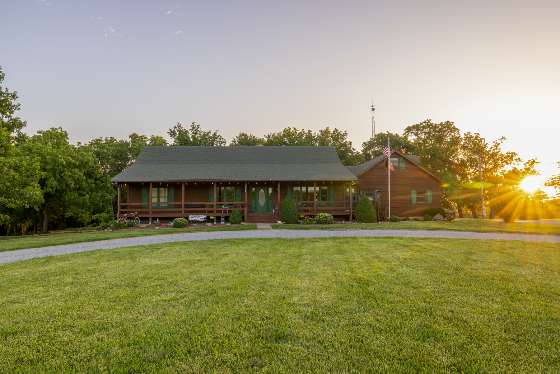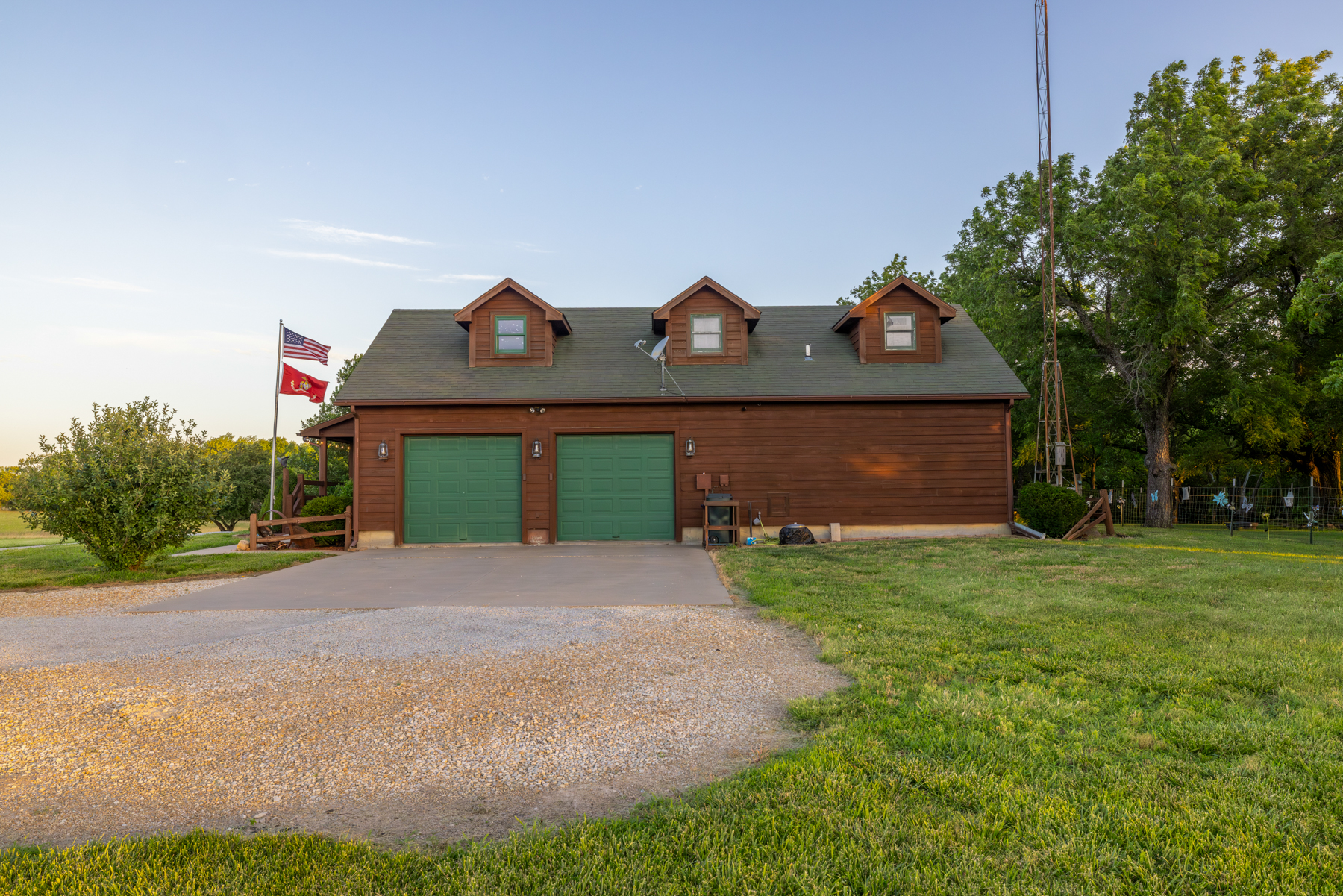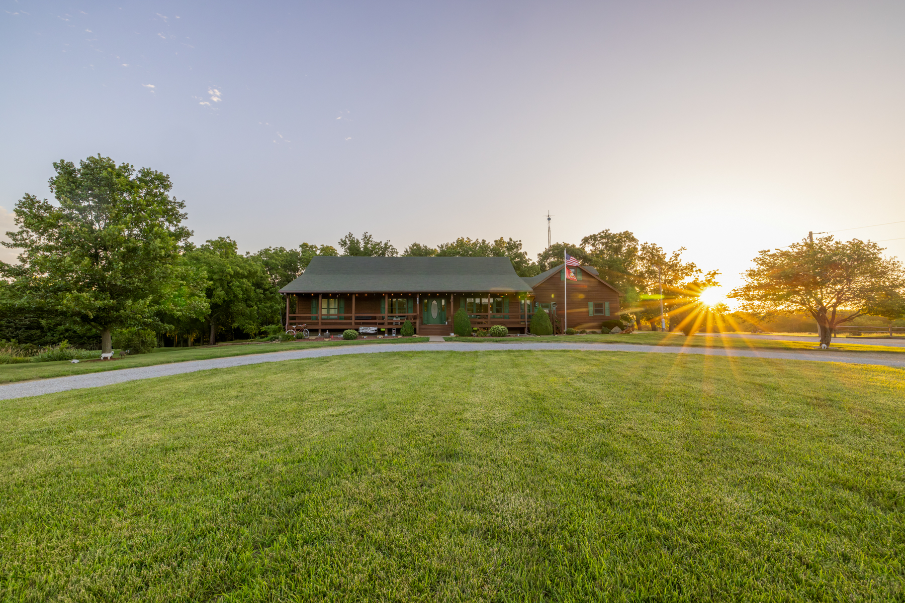 Pulling down the dead-end West 273rd Street, appreciate the residence placement as it is set far to the north off of the county roadway and wrapped with a slice of heaven on earth. The well-maintained driveway is lined with mature Redbud trees and lies out in an eased circle driveway in front of the residence, with a split off which leads to the east garage and west garage. One step on the front covered deck, and you may never want to leave, as the views are the icing on the cake. Inside, take note of the attention to detail throughout. The study holds custom-built bookshelves with incredible natural light. There is an office area to the west of the library. Continue on to the kitchen, which is complete with custom solid Oak cabinetry with built-in double oven, microwave cabinet, cook top, dishwasher, and refrigerator. The majority of all appliances have recently been replaced. The kitchen is open to the dining area and living room with a 1/2 bathroom and laundry room just off. There is a wood-burning built-in stove with a blower that provides not only ambience to a winter’s day, but endless supplemental heat. The double sliding doors lead you out onto the back covered deck area. The master bedroom boasts ideal space with his and her closets with built-ins and a double vanity. There is a walk door between the master bedroom and kitchen that leads out to the back covered deck. There are 2 additional bedrooms on the west side of the home with spacious closets with built-ins. The main full bathroom is located between the bedrooms. The upstairs staircase is located just off the kitchen and offers incredible space that could be used for 2 additional bedrooms, a play/rec room, or an office.