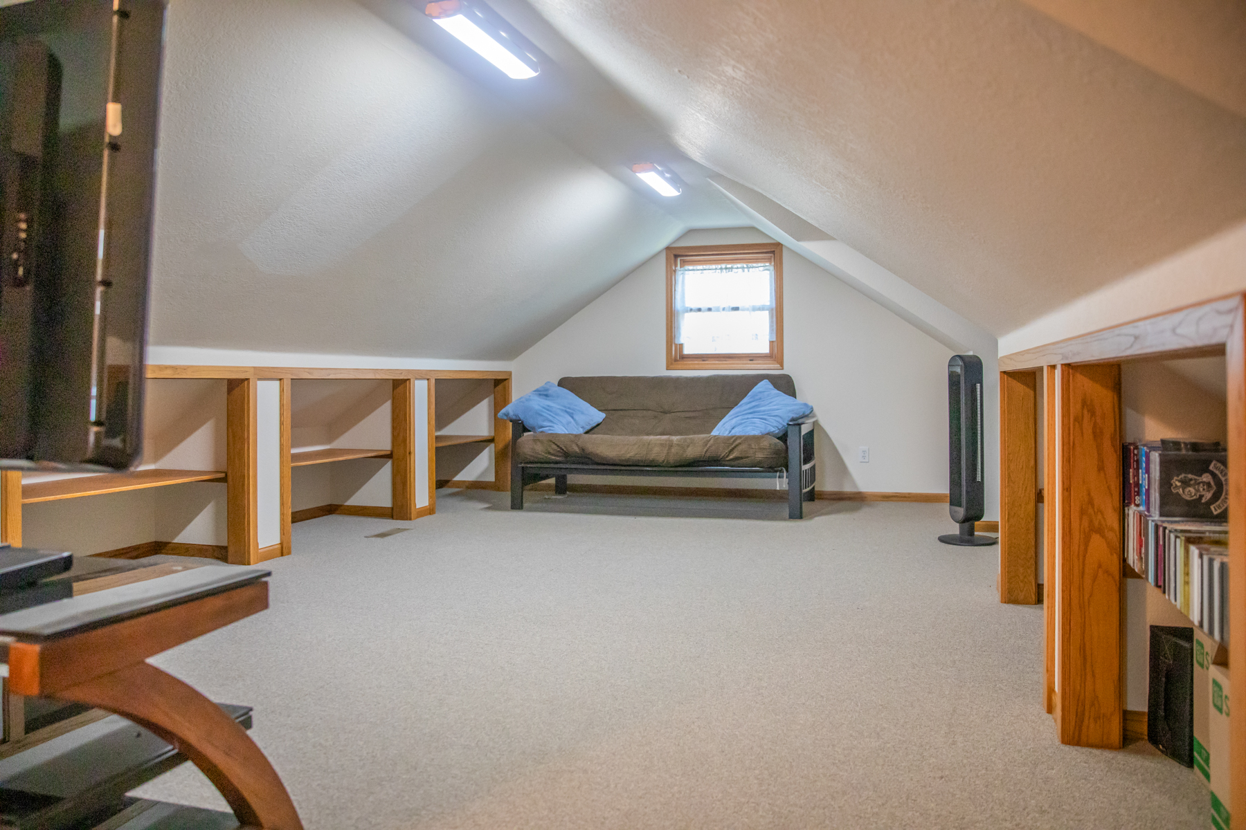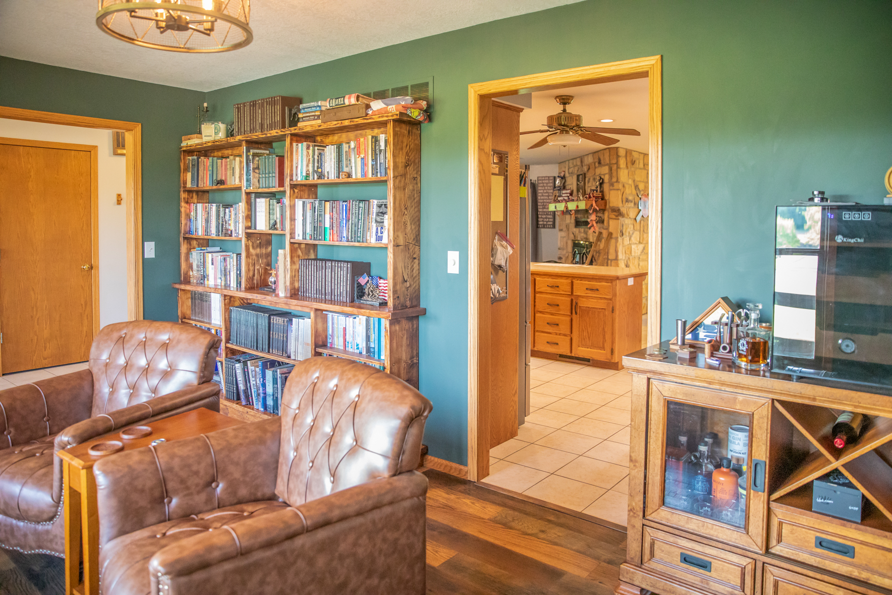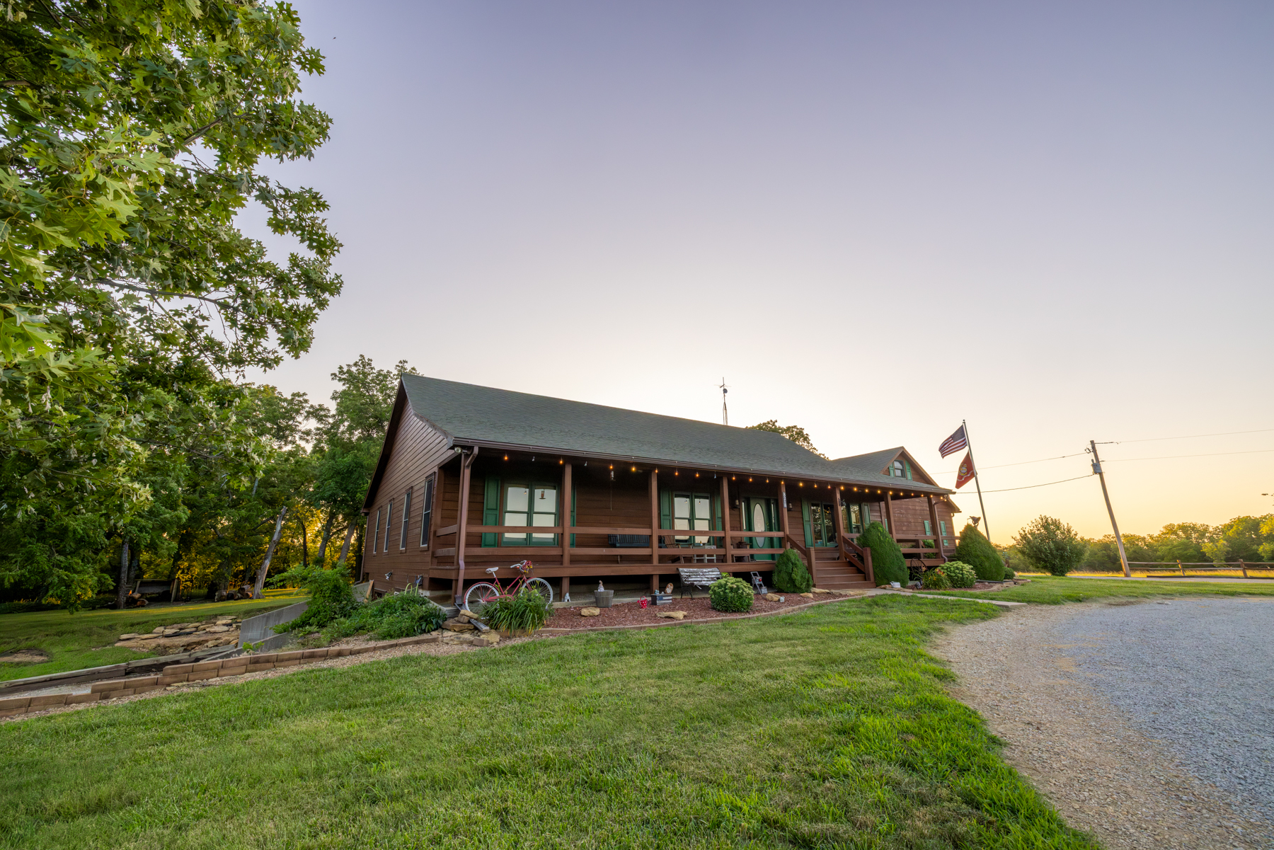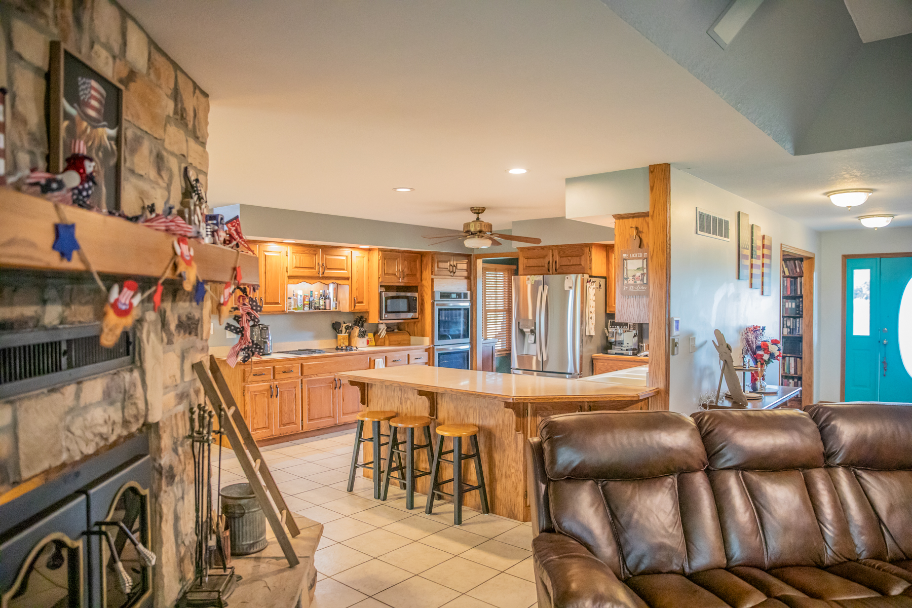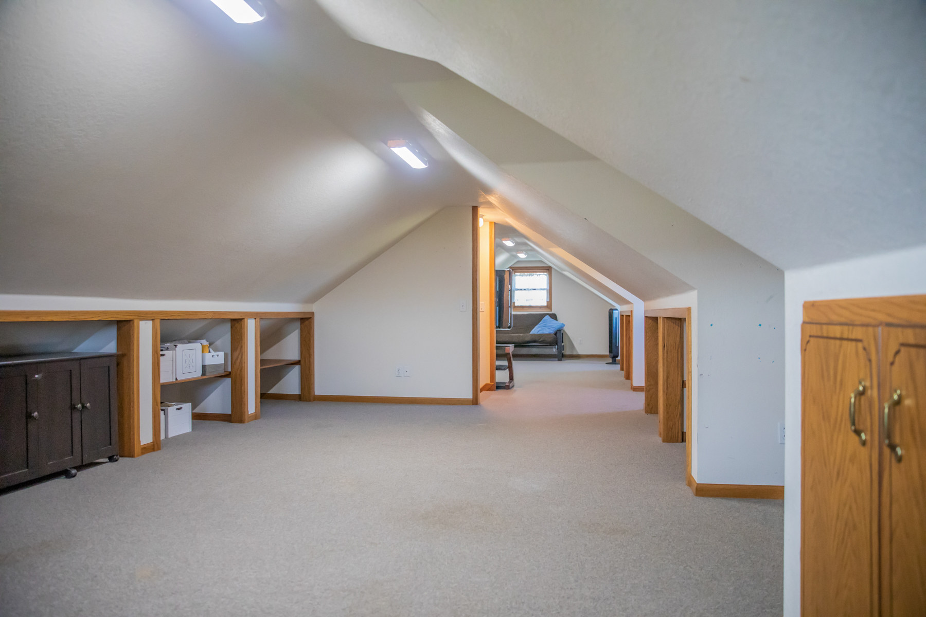 Pulling down the dead-end West 273rd Street, appreciate the residence placement as it is set far to the north off of the county roadway and wrapped with a slice of heaven on earth. The well-maintained driveway is lined with mature Redbud trees and lies out in an eased circle driveway in front of the residence, with a split off which leads to the east garage and west garage. One step on the front covered deck, and you may never want to leave, as the views are the icing on the cake. Inside, take note of the attention to detail throughout. The study holds custom-built bookshelves with incredible natural light. There is an office area to the west of the library. Continue on to the kitchen, which is complete with custom solid Oak cabinetry with built-in double oven, microwave cabinet, cook top, dishwasher, and refrigerator. The majority of all appliances have recently been replaced. The kitchen is open to the dining area and living room with a 1/2 bathroom and laundry room just off. There is a wood-burning built-in stove with a blower that provides not only ambience to a winter’s day, but endless supplemental heat. The double sliding doors lead you out onto the back covered deck area. The master bedroom boasts ideal space with his and her closets with built-ins and a double vanity. There is a walk door between the master bedroom and kitchen that leads out to the back covered deck. There are 2 additional bedrooms on the west side of the home with spacious closets with built-ins. The main full bathroom is located between the bedrooms. The upstairs staircase is located just off the kitchen and offers incredible space that could be used for 2 additional bedrooms, a play/rec room, or an office.