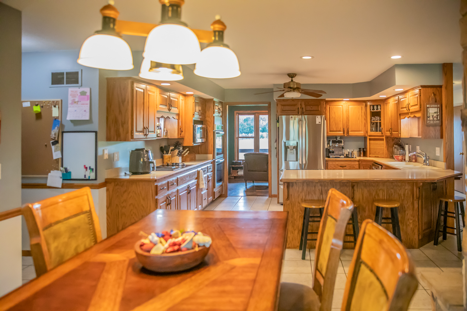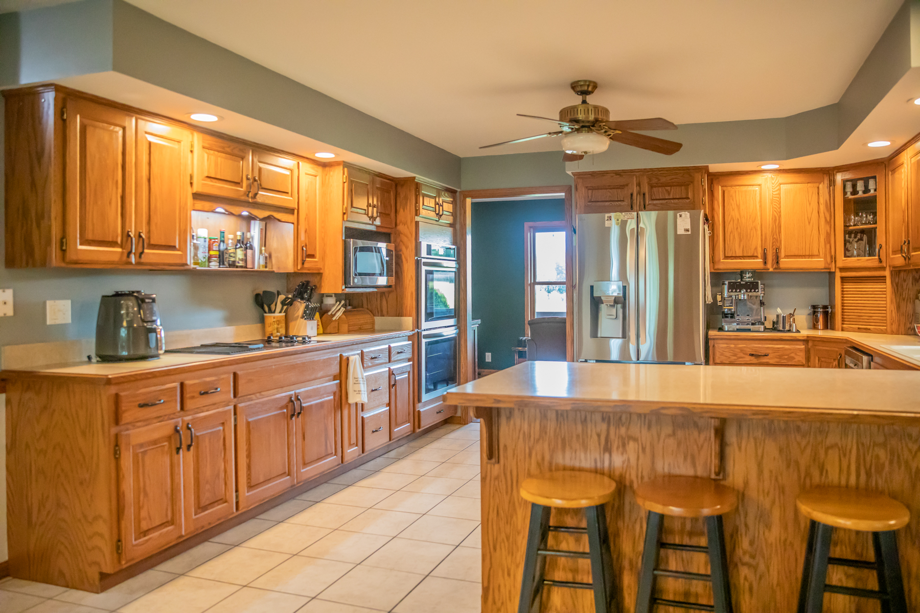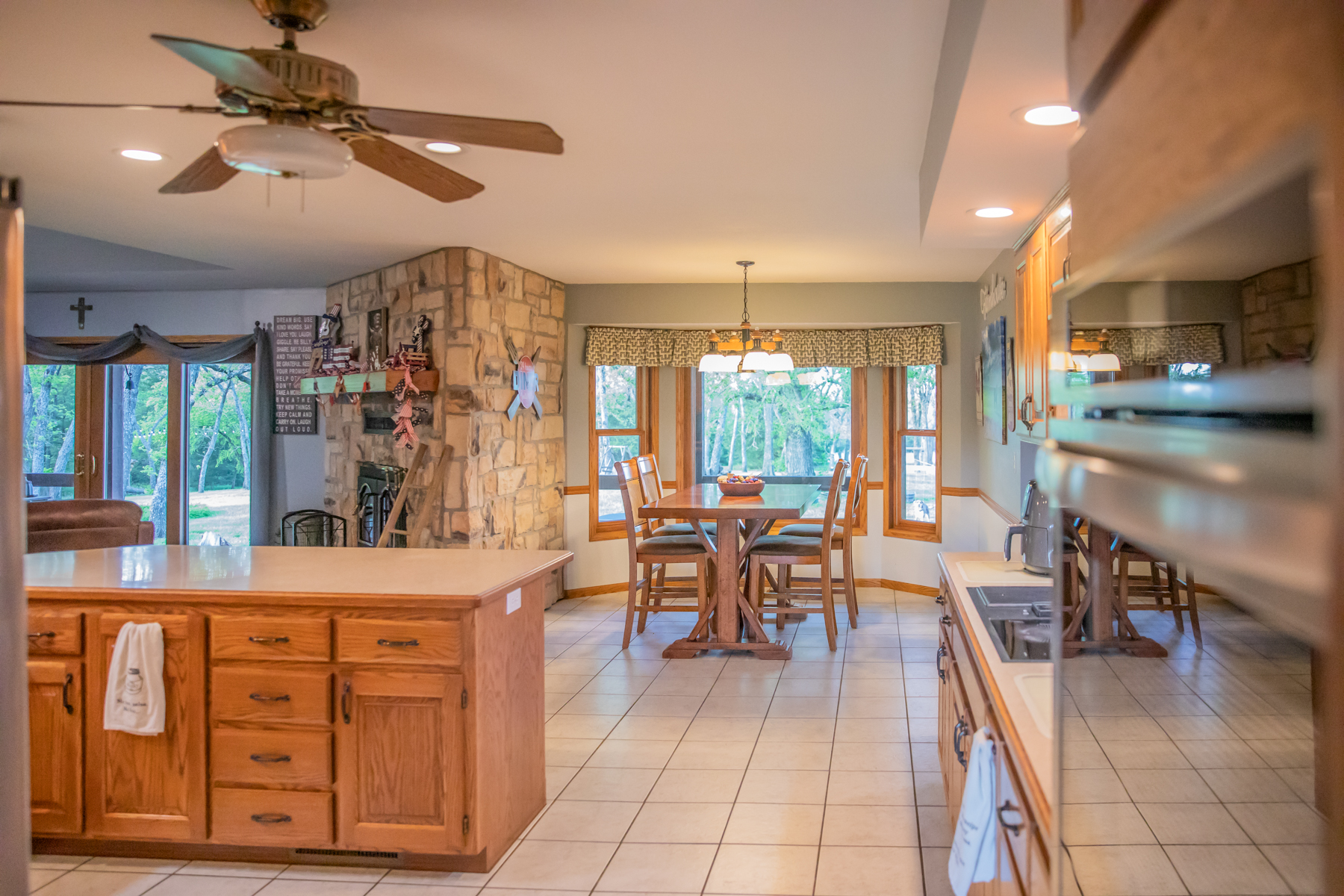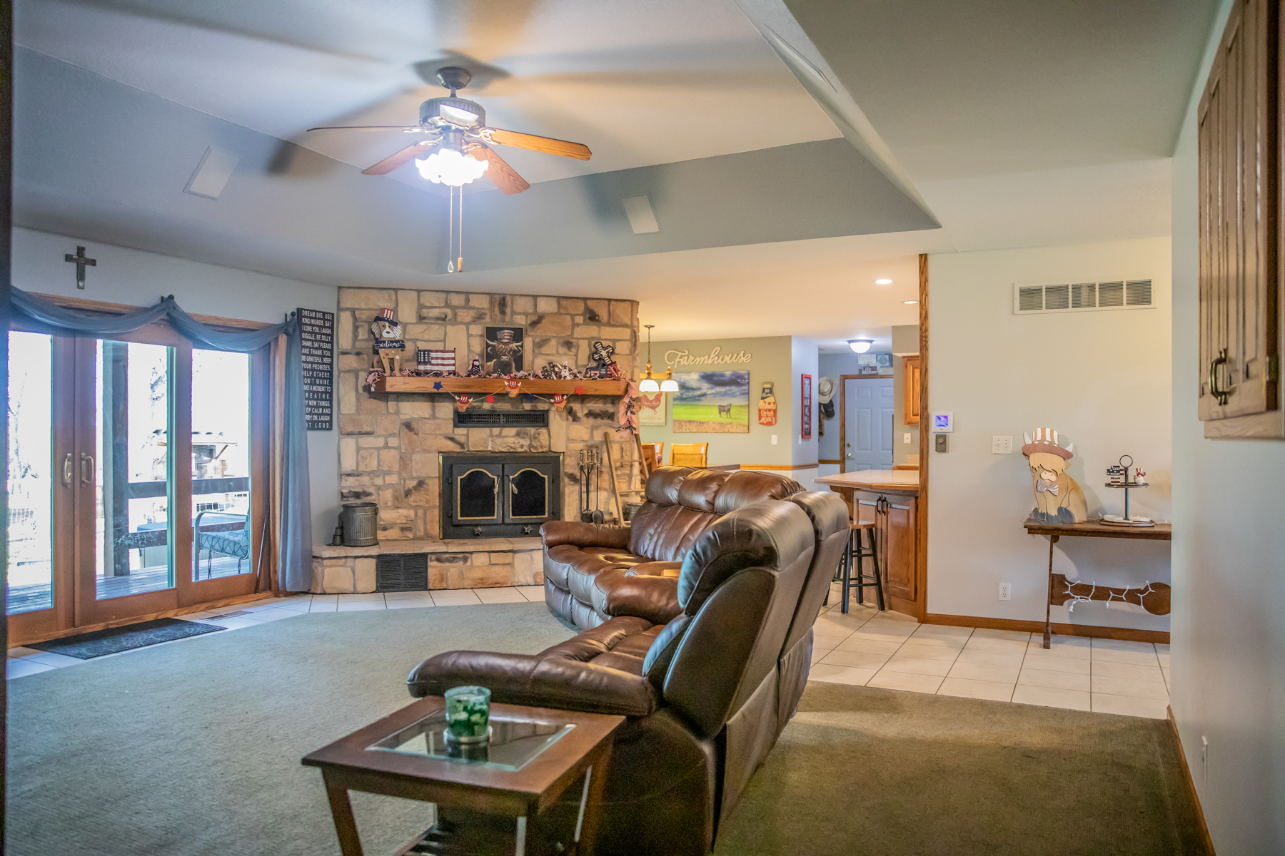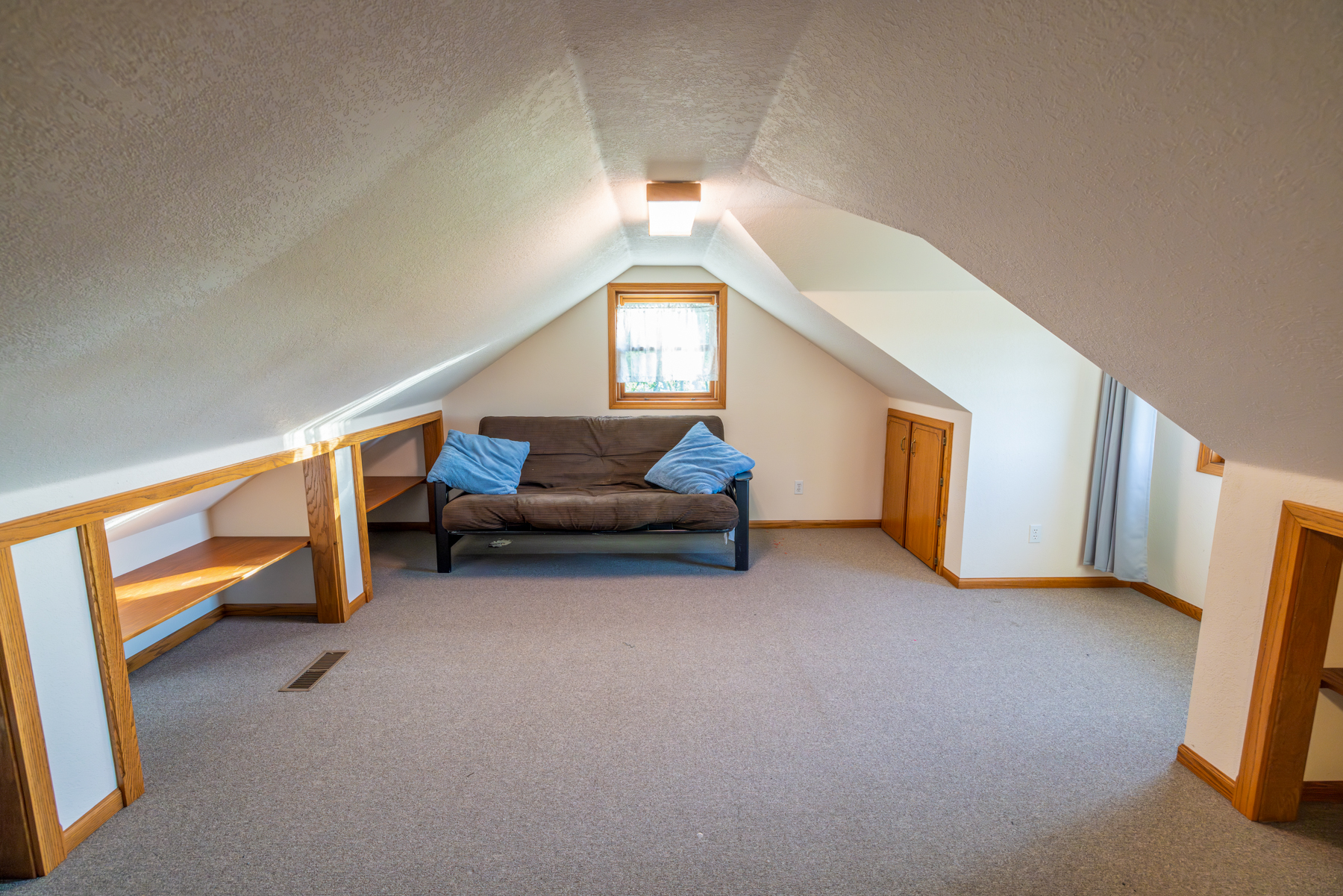 Pulling down the dead-end West 273rd Street, appreciate the residence placement as it is set far to the north off of the county roadway and wrapped with a slice of heaven on earth. The well-maintained driveway is lined with mature Redbud trees and lies out in an eased circle driveway in front of the residence, with a split off which leads to the east garage and west garage. One step on the front covered deck, and you may never want to leave, as the views are the icing on the cake. Inside, take note of the attention to detail throughout. The study holds custom-built bookshelves with incredible natural light. There is an office area to the west of the library. Continue on to the kitchen, which is complete with custom solid Oak cabinetry with built-in double oven, microwave cabinet, cook top, dishwasher, and refrigerator. The majority of all appliances have recently been replaced. The kitchen is open to the dining area and living room with a 1/2 bathroom and laundry room just off. There is a wood-burning built-in stove with a blower that provides not only ambience to a winter’s day, but endless supplemental heat. The double sliding doors lead you out onto the back covered deck area. The master bedroom boasts ideal space with his and her closets with built-ins and a double vanity. There is a walk door between the master bedroom and kitchen that leads out to the back covered deck. There are 2 additional bedrooms on the west side of the home with spacious closets with built-ins. The main full bathroom is located between the bedrooms. The upstairs staircase is located just off the kitchen and offers incredible space that could be used for 2 additional bedrooms, a play/rec room, or an office.