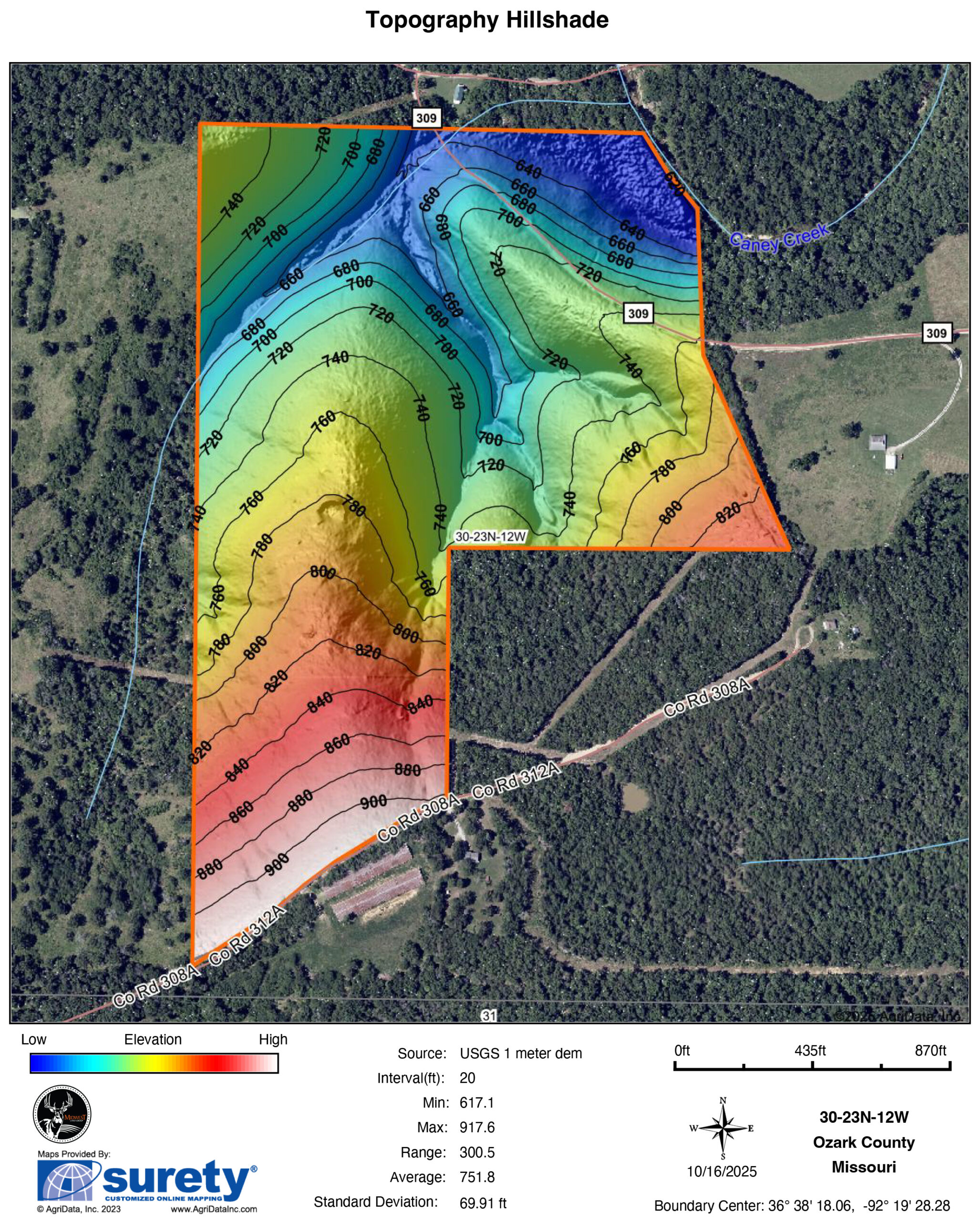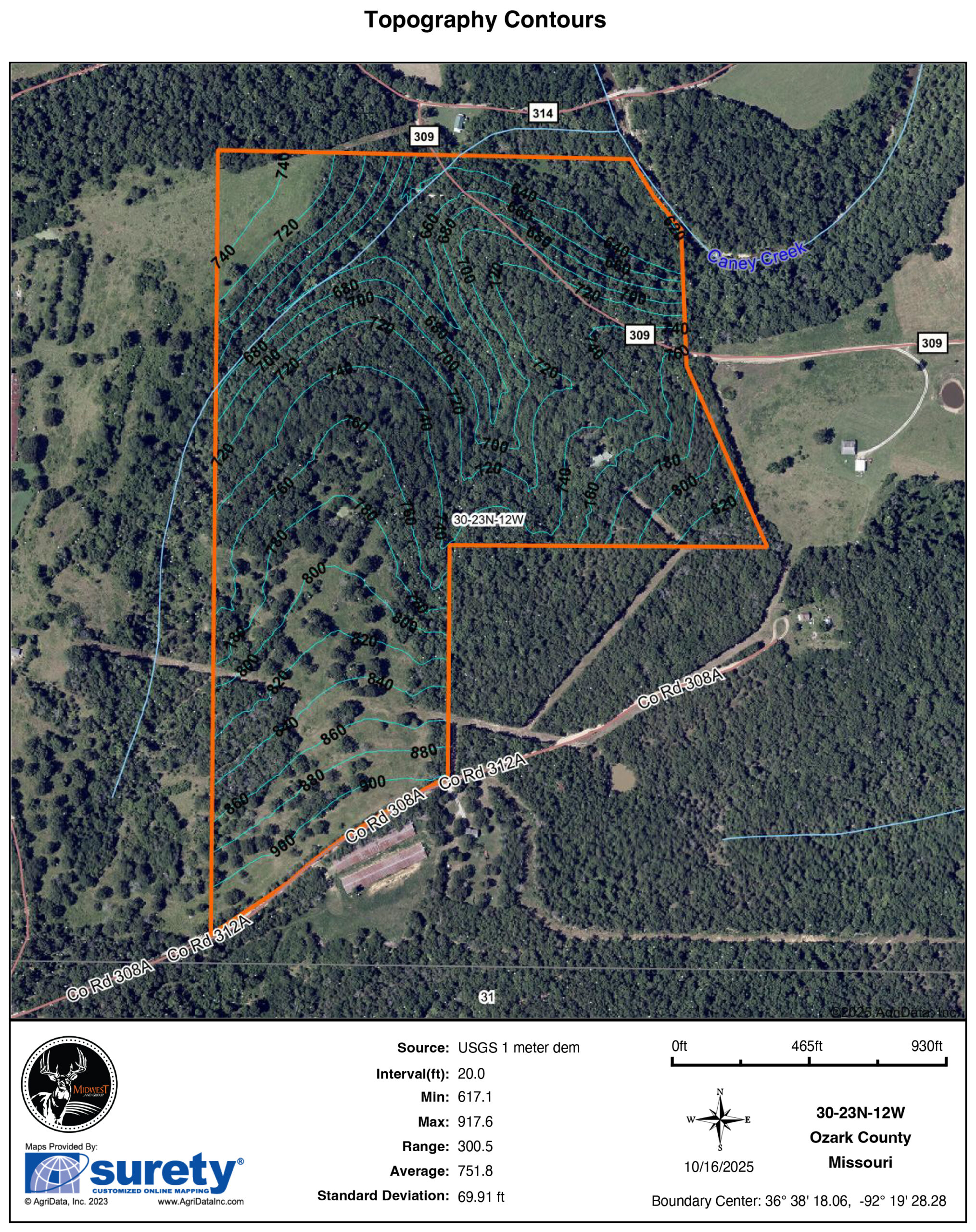 The 69 +/- acres are comprised of about 54 acres of hardwood timber draws and ridges, and about 14 acres of ridgetop pasture. The pastures allow for some incredible potential food plot locations, and the timbered acreage has some great white oak timber on it. The property has a great trail system, allowing you to traverse through most of the property with a truck or UTV. There is a beautiful spring-fed creek below the cabin, and there is one wildlife pond in the center of the property. Additionally, the property has an incredible 160-degree view up on the south pasture, and nearly 400’ of Caney Creek frontage. If you’ve been searching for a turn-key hunting camp and want to experience the joy that this property has brought the current owners for many years, this is the property for you. Contact listing agent, Clay O’Dell, at (417) 414-1808 to schedule a showing today.