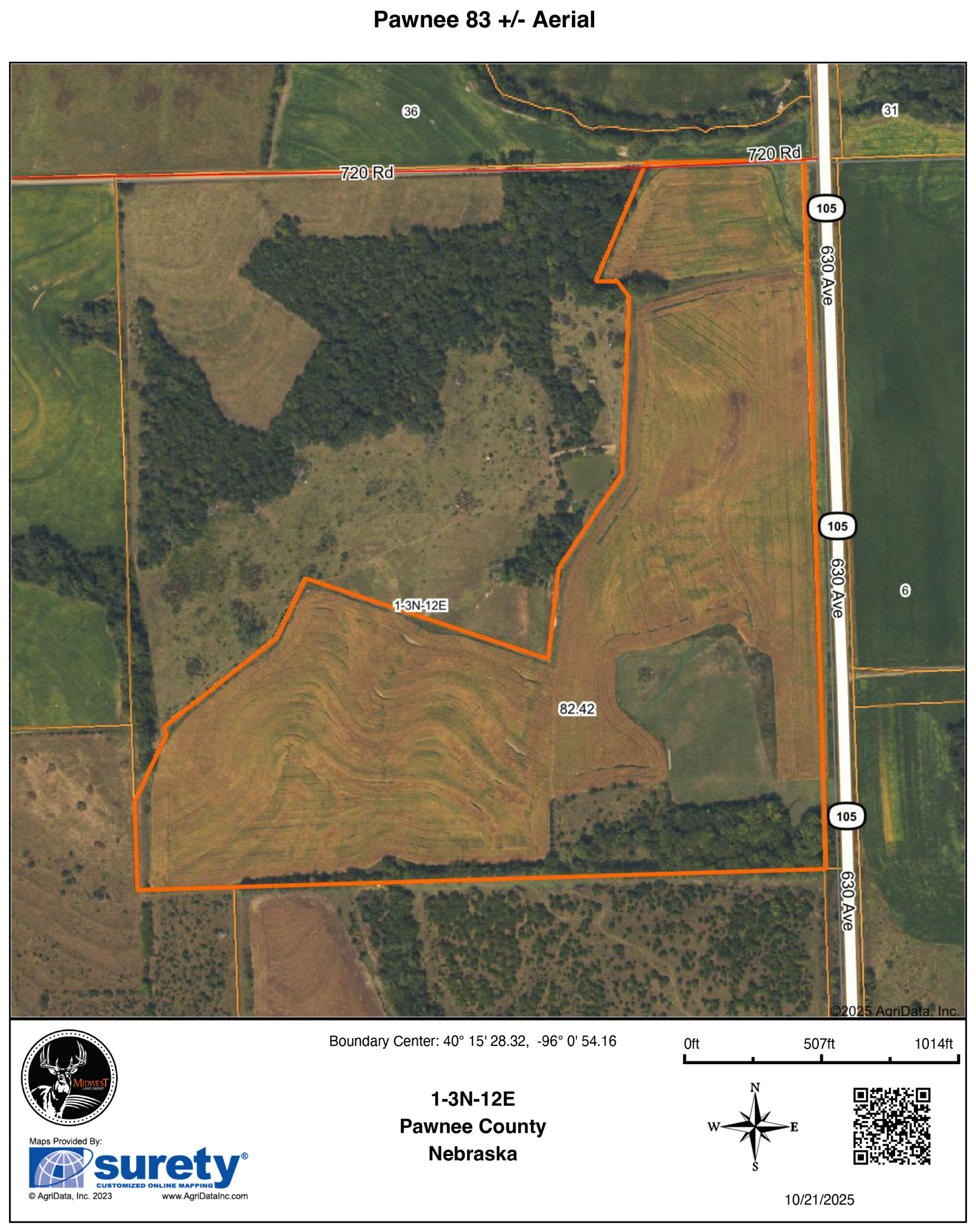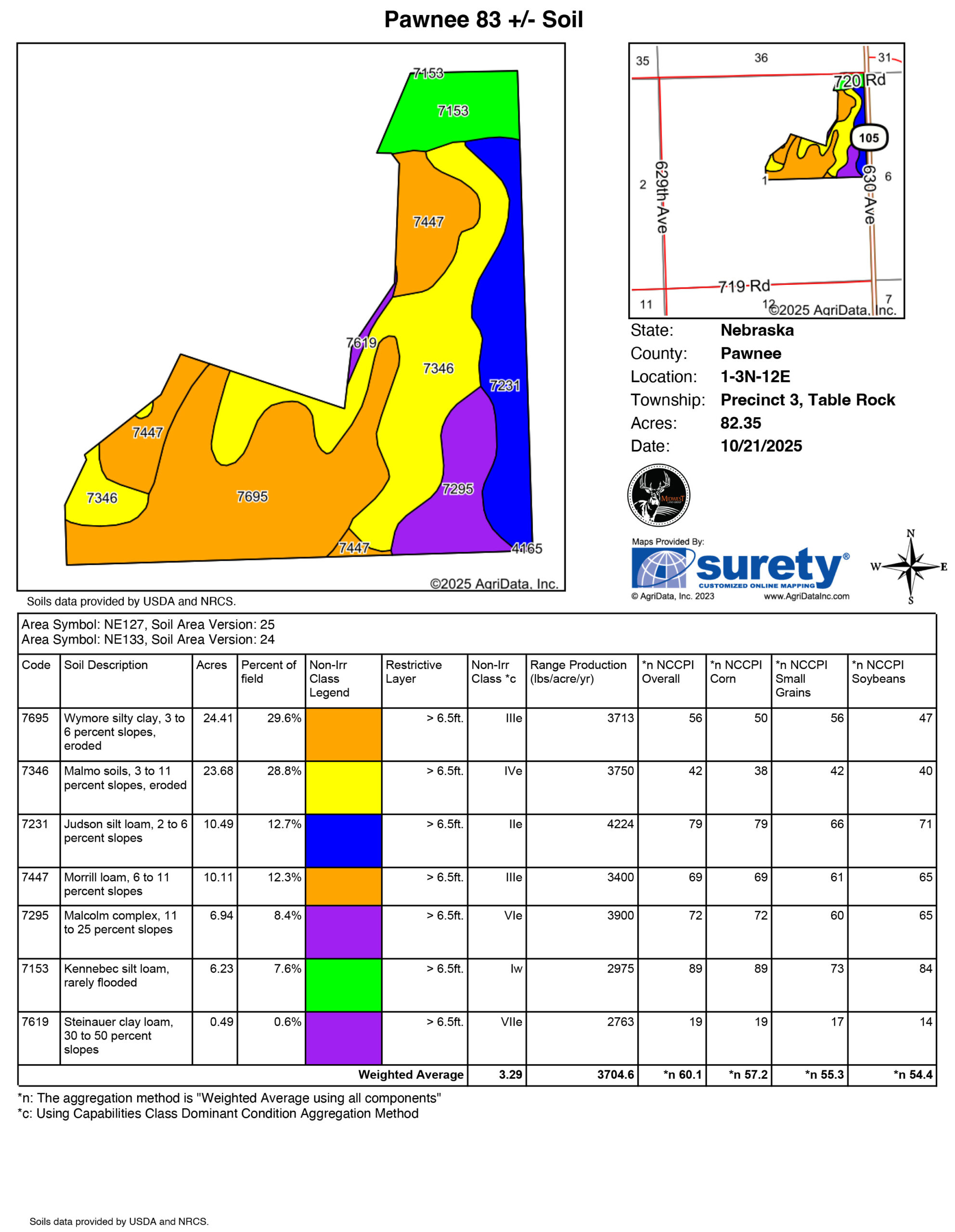 Located on the border of Pawnee and Richardson Counties is this 83 +/- tillable tract. Not only is the property in a highly desirable area, but it also has Highway 105 frontage. 65 acres are currently in production, with the ability to increase that number in the next growing season.
