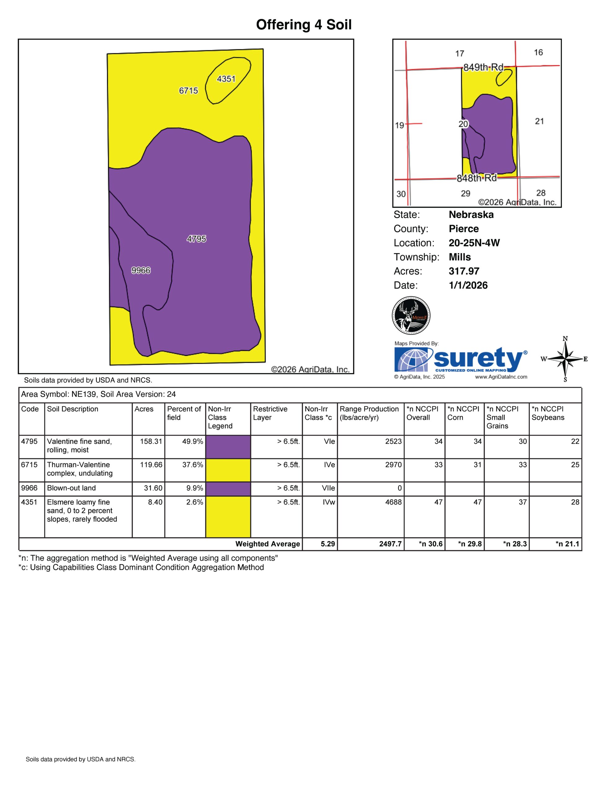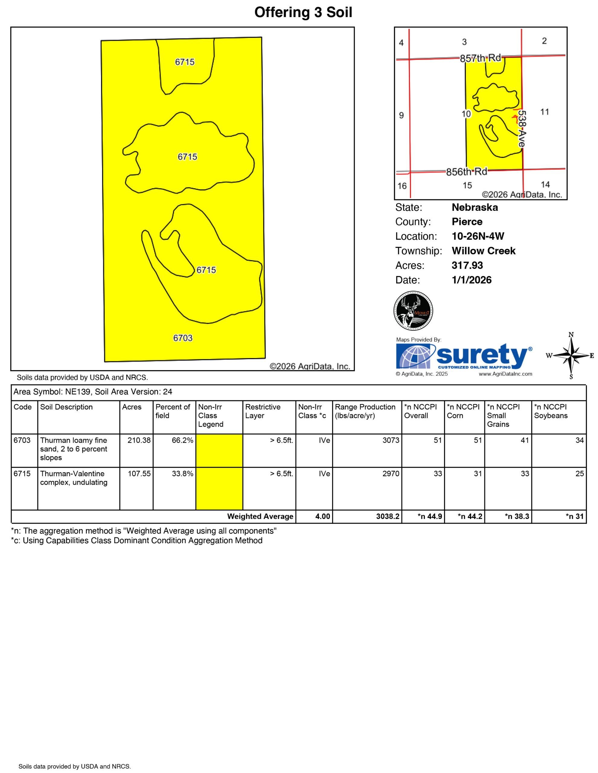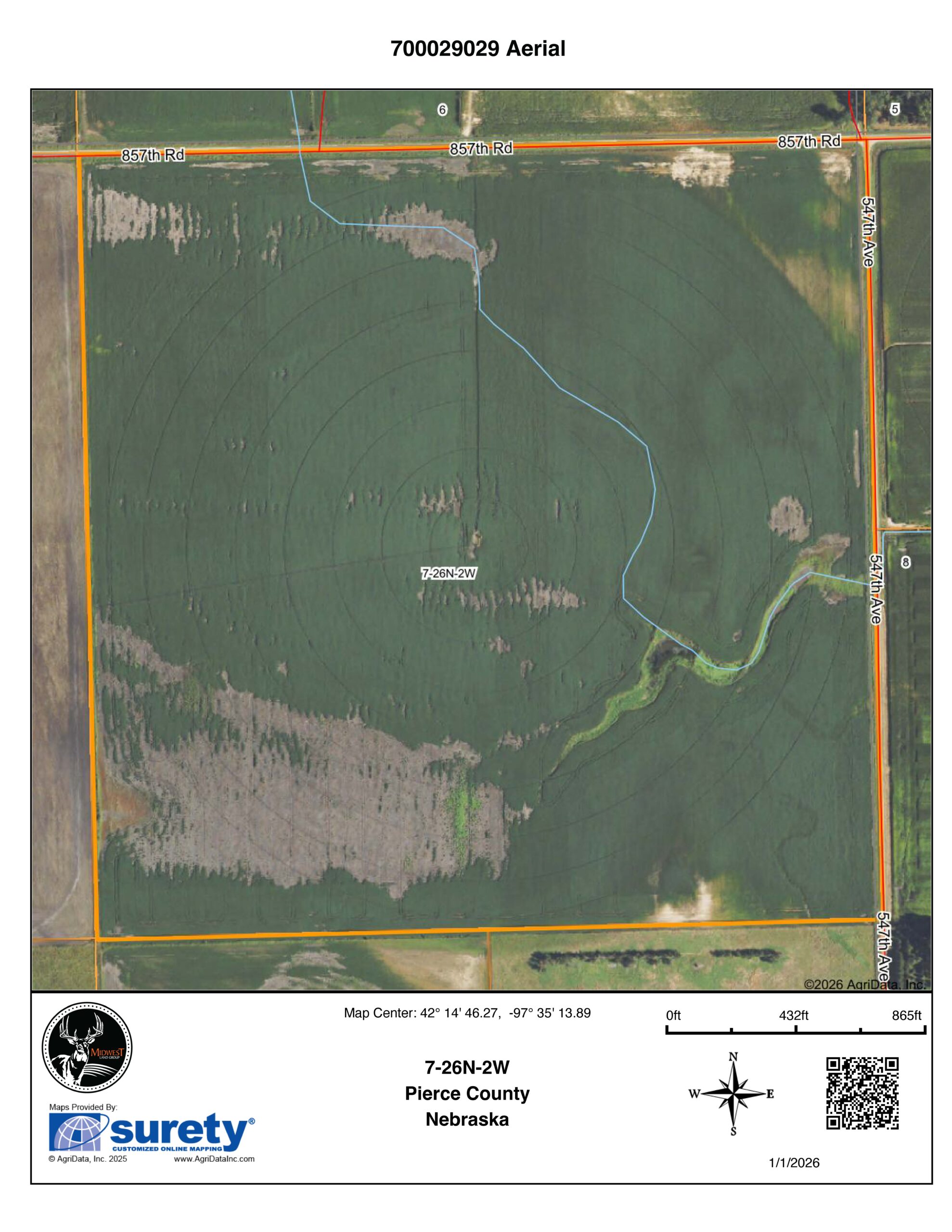 This Pierce County, Nebraska offering contains two quarter sections spanning 320 +/- acres. The land consists primarily of sandy loam soil with an NCCPI average of 44. Each tract has its own irrigation pivot ensuring dependable water coverage. The north tract features a 2025 Valley Center pivot. The wells are pumping 1,250 GPM with depths of 240’ and 140’. There is also a Quonset with a cement floor on the property. The pivot power unit is currently owned by the tenant.
