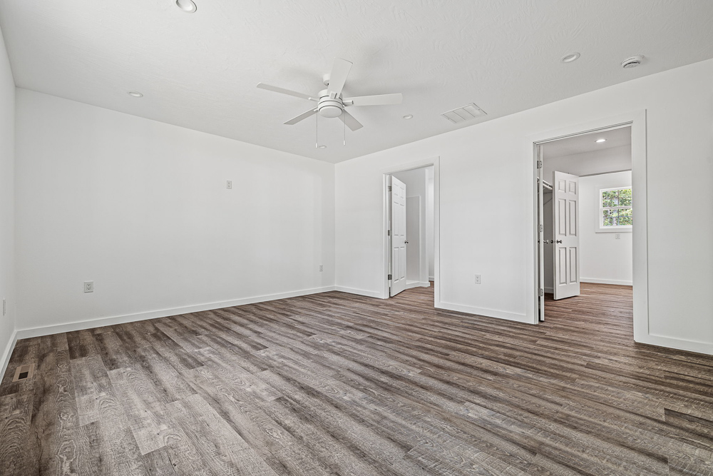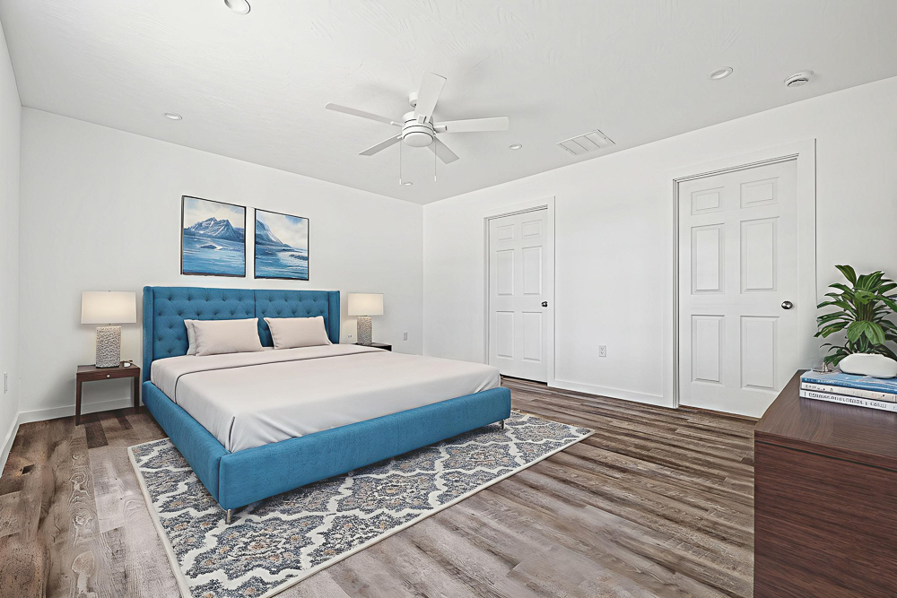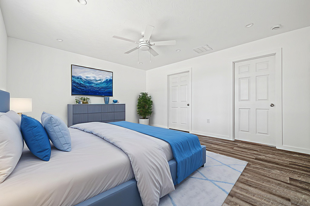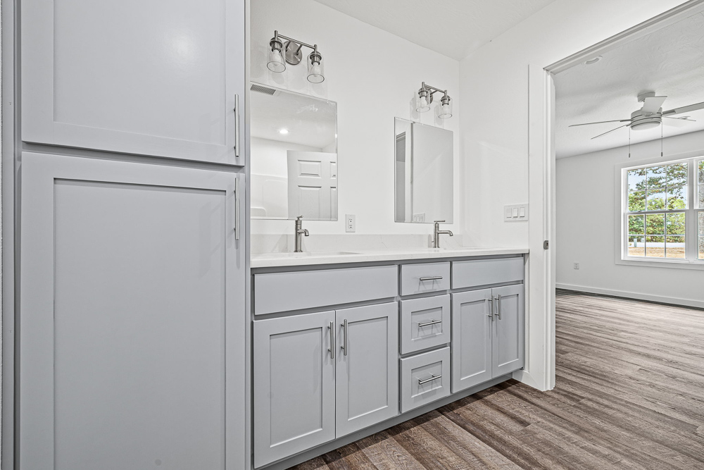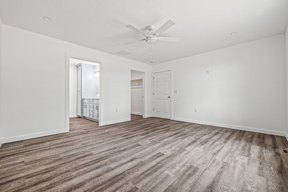 The split floor plan places the master suite on its own side of the home, complete with dual sinks, matching cabinetry and countertops, and a walk-through closet that connects directly to the laundry room for ultimate convenience.