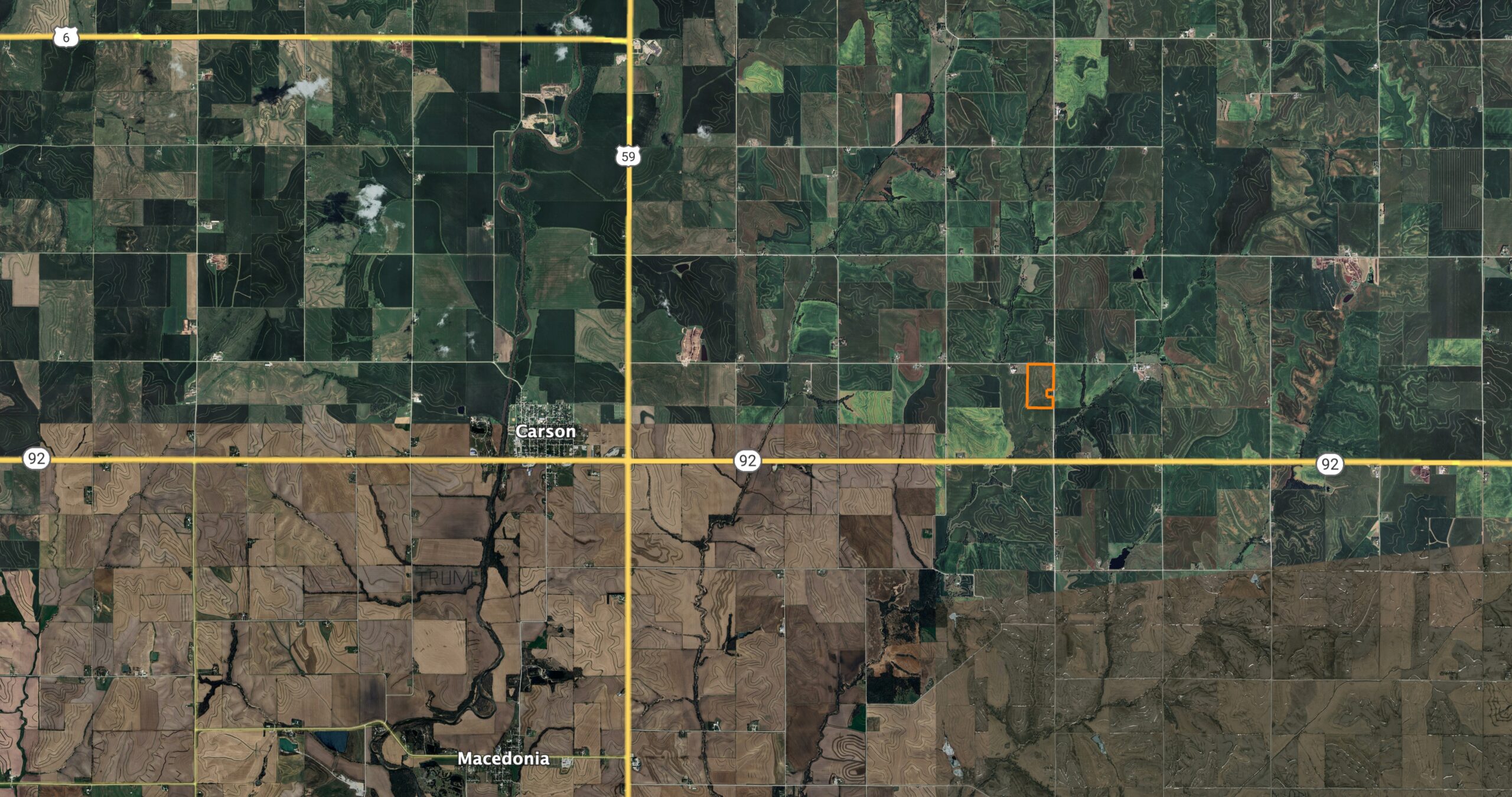 Located just 5 miles east of Carson and 10 miles west of Griswold, this 60 +/- acre Pottawattamie County farm offers a strong mix of productivity and accessibility. With an impressive CSR2 of 71.6, this tract provides consistent yields and dependable income in a highly regarded farming area of southwest Iowa.The property is primarily tillable, featuring a gentle slope and established terraces, and is currently in a corn and soybean rotation. Access is convenient via a well-maintained gravel road, just a half mile north of Highway 92, making transportation and logistics efficient for both operators and investors. Electric service is available at the road, providing potential for future improvements or farm expansion.