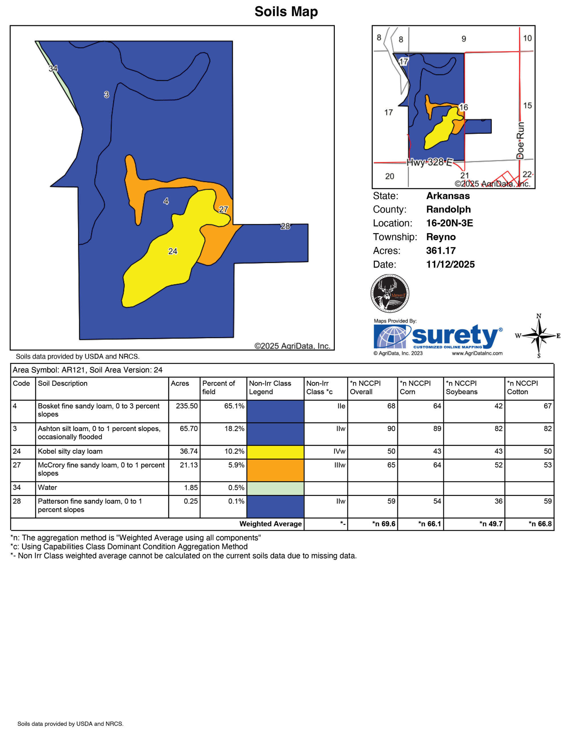 Located just north of Reyno, this 365 +/- acre farm offers the ideal mix of highly productive cropland, timber, and river frontage. The property features 279.25 FSA tillable acres and 85 acres of timber, giving you plenty of room for both farming and outdoor recreation. With Highway 328 frontage on the south side and county road access along the east, getting in and out with equipment is easy and convenient.The farm is precision leveled and irrigated by five wells, two of which are electric, providing consistent water and efficient field management. It has a strong history of rice and soybean production, and the excellent drainage, paired with wide turn row,s makes it easy to work from one end to the other. Everything here is set up for smooth, productive operations from day one.