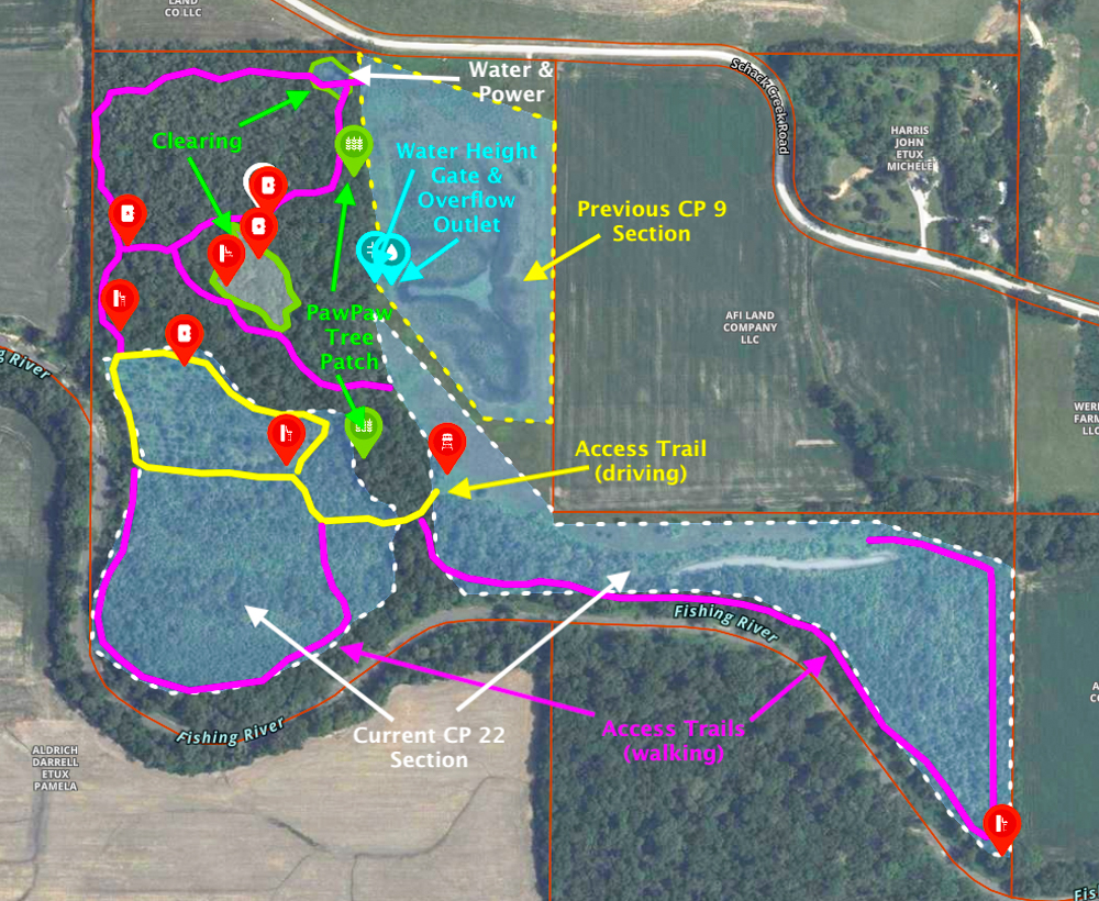 What makes this farm special can be seen from the aerial map. There is a production row crop that borders this farm on the east, south, and west sides of it. This property provides the largest block of habitat and cover in the area, and is literally teeming with wildlife. The deer tails, rubs, and scrapes are everywhere, and are clear signs of high population density. For the waterfowlers out there, this farm offers yet another outstanding opportunity. There were 10 acres of the farm enrolled in the CP-9 Shallow Water Marsh Program. That contract did expire in 2023; however, the water height gate and overflow control outlet are still functional and available to flood this area and enhance the waterfowl habitat. There are another 30 acres that are currently enrolled in the CP-22 Riparian Buffer Program. The tree plantings (mostly oaks) create a buffer of trees and shrubs to filter runoff, prevent sediment from entering water bodies, and provide wildlife corridors. This contract is in place until 2032 and produces $6,027 in annual income. There are several areas that would make excellent locations for food plots to increase the attraction and utilization of the farm.