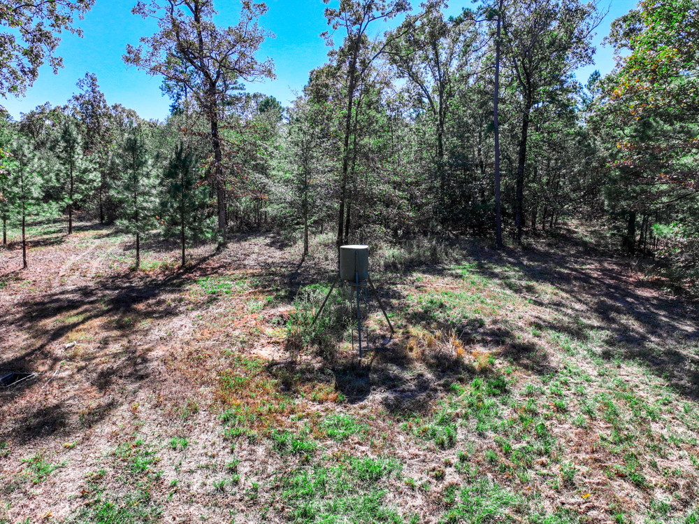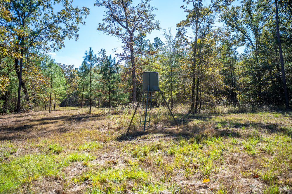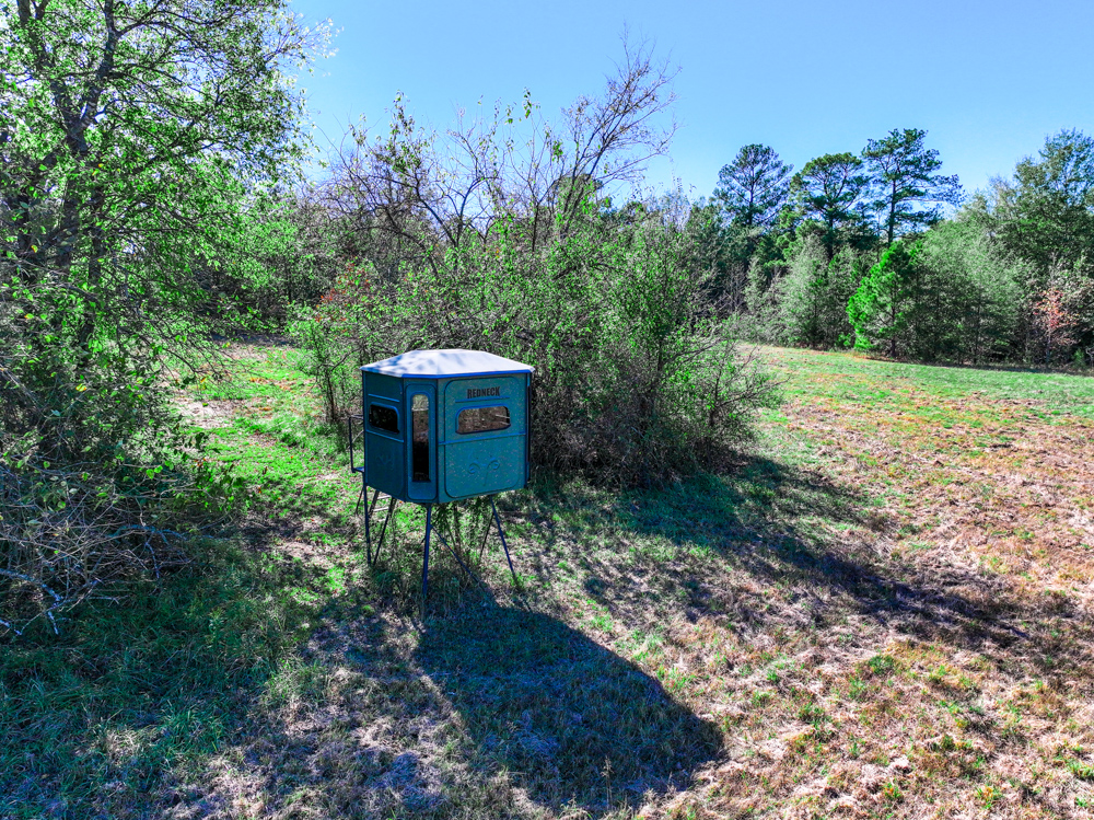 For the avid outdoorsman, the property comes equipped with three deer feeders, a Redneck hunting blind, and a storage trailer for equipment and supplies. A stocked pond provides an additional touch of relaxation and recreation. With its blend of open space and timber, this property offers multiple stand sites, diverse wildlife cover, and endless potential for creating food plots or trails.