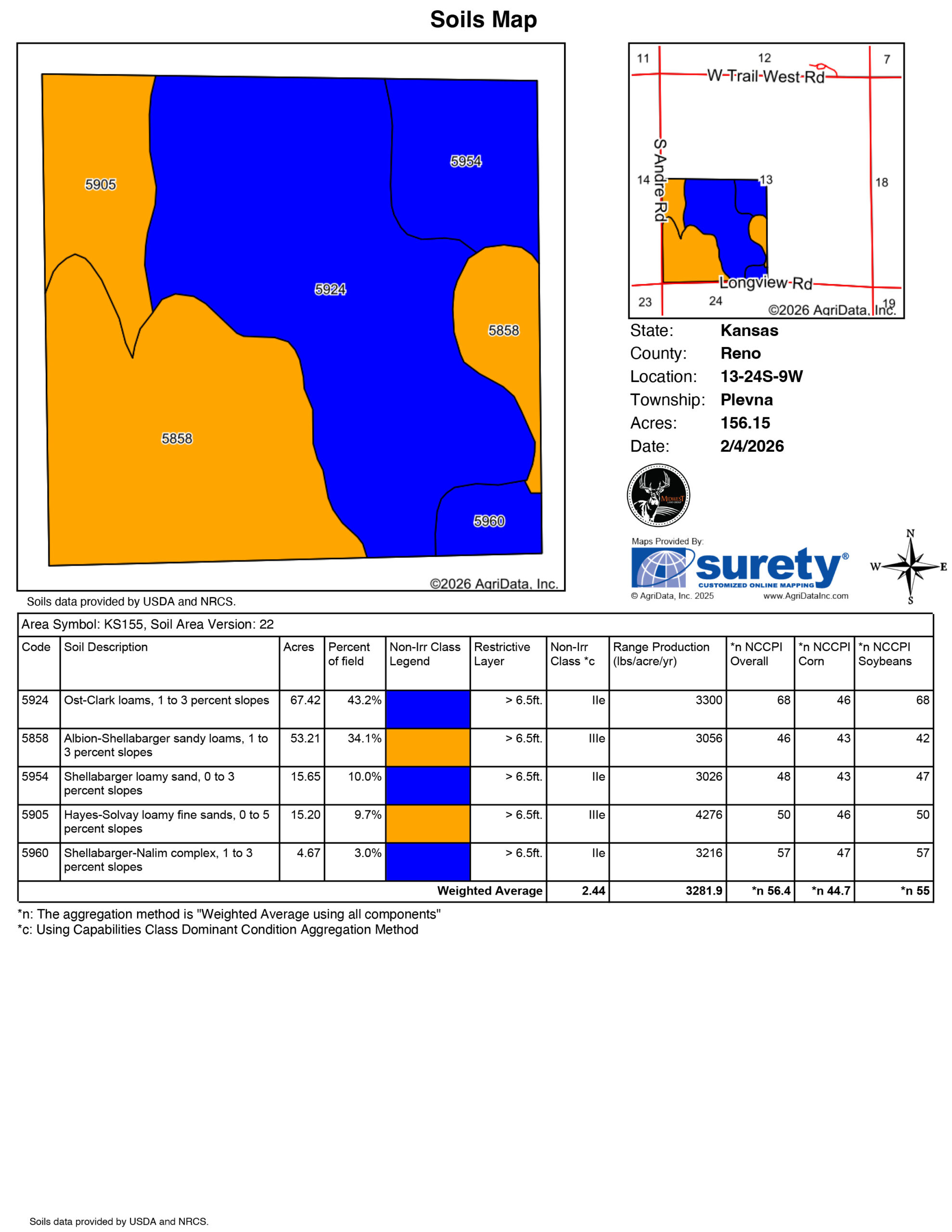 Just south of 50 Highway near Plevna is 156 +/- acres of fertile cropland. Finding a tract like this that lays nicely and has zero waste acres is hard to come by. The farm has a history of growing excellent yields of corn, wheat, and milo in rotation. Currently planted to wheat, the new owner will take full possession following the harvest of the 2026 wheat crop in early summer. Characterized by sandy loams with 0-3% slopes, this field is easy to work. The soil’s productivity is rated as above average for the region. Straight runs for larger equipment decrease the waste of expensive inputs. This farm enables the operator to plant with precision, make quick work of cultivation, and be efficient with precious time during harvest. Just a half mile in two directions from blacktop roads means getting to and from this farm quicker. Making the trip over to plant or to check a herd grazing a winter pasture more convenient.Electricity is available along Longview Road, you could have a meter dropped to run an electric fence, run a water well, or supply energy to a new homestead/farm headquarters. There is no flood plain on the property or zoning restrictions in this area of Reno County. Situated between heavily timbered areas to the north and Ninnescah River pastures to the south, this tract can be a stopping point for feeding wildlife such as turkeys, deer and pheasants. The farm is 10 miles from Fairfield Elementary, Middle, and High School. Being very close to Highway 50, it is a short commute into Hutchinson, a micropolitan city with all the modern conveniences.