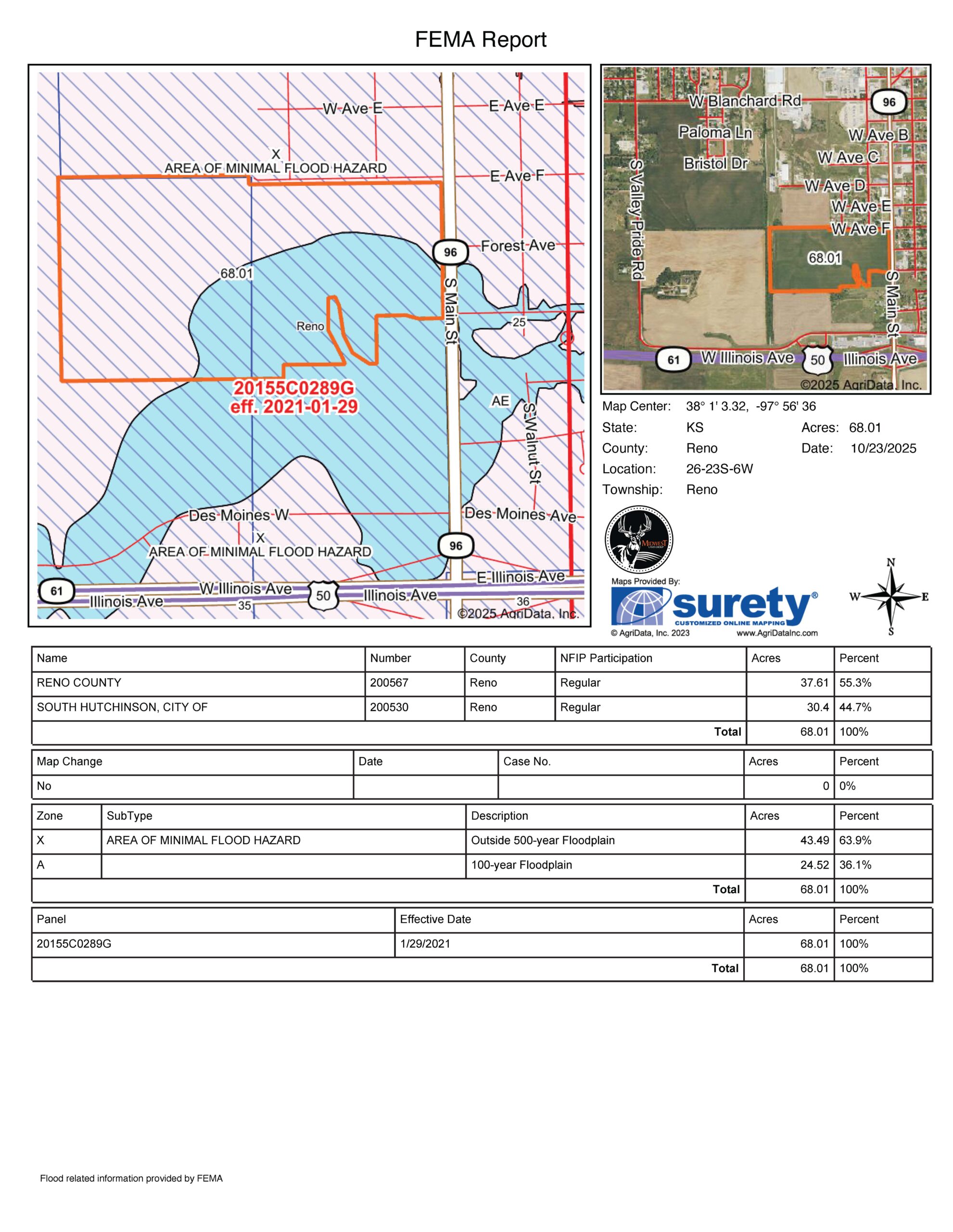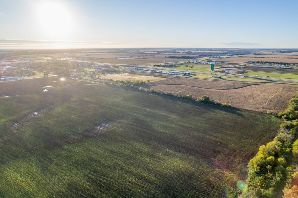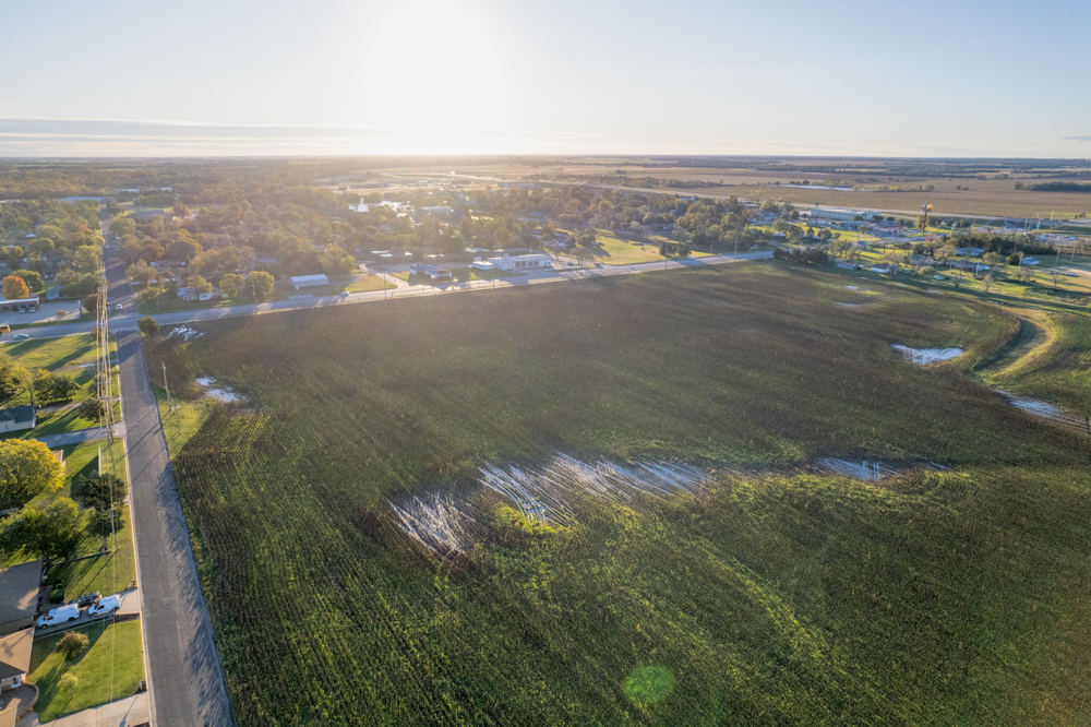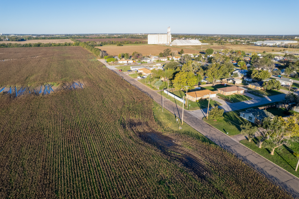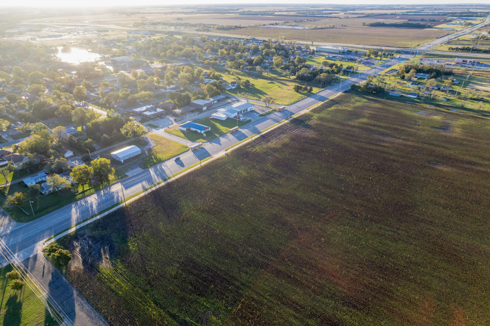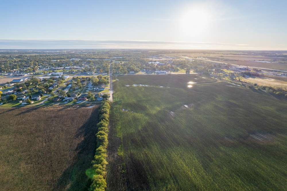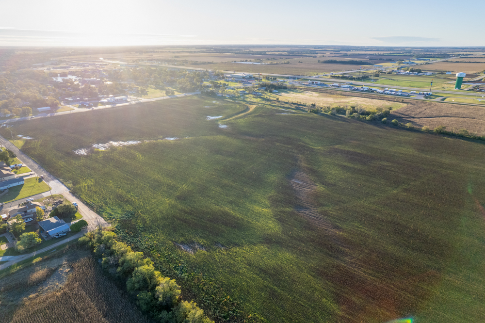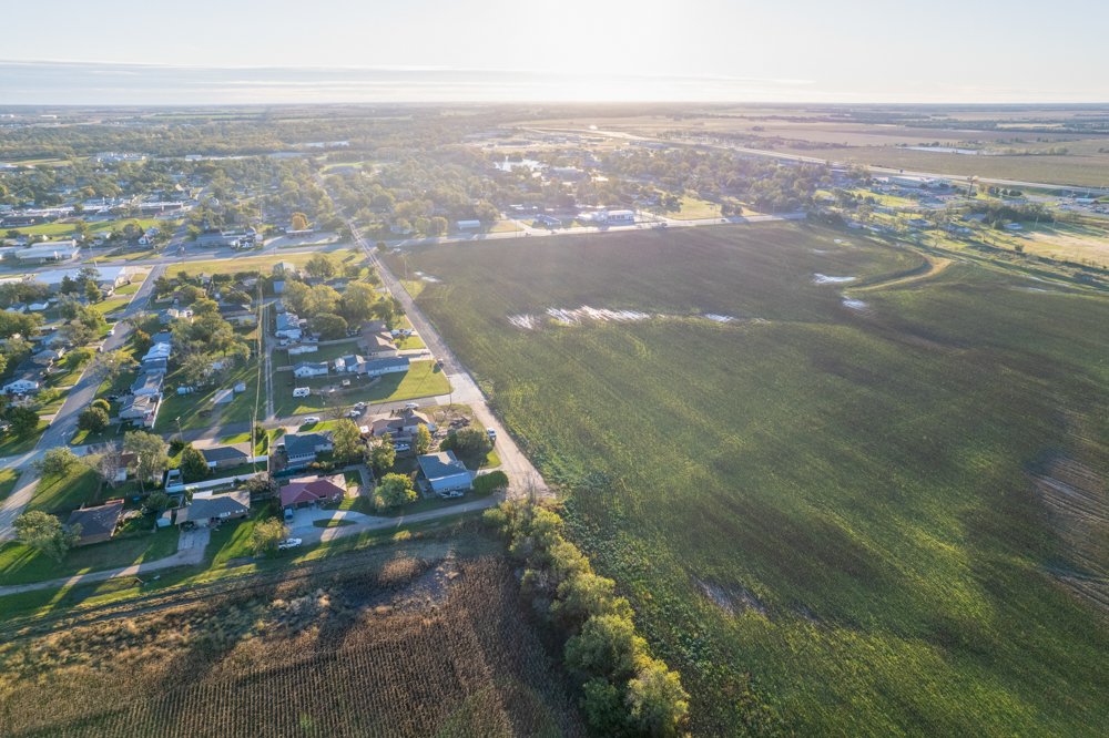 Located along Main Street in the town of South Hutchinson sits this prime development opportunity! The location of the property is ideal and sits at the corner of South Main Street and W Avenue F, just 1/2 mile north of Highway 50 and 96. The east 30.63 +/- acres, which border Main Street and are within the city limits, were once platted and zoned as R-2, two-family residential. The west 37.43 +/- acres are currently zoned agricultural and sit just outside of the city limits.All of the necessary infrastructure needed for high-density development is already in place. An 8" city water line sits south of W Avenue F with fire hydrants in place, and a 12" main water line runs along the east side of Main Street. City sewer runs down the west side of Main Street. Evergy's electric lines run down both roads, as Kansas Gas Service has gas lines located along both roads. There are roughly 24.5 acres (36%) that sit in the 100-year floodplain in the southeastern portion of the property.
